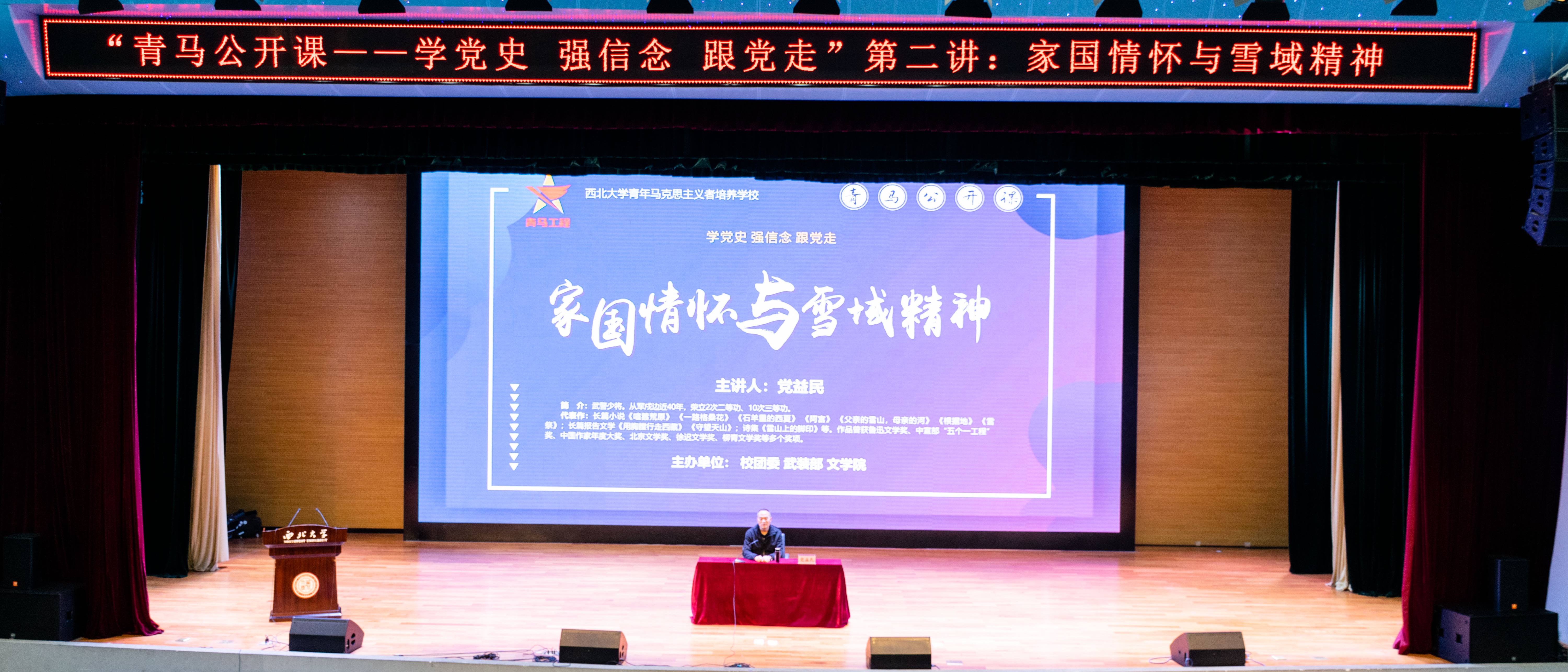 由校团委、武装部和文学院联合举办的“青马公开课——学党史 强信念 跟党走”系列专题讲座第二讲,于4月28日下午在长安校区顺利举行,武警少将党益民以“家国情怀与雪域精神”为题,结合自己文学作品,讲述了新时代中国军人在高原上驻守边疆牺牲奉献的感人事迹。报告由校党委副书记赵作纽主持,校青马第十二期大学生骨干培训班、文学院、武装部、国旗护卫队师生400余人参加了报告。党益民感慨,自己是“业余作家、职业军人”,...