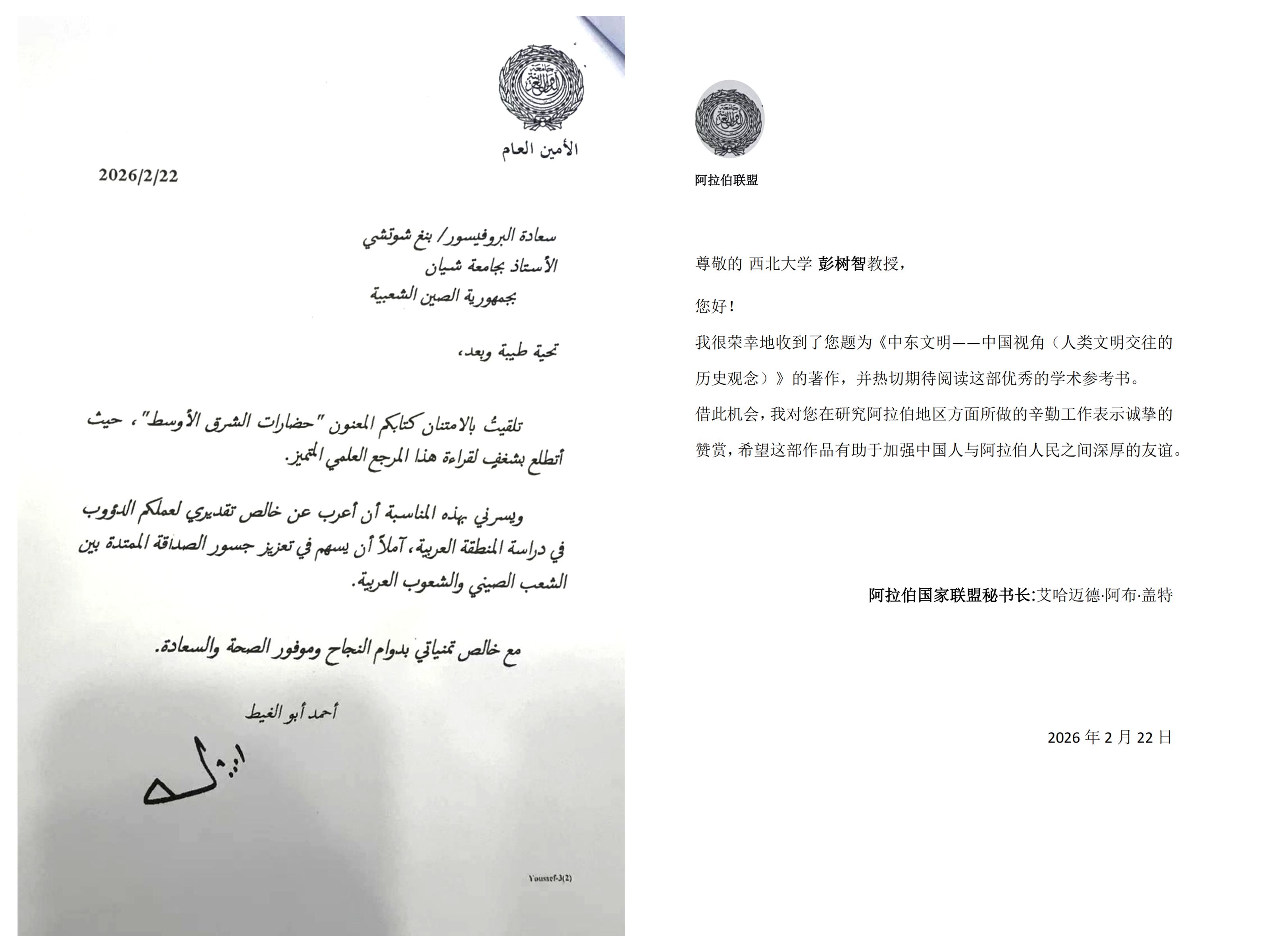 2月22日,阿拉伯国家联盟秘书长盖特致信乐鱼网页版页面登录中东研究所名誉所长彭树智教授。盖特对彭树智教授在阿拉伯地区研究方面做出的辛勤工作表示诚挚的赞赏,希望《中东文明——中国视角(人类文明交往的历史观念)》(阿拉伯语版)有助于加强中国人与阿拉伯人民之间深厚的友谊。2022年,《人类文明交往的历史观念》由乐鱼网页版页面登录出版社出版,系“乐鱼网页版页面登录名师大家学术文库”丛书之一,荣获陕西省第十七次哲学社会科学优秀成果一等奖。彭树智...