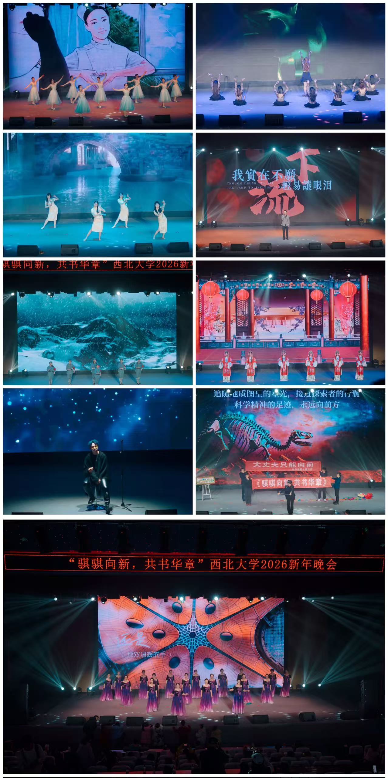 晚会在教职工艺术团与学生艺术团联袂献上的开场舞中启幕,“DIAMONDS”的动感活力与《盛世牡丹》的恢弘大气交相辉映,璀璨的舞姿和夺目的舞台效果,点燃全场热情。整场晚会节目形式多样、内容丰富多彩,高潮迭起。女声独唱《珊瑚颂》悠扬婉转,相声《他就这么个人》以诙谐幽默的方式讲述了辅导员心系学生、倾情奉献的日常点滴,引得台下笑声不断。舞蹈《一条大河》表达对家乡和祖国的深切热爱。附属幼儿园的26位小朋友们身着民族服饰、踏着稚嫩而自信的步伐带来走秀节目《丝路童梦》,展现了丝绸之路上的文化交融之美。器乐合奏《丹雀静影》巧妙融合传统民乐与现代编曲,意境幽远。歌曲《公路之歌》节奏铿锵,激励人直面挑战、勇敢追梦。第一医院带来的舞蹈《如愿》别具匠心,将急诊室紧张的抢救场景艺术化地融入舞蹈,诠释了医护人员守护生命的赤诚与担当。拉丁舞“LOVE”热情奔放,古典舞《外婆桥》温婉灵动,男声独唱《流浪记》深情动人,京剧《娄山关》气势磅礴,秦腔《五典坡·飘彩》韵味醇厚,流行歌曲联唱则燃动全场。压轴节目魔术《恐龙史话》由乐鱼网页版页面登录老校长、中国古脊椎动物学的开拓者和奠基人杨钟健先生的曾孙女与侄女联袂表演,通过深情的演讲和奇幻的魔术手法,生动再现了杨钟健先生的科学探索精神与杰出成就,创意十足、妙趣横生,将晚会推向高潮。