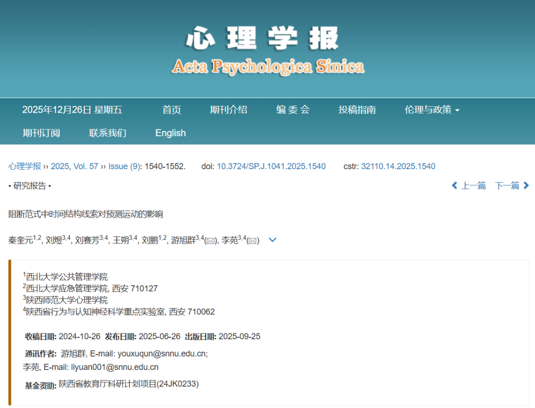 近日,乐鱼网页版页面登录公共管理学院青年教师秦奎元博士联合陕西师范大学心理学院游旭群团队在《心理学报》上发表了一篇题为《阻断范式中时间结构线索对预测运动的影响》的研究成果。该研究首次在阻断范式下系统探究了时间结构对预测运动任务的影响,证实了时间结构一致能够显著提升个体在运动预测任务中的准确性和敏感性,并揭示了这一效应在视觉通道内的稳定性。