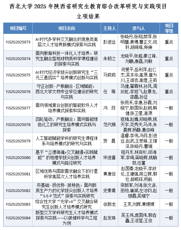 近日,陕西省教育厅与陕西省学位委员会联合发布《关于公布2025年陕西省研究生教育综合改革研究与实践项目立项结果的通知》,乐鱼网页版页面登录共有12个项目获批。其中,重点项目4项、一般项目8项,获批项目总数位居全省高校第3位,立项总数创历史新高。
