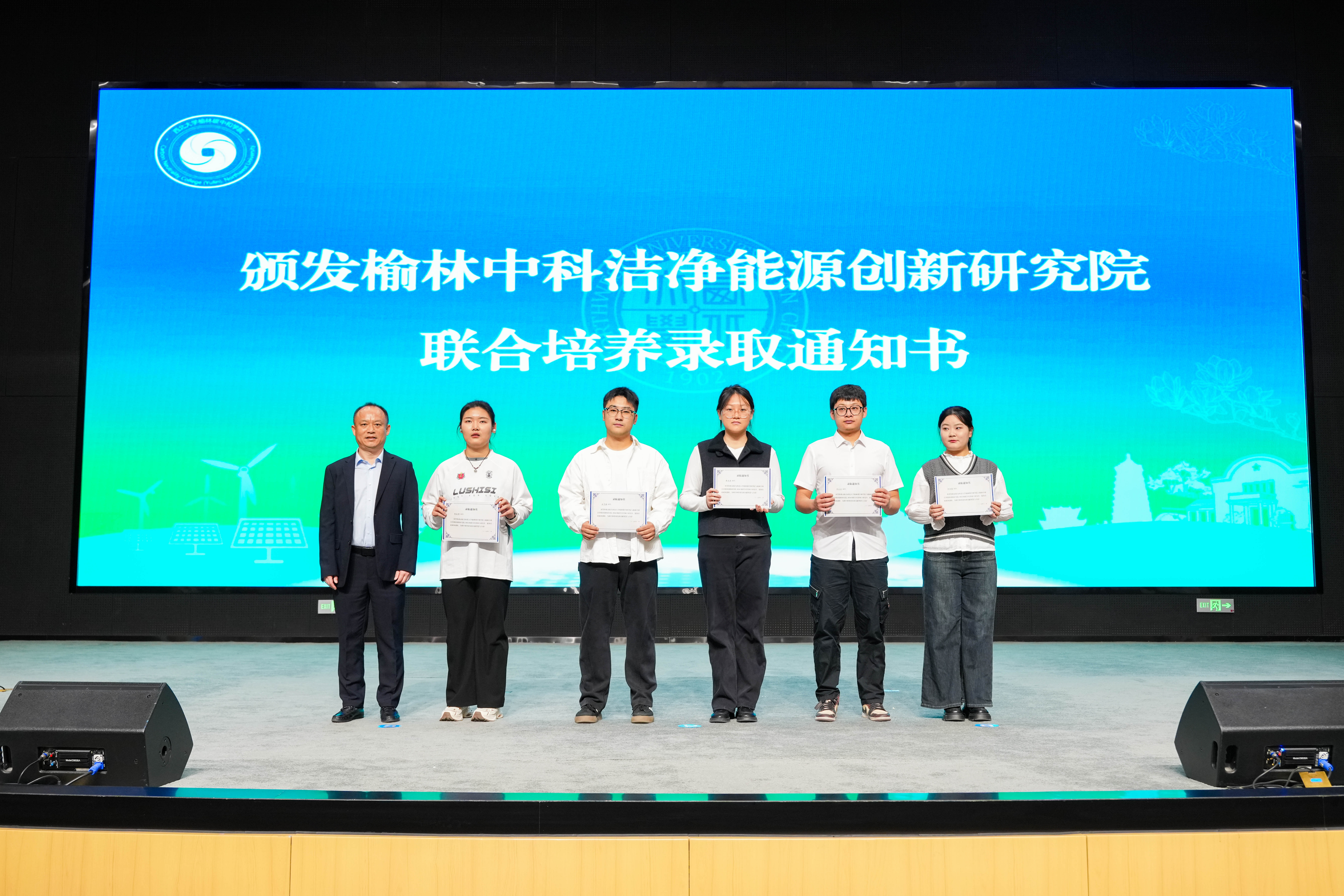 榆林创新院院长助理张箭为碳中和学院在创新院联合培养的5名研究生颁发联培录取通知书。