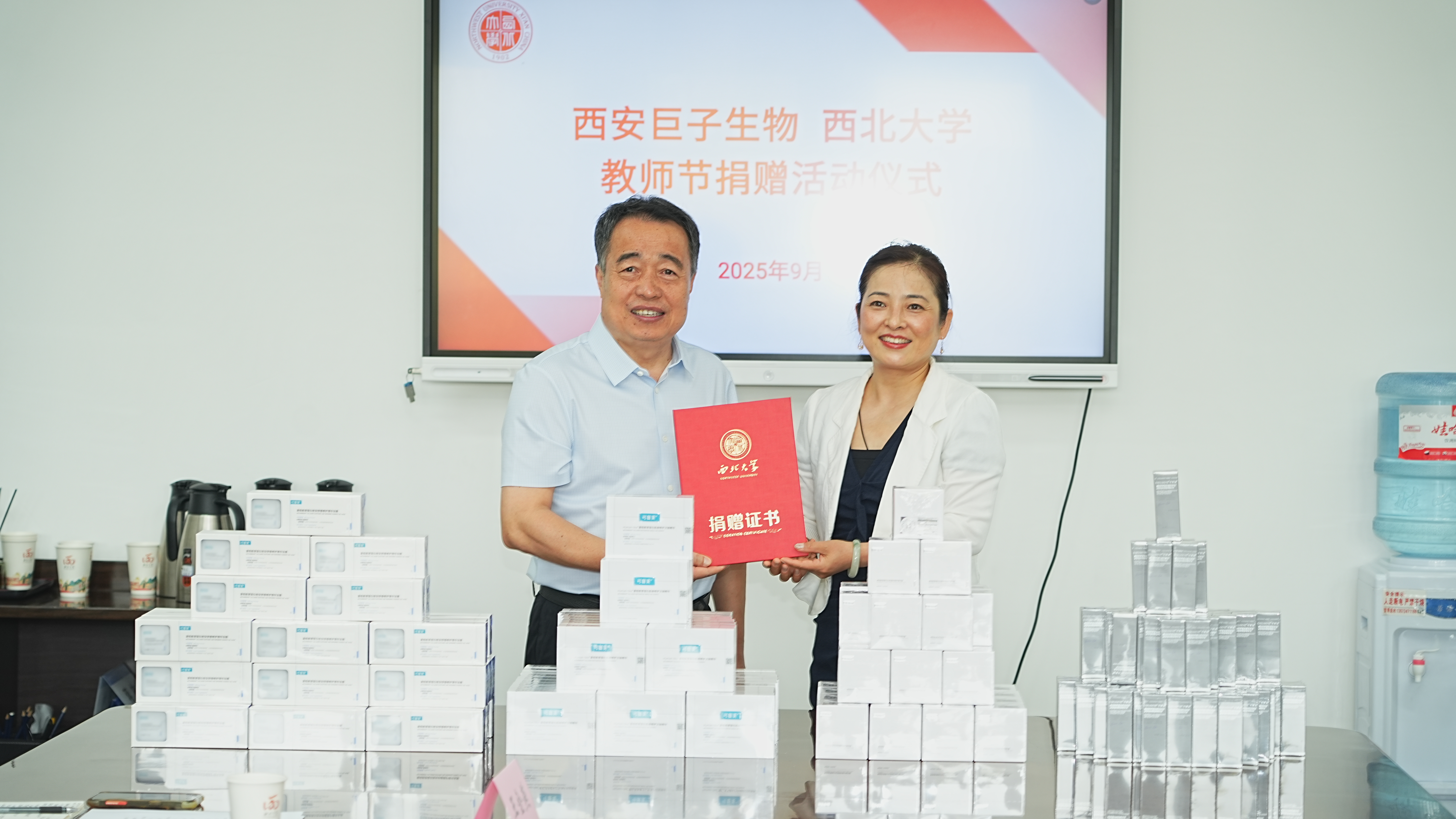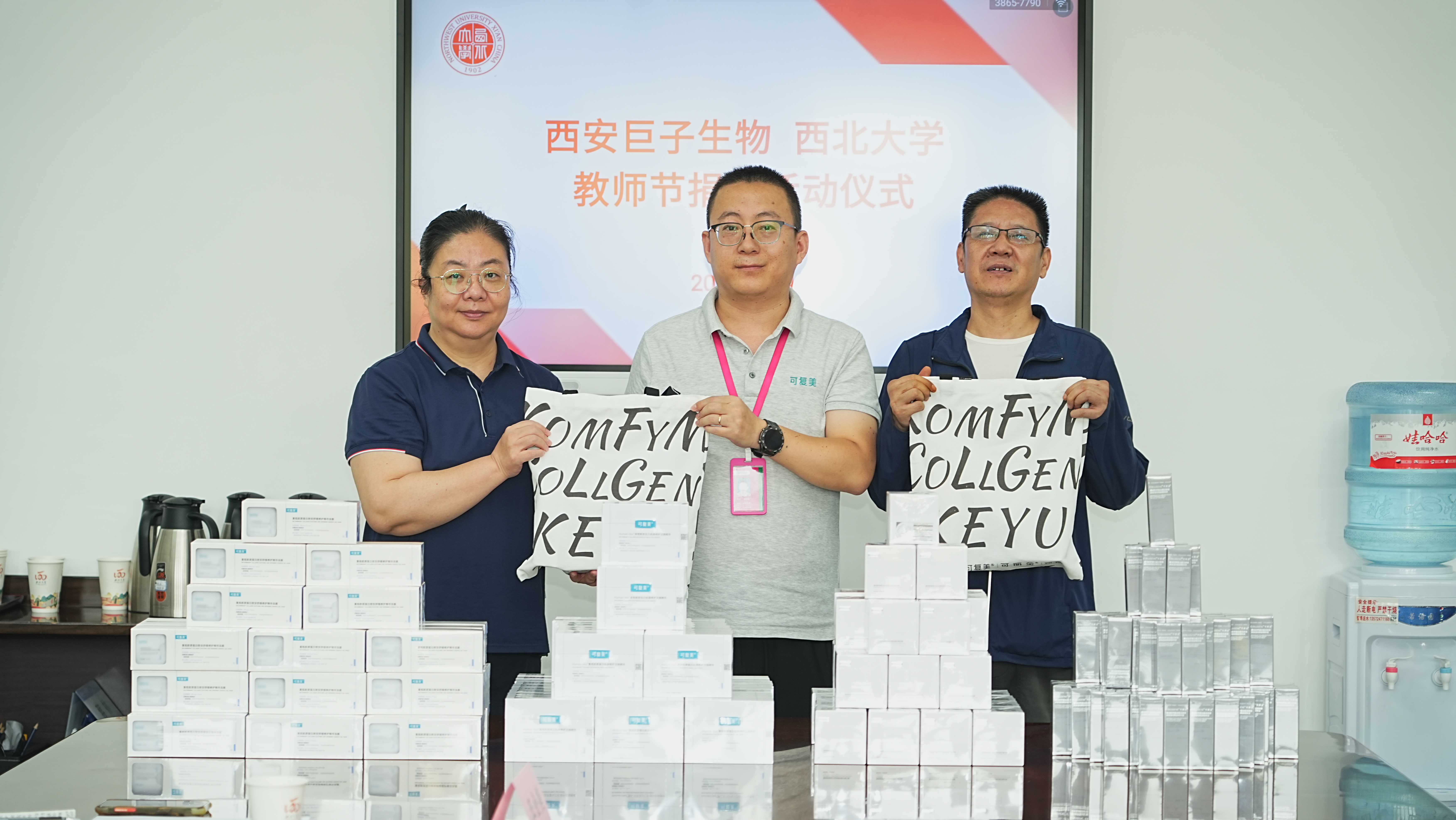 9月9日上午,在第41个教师节来临之际,乐鱼网页版页面登录校友企业向学校捐赠可复美、可丽金系列产品,为学校全体教育工作者送来节日祝福与问候。校党委常委、副校长李振海,西安巨子生物基因技术股份有限公司首席财务官张慧娟,西安高新巨子医疗美容诊所院长王艳,西安巨子生物基因技术股份有限公司人事行政主管霍宝玉,国内处、校工会、离退休处负责人参加仪式。