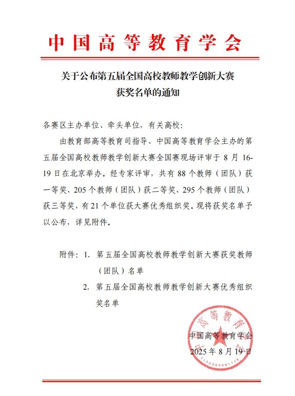 此次全国高校教师教学创新大赛由教育部高等教育司指导、中国高等教育学会主办,于2025年3月正式启动,以“推动教学创新,培养一流人才”为主题,紧扣教育强国建设目标,深入推动高等教育教学改革,精心打造高校教师教学创新与交流的平台。大赛共设立32个赛区,覆盖14个学科门类,1308所高校的127064名教师参与。经过校赛、省赛选拔,最终588门课程的2253位教师入围全国赛。