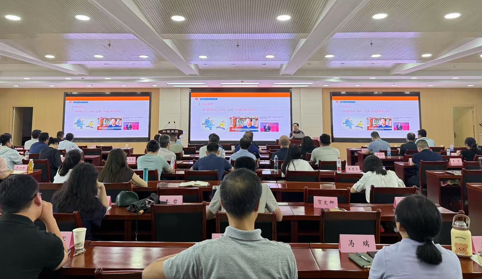 本次培训历时一天,邀请校内外专家作了3场专题报告。陕西省信访局党组成员、正厅级信访督查专员于华安作了“深入推进信访工作法治化,全面构建新时代信访工作新格局”专题报告;西安市信访局副局长、二级巡视员宋丰收作了“信访突出案例解析及处理方法和技巧”专题报告;乐鱼网页版页面登录新闻学院教授、中国公共关系学会常务理事来向武作了“全媒体背景下网络公共事件传播规律与舆论引导”专题报告。学员们表示本次培训安排紧凑,在提高认识水平、增长实践本领方面发挥了积极作用,达到了预期效果。