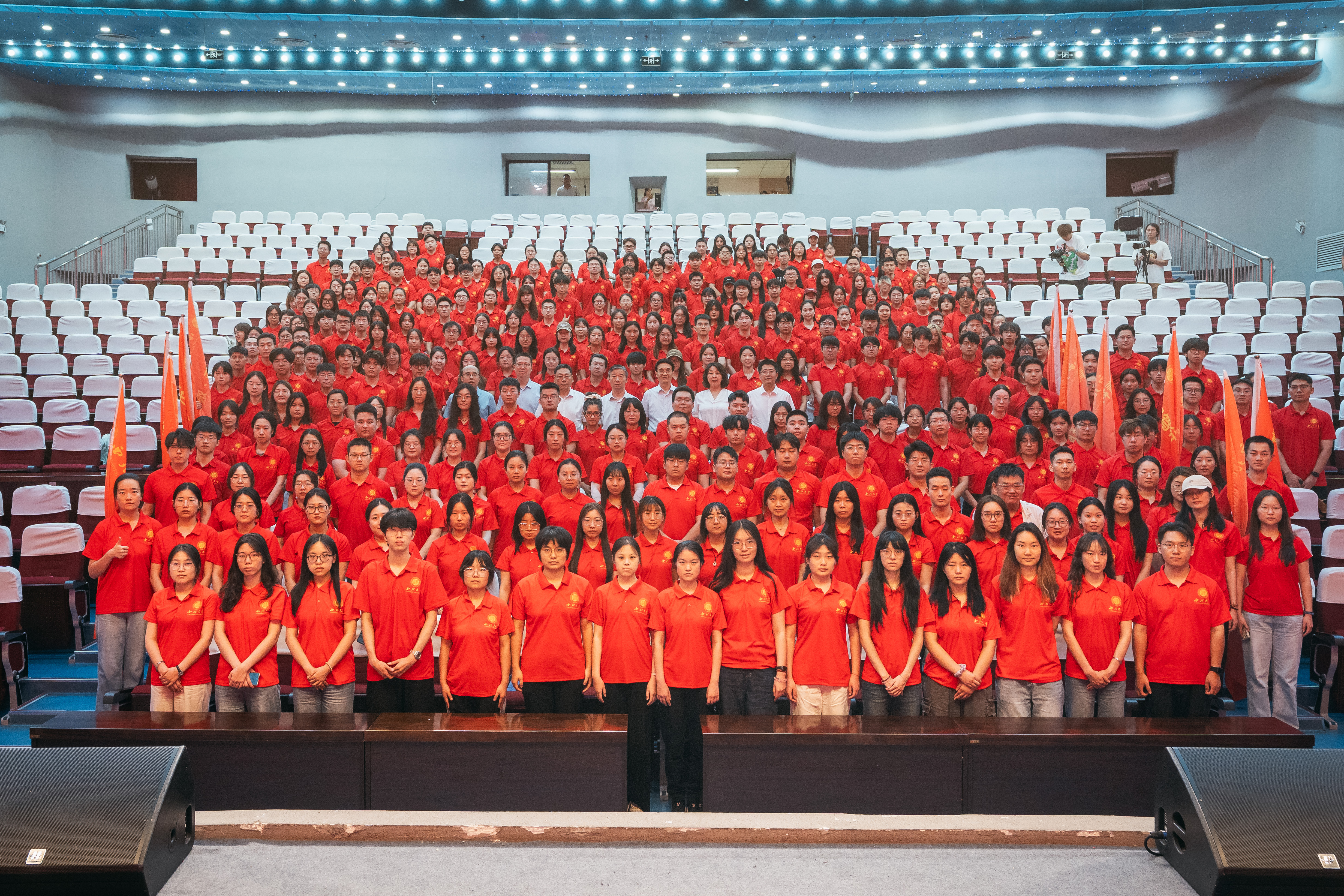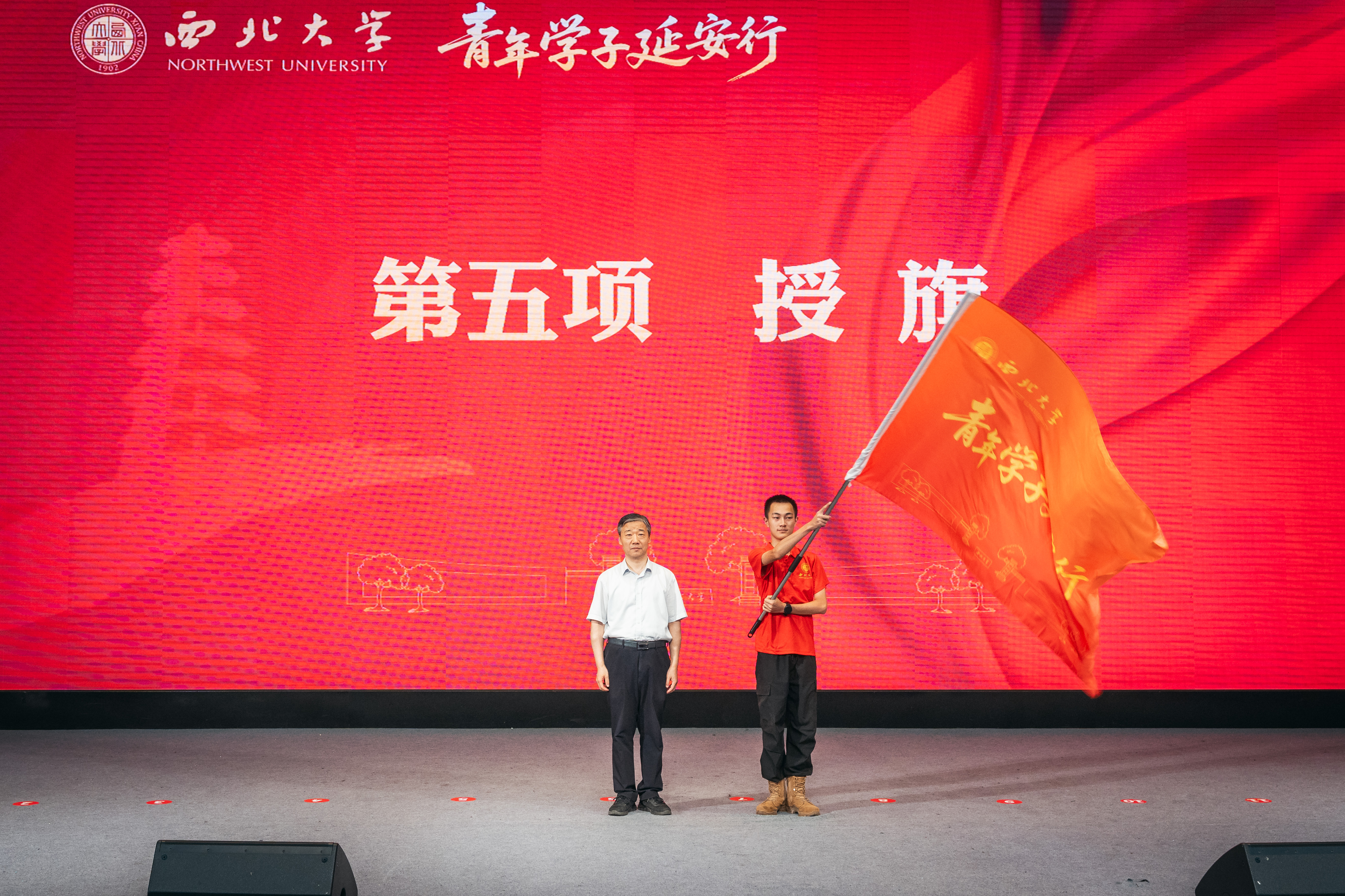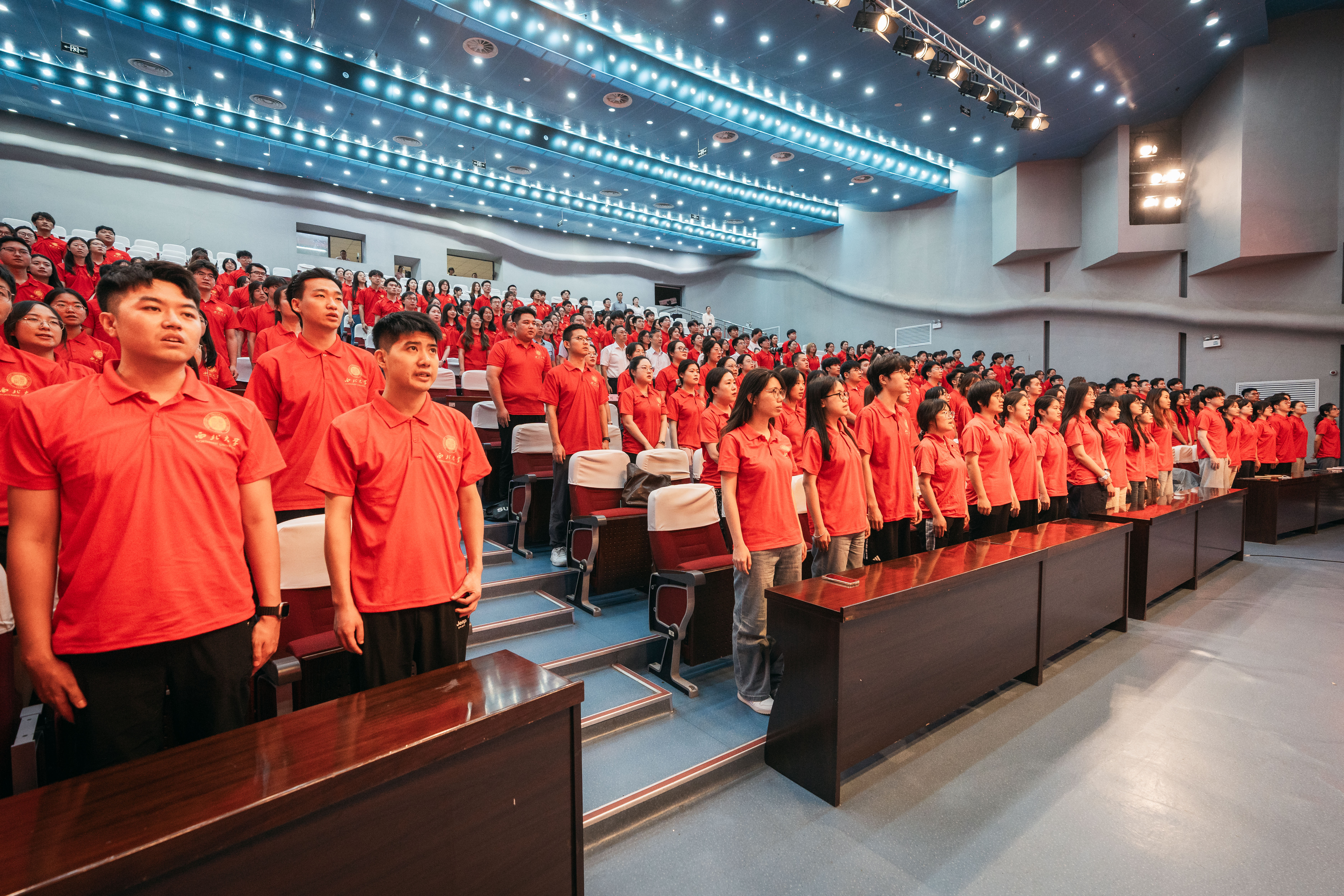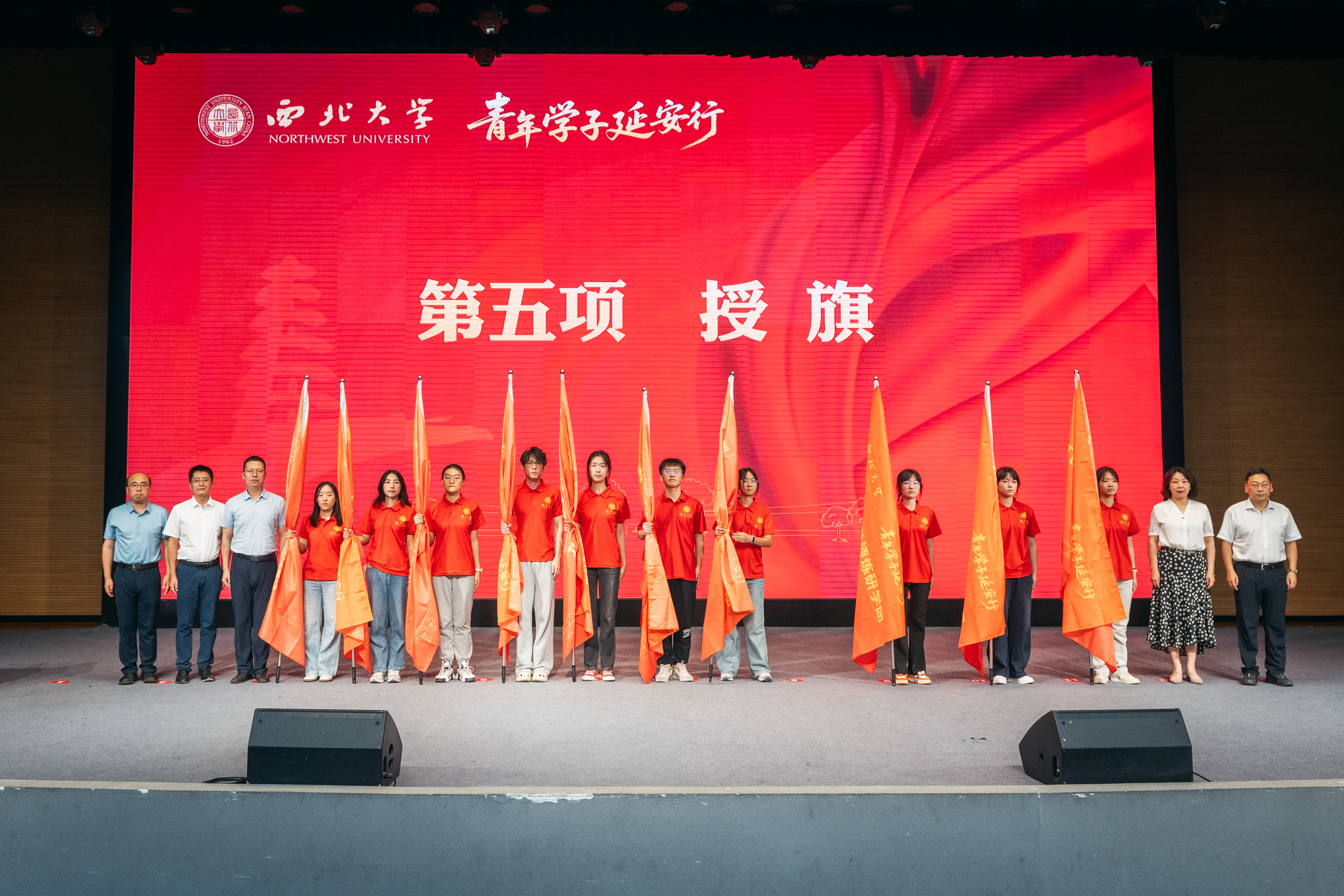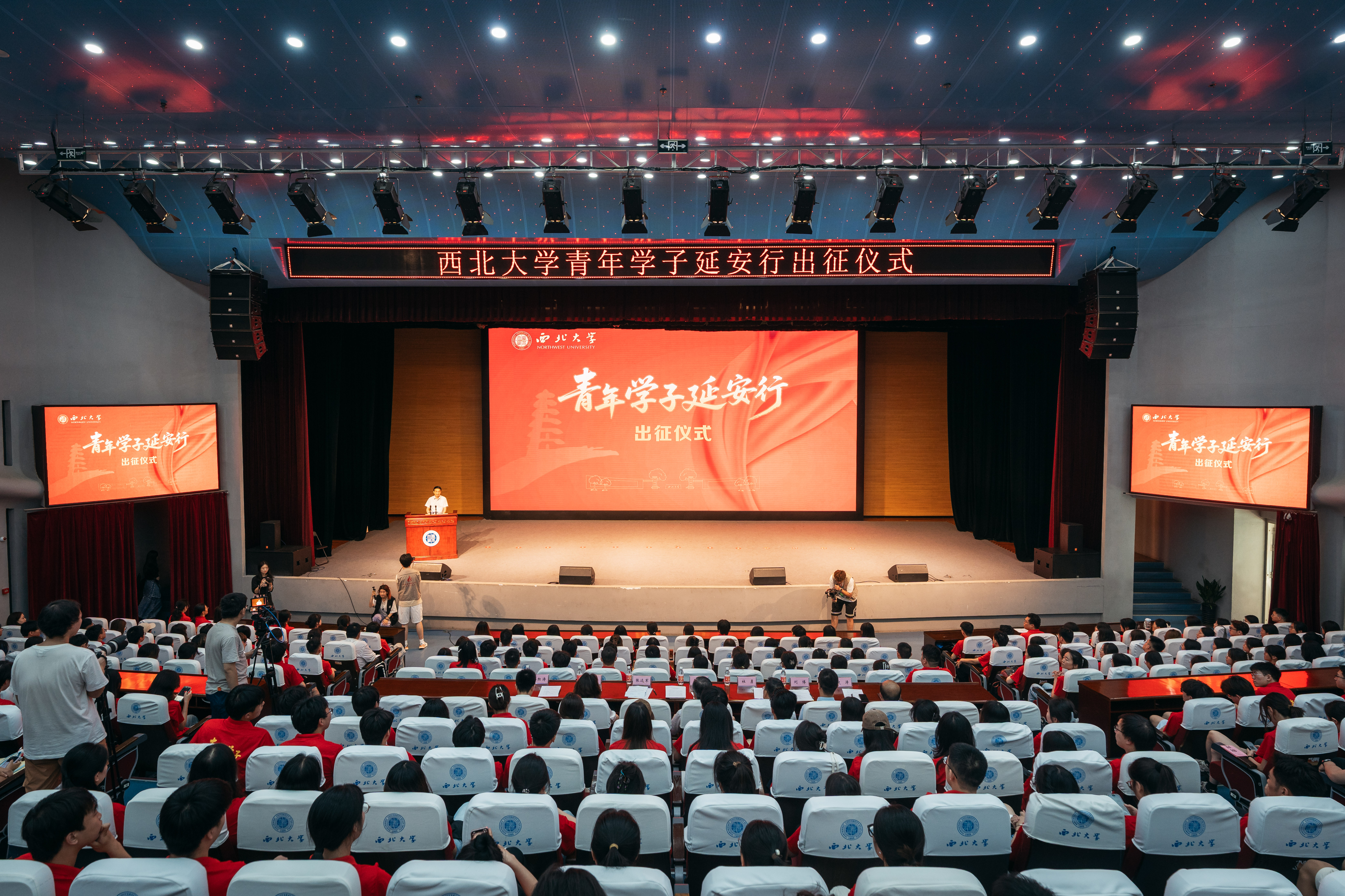 仪式在庄严的国歌声中拉开序幕。会场里,即将奔赴延安的西大学子统一穿着红色文化衫,整齐就座,现场氛围庄重又热烈。
