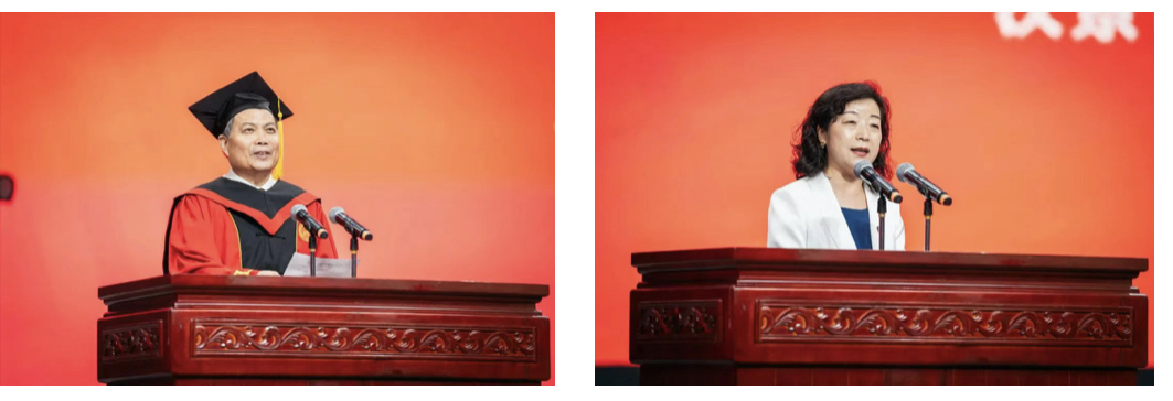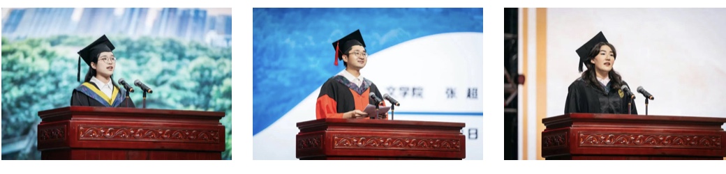 毕业生代表食品科学与工程学院本科生鲁思敏、文学院博士研究生张超、留学生代表艾小情在发言中饱含深情地回望求知旅程,抒发对母校及师长的由衷谢意和惜别之情。