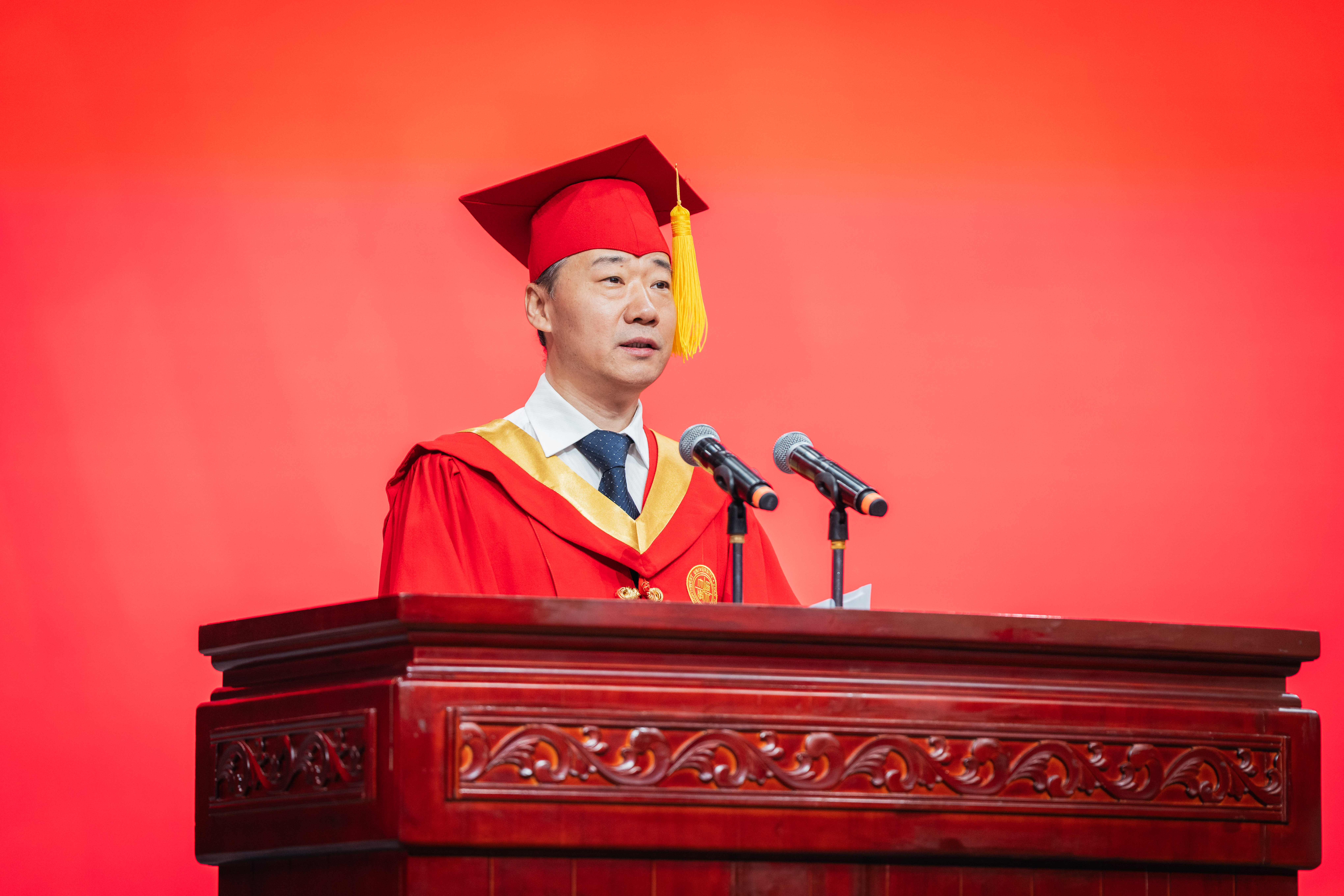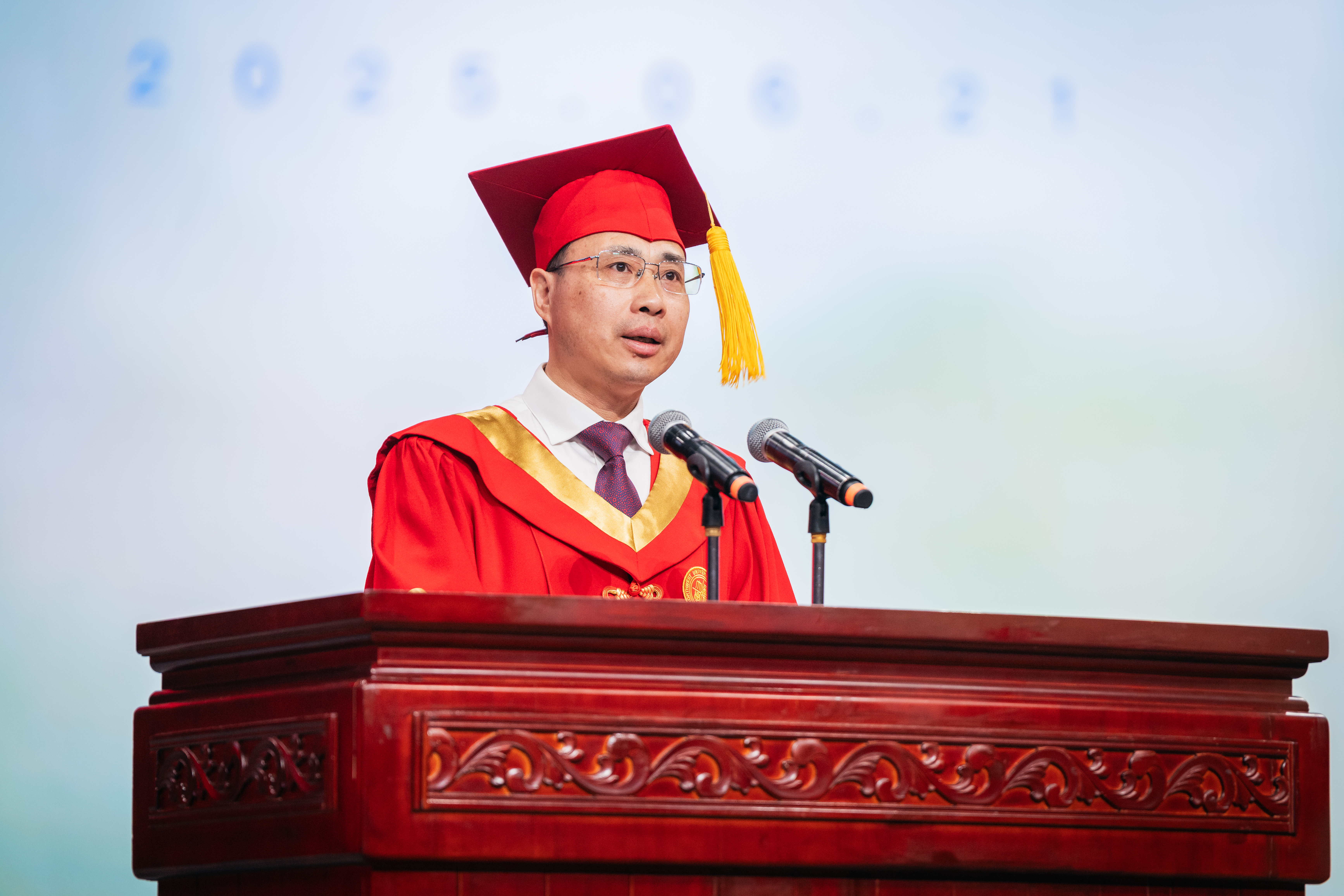 孙庆伟校长以“于‘变’中启程,赴精彩人生”为主题,为毕业生送上深情寄语和真挚祝福。他嘱咐同学们,面对即将开启的人生旅程,每个人都要向着心之所向,奔赴属于自己的远方。要以侯外庐先生、张彦仲院士等西大先贤为榜样,把每个“当下”活成生命中的“实心日子”,让小我的微光汇入大时代的星河,带着生长的本能向阳而生,为国家民族作出应有贡献。他期望同学们深刻体悟“明者因时而变,智者随事而制”所蕴藏的深刻哲理,以“穷则变、变则通、通则久”的生命觉醒,主动应变、顺势而为,充分激发内驱力和创造力,致广大而尽精微,奔赴人生精彩。他向毕业生赠与三条“变”的心法。一是从势而变,以目及山河的格局把视野从“笔尖方圆”抬向“时代经纬”。他指出,大学之大就在于学科能为国家主权立据、为文明对话搭桥,在社会发展的痛点、难点中找到学术的支点。希望同学们对人类文明保有更多温情与敬意,坚守“学风当绍横渠之大,文化求复汉唐之隆”的风骨和格局,把人生选择放进“科技强国”“文化传承”的坐标系,充分彰显人生的独特价值。二是从新而变,以拓新破界的勇气让理想从“云端构想”落向“实地深耕”。他强调,真正的创新从来不是“空中楼阁”,而是像地质勘探般“扎根大地”。希望同学们保持持续的自我超越与思维范式更迭,让创新更有厚度、韧性和分量,在实践中为国家发展、文明赓续贡献力量。三是从心而变,以心纳江海的定力让胸怀从“容纳自我”通向“兼济万物”。他指出,“小”从来不是局限,而是“大生命”的起点,“无力感”从来不是终点,而是“生长力”的序章。希望同学们突破“想太多、做太少”的自我拉扯,保持内心定力,在不断积累中实现厚积薄发。他深情送别毕业生:毕业不是告别,而是人生的“再出发”。祝愿同学们在母校每一个“小”的瞬间,都成为书写人生新页的注脚;每一次“变”的觉醒,都化作奔赴精彩人生的星火。