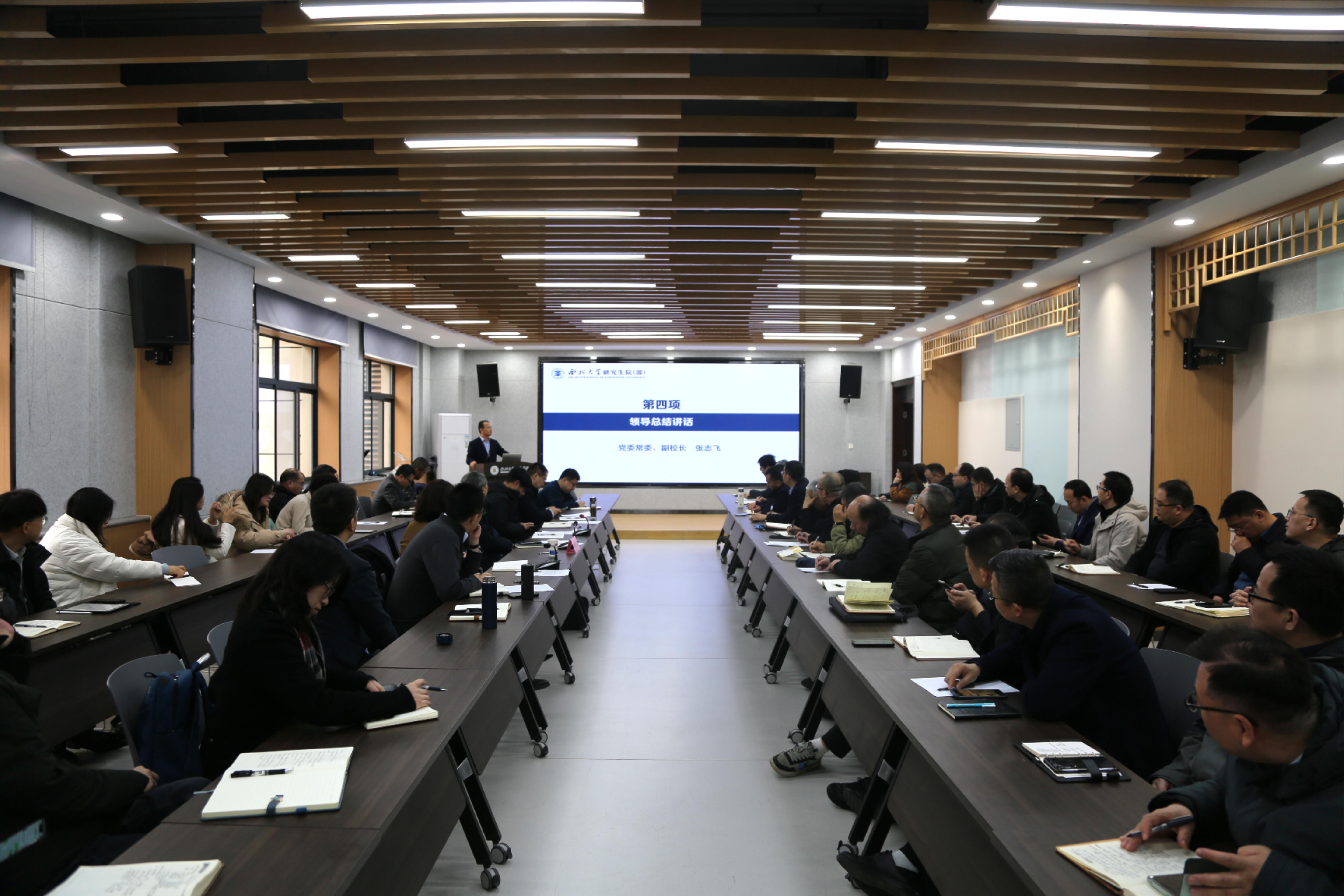 研究生院负责人通报了上学期研究生教育重点事项的进展情况,并对2025年学校研究生教育工作要点进行了说明。他从确保招生录取提质保稳、强化学位点内涵建设、创新培养过程管理、严把学位授予质量等四个方面对本学期重点工作进行了汇报;研工部负责人以“二个目标、三个协同、五学一体”为工作思路,从强化思政引领、夯实基层党建、完善管理服务、优化奖助机制、强化学术实践等五个方面对本学期重点工作进行了汇报。