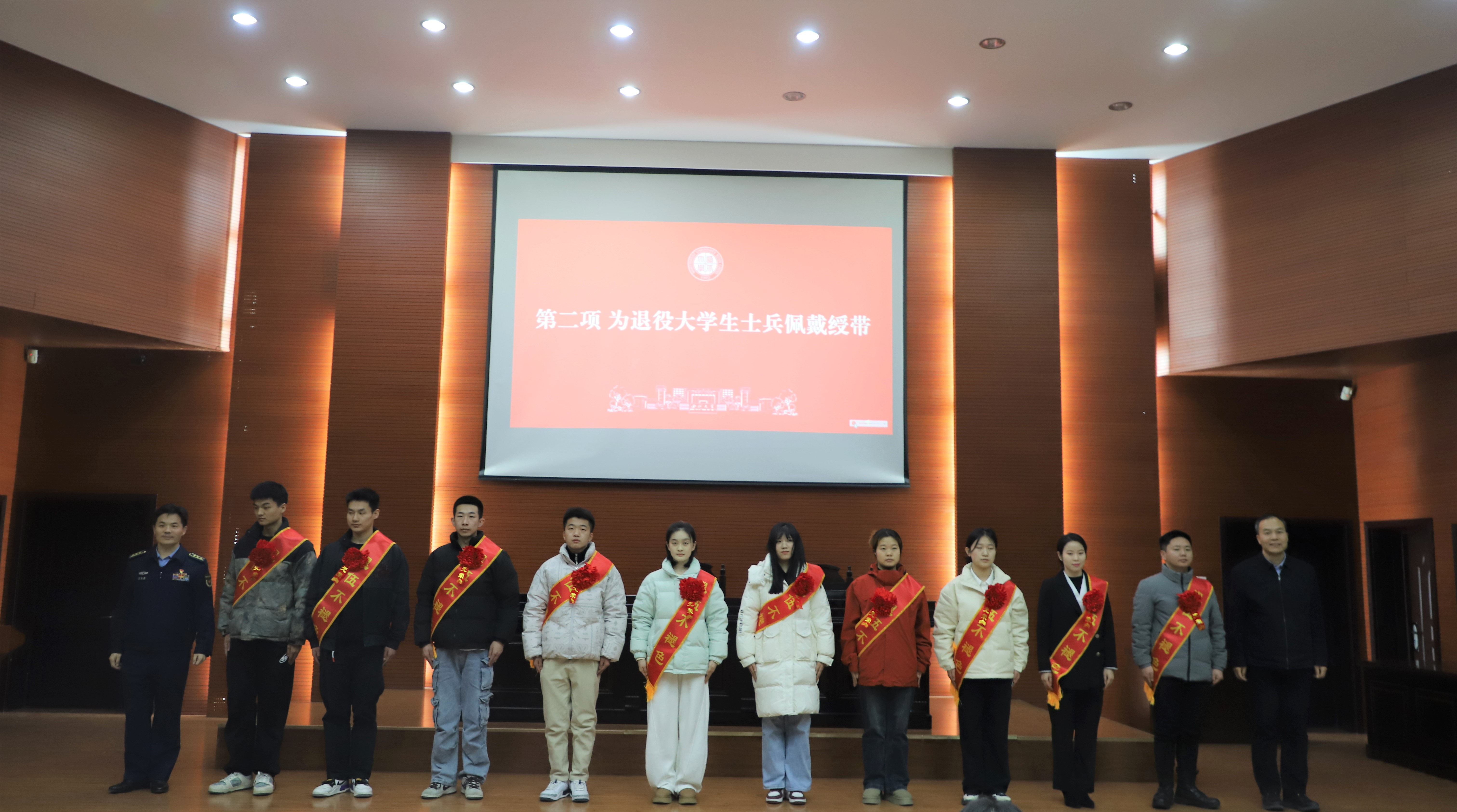 吕建荣、王茂生共同为学校10名退役大学生士兵代表佩戴了绶带。寇军红作了碑林区2025年征兵宣讲。新闻传播学院的退役大学生士兵耿天蓝作了征兵分享。