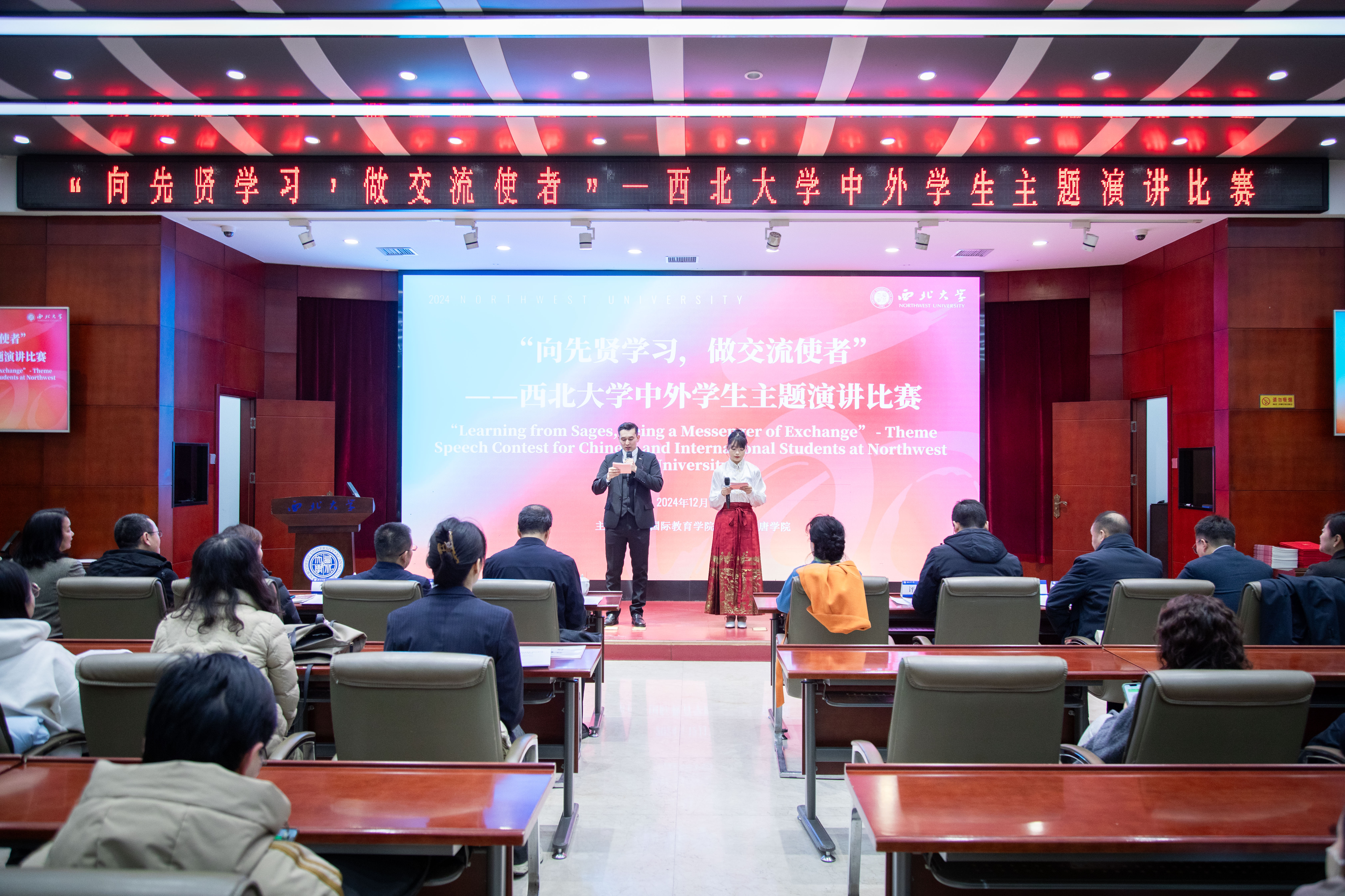 12月14日晚,“向先贤学习,做交流使者”乐鱼网页版页面登录中外学生主题演讲比赛在太白校区举行。本次大赛旨在增进不同文化背景学生之间的相互了解与沟通,提高国际学生的中文水平以及中国学生的跨文化交流能力,积极弘扬先贤精神。校党委副书记吕建荣以及各职能处室主要负责人出席本次活动。
