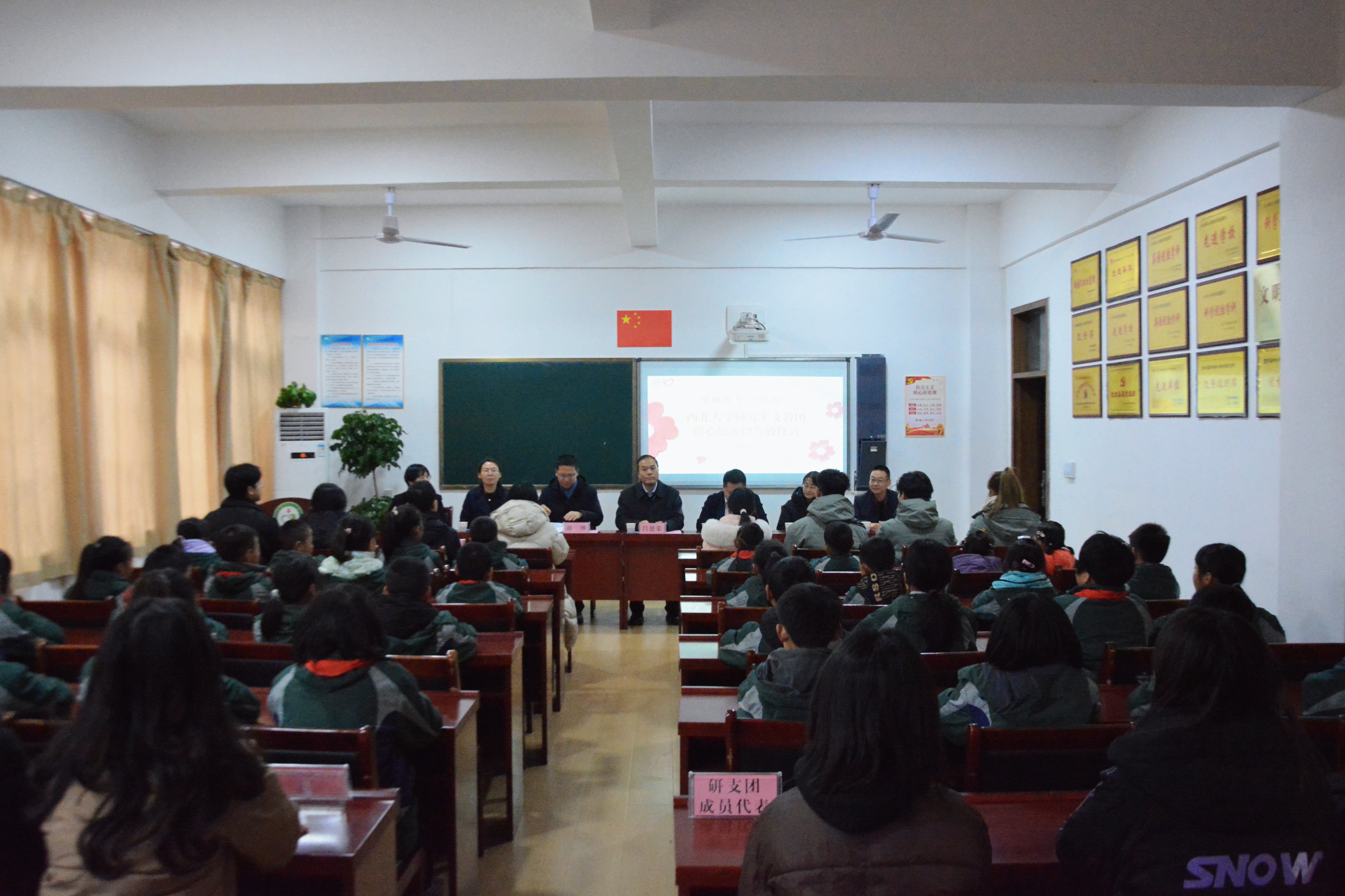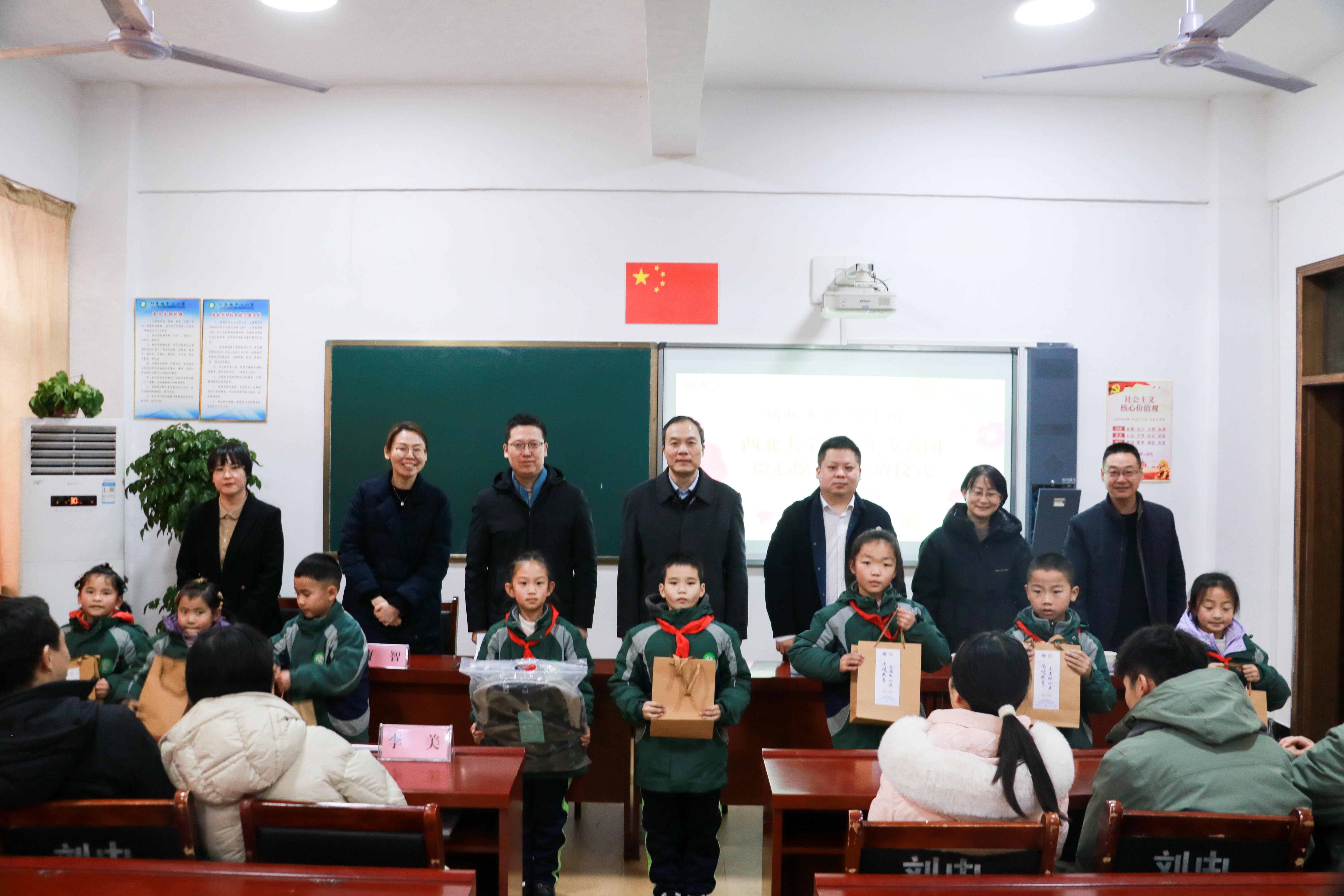 随后,在刘集镇中心小学举行了“情暖寒冬 十年如一”微心愿发放仪式。会上,刘集镇中心小学校长党耀红致欢迎辞,并向西大师生对农村儿童的关心关爱表示感谢。校团委负责人介绍了研支团项目和微心愿活动。与会领导为孩子们送上微心愿礼物,吕建荣代表学校向刘集镇中心小学赠送了科学实验包。本次活动共征集了富平县六所学校共计385名孩子的心愿。