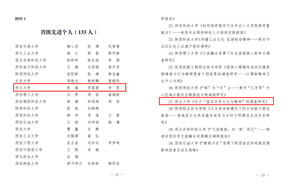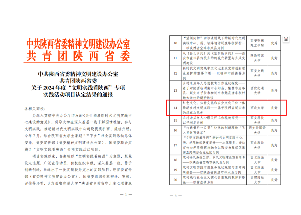 中共陕西省委精神文明建设办公室、共青团陕西省委公布的《关于2024年度“文明实践看陕西”专项实践活动项目认定结果的通报》中,乐鱼网页版页面登录《红色文化、知青文化和农业文化三位一体乐鱼网页版页面登录良好推动乡村文明实践——基于陕西省延安市的观察与思考》项目获得“良好”认定结果。