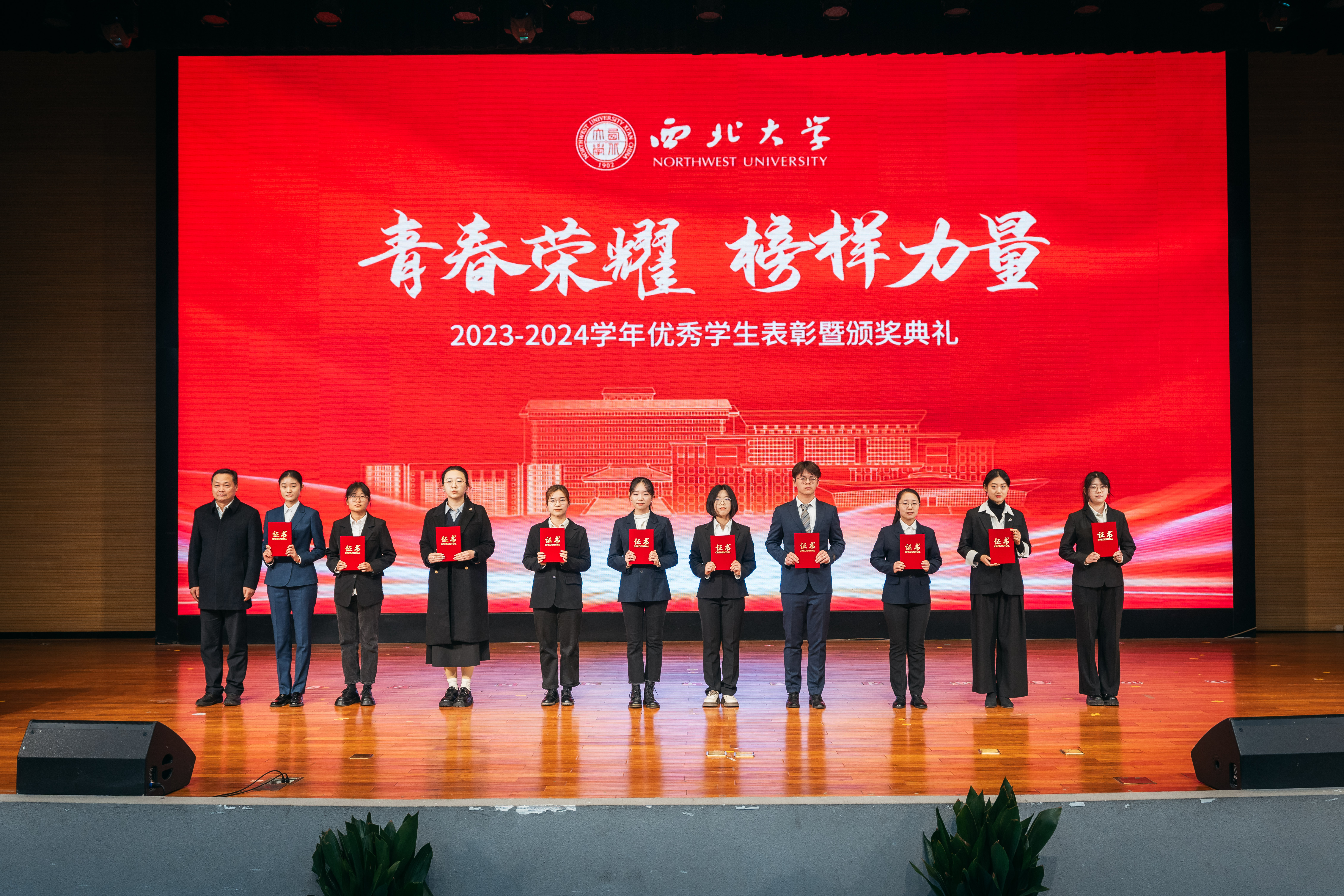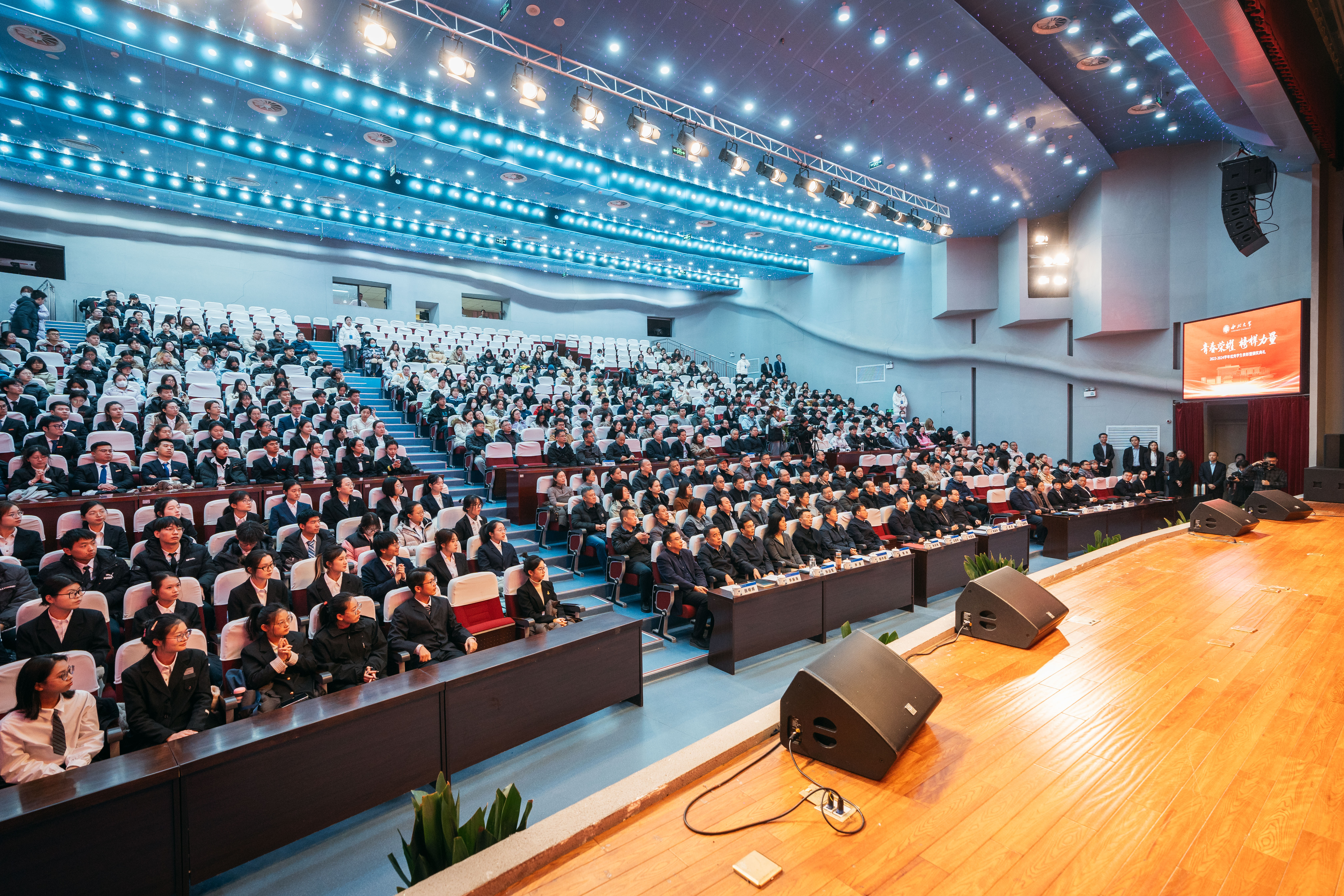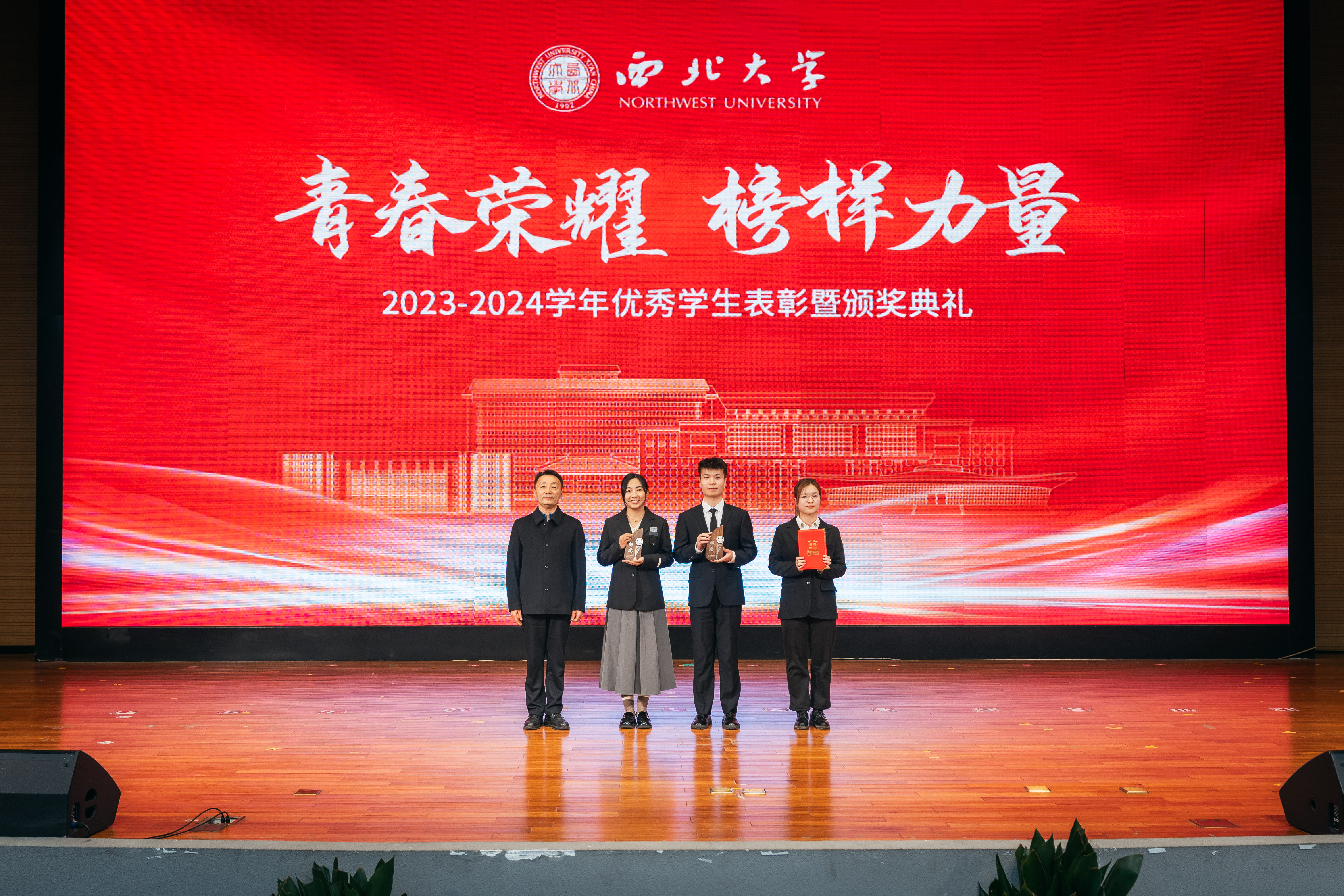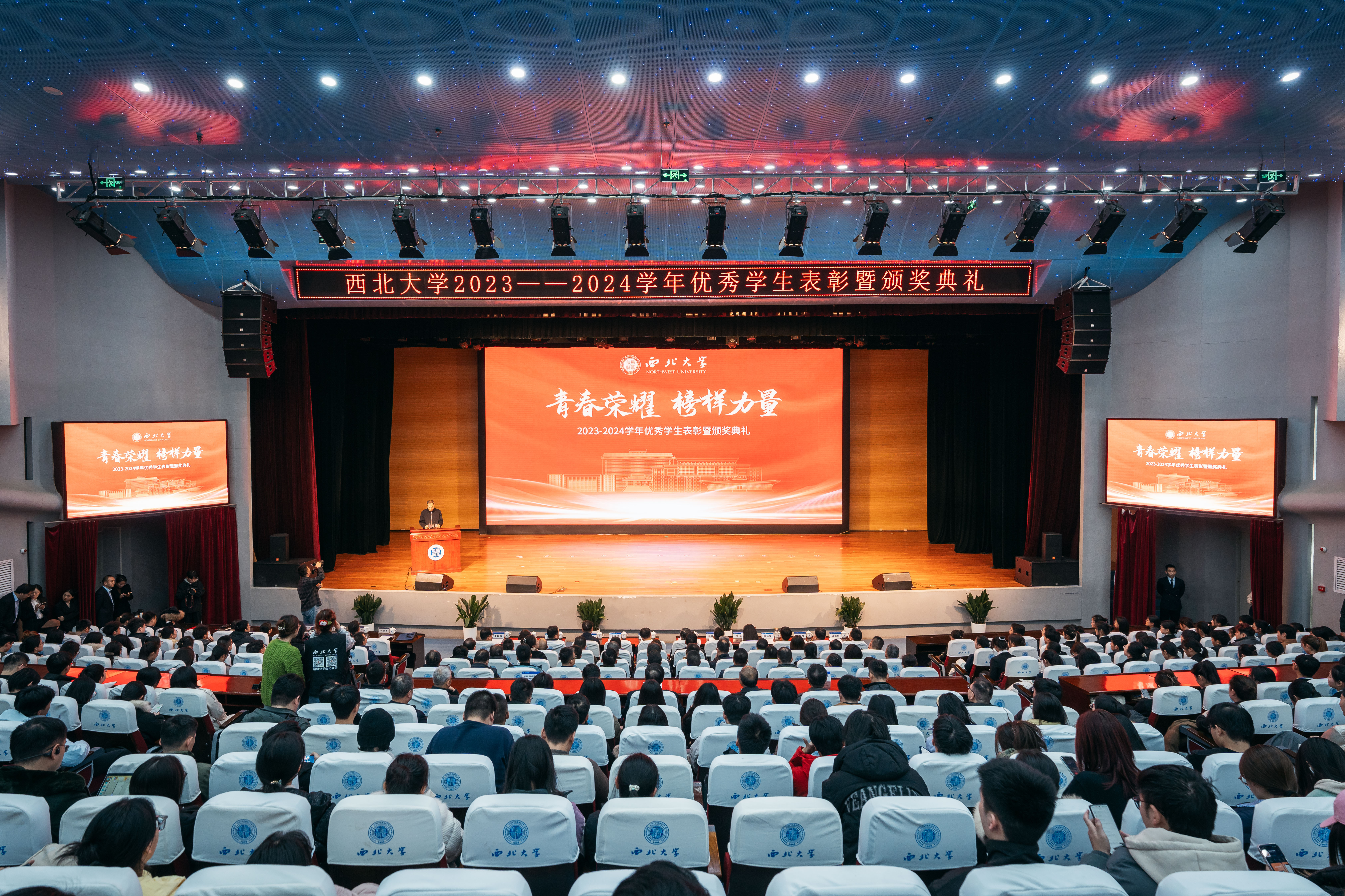12月9日,乐鱼网页版页面登录2023-2024学年优秀学生表彰暨颁奖典礼在长安校区学生活动中心报告厅举行。全体校领导,优秀班主任代表、生命科学学院李忠虎、哲学学院耿艳玲,最美宿管代表王美玲、李平丽,校学生工作领导小组成员单位及相关部门主要负责人,各院(系)党政主要负责人,各院(系)学生工作负责人、辅导员和学生代表500余人参加典礼。活动由校党委副书记吕建荣主持。
