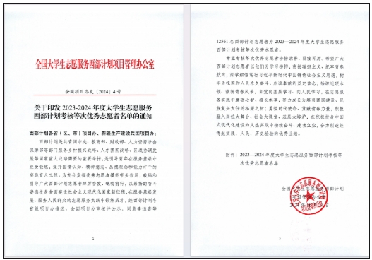 近日,全国大学生志愿服务西部计划项目管理办公室发布《关于印发2023-2024年度大学生志愿服务西部计划考核等次优秀志愿者名单的通知》,乐鱼网页版页面登录刘苗、吴远春、杨乐航、申乔乔、古丽孜牙·沙吾肯别克等5名同学荣获2023-2024年度全国大学生志愿服务西部计划考核等次优秀志愿者。