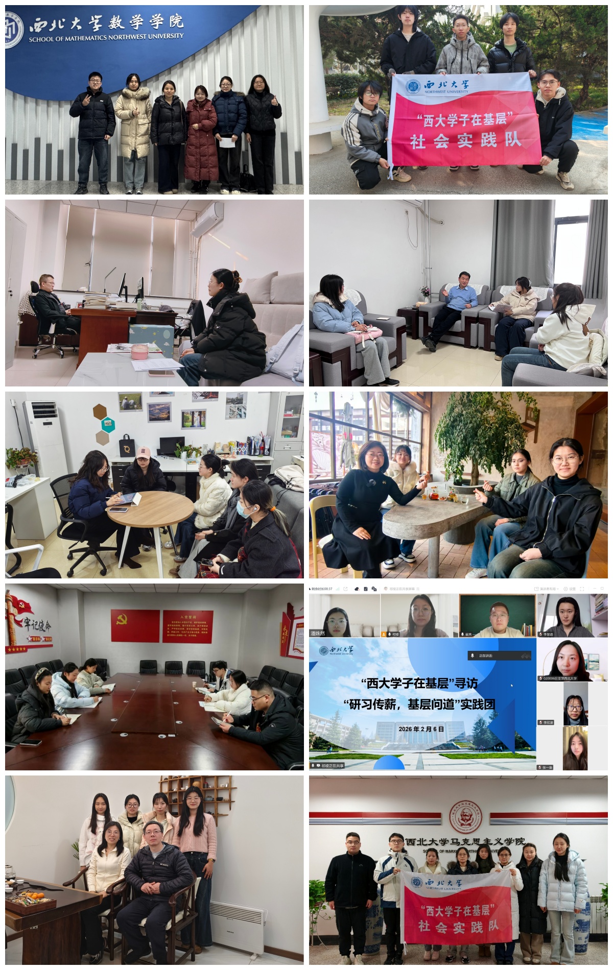 “寻访校友”实践队采访法学、城环学院校友,汲取奋斗力量;“化古访今,薪火相传”校友走访队对话文化遗产学院刘成教授,感受学科交叉与“公诚勤朴”校训内涵;数学学院“西大源聚基层队”寻访五位一线校友,总结基层服务与职业成长智慧;“西大寻迹队”访谈任苗苗教授,领悟治学态度与人生坚守;西大星火寻访队专访基层干部黄昊翔,展现学子扎根基层、用专业技能服务乡村振兴的实干担当。各团队通过访谈交流,梳理校友扎根岗位、服务社会的奋斗历程,让西大精神在薪火相传中持续传承。