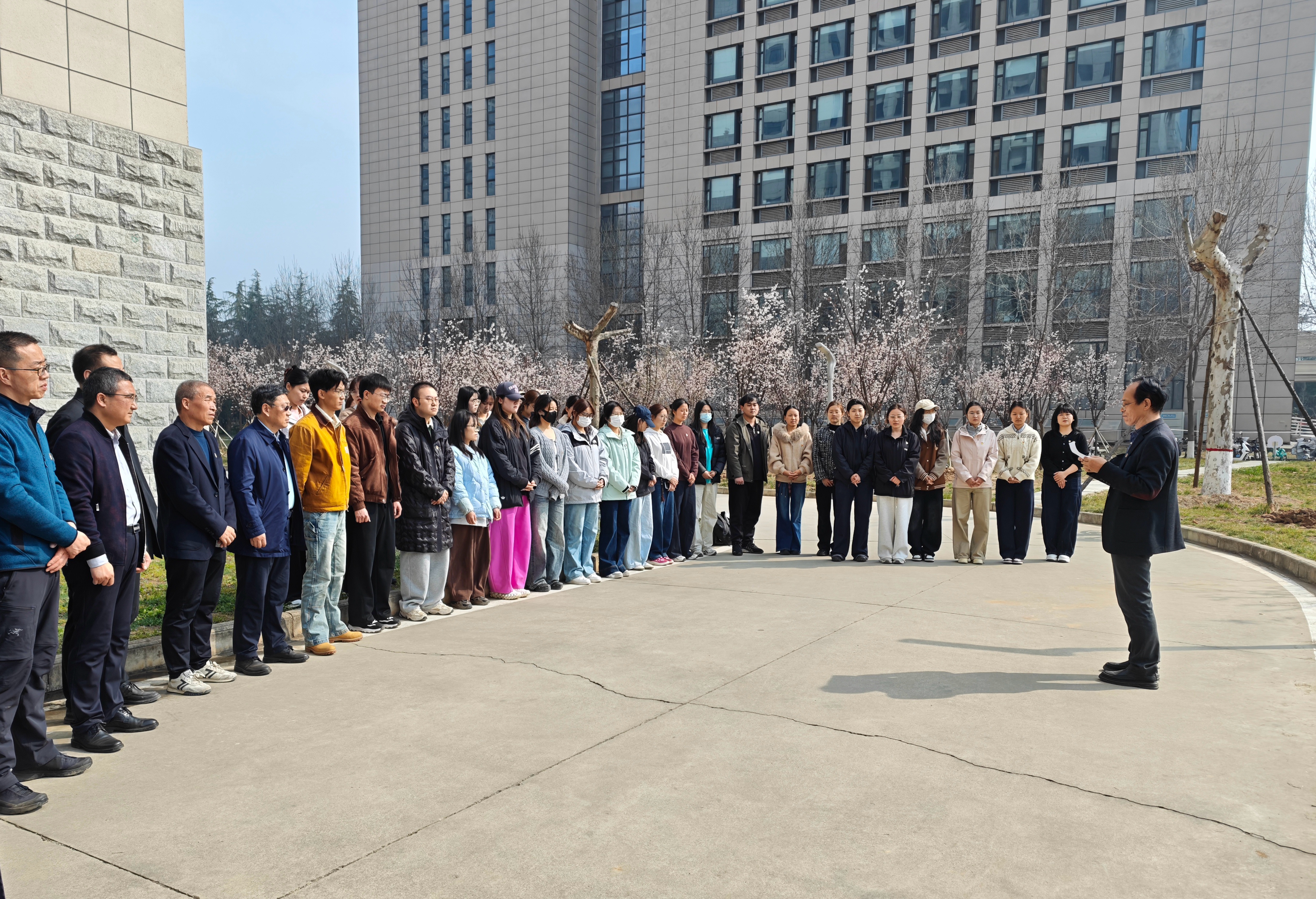 李振海在讲话中指出,此次植树活动是践行绿色发展理念、推动“党建引领+劳动育人”的生动实践,通过师生共同参与养护,将校园绿地变成劳动教育“活课堂”,实现“植一片绿、育一群人”的实效。他指出,要以习近平新时代中国特色社会主义思想为指引,将绿色发展理念内化于心,筑牢思想根基;要以劳动实践为抓手,在出力流汗中磨砺意志,养成勤勉自律的良好作风;要坚持健康第一,将体育与劳动结合,在强健体魄的同时锤炼坚韧意志。最后,他勉励大家在植绿护绿中锤炼党性,在劳动实践中增长才干,以更加昂扬的姿态、更加扎实的作风,为学校高质量发展注入思想动力、凝聚行动共识。