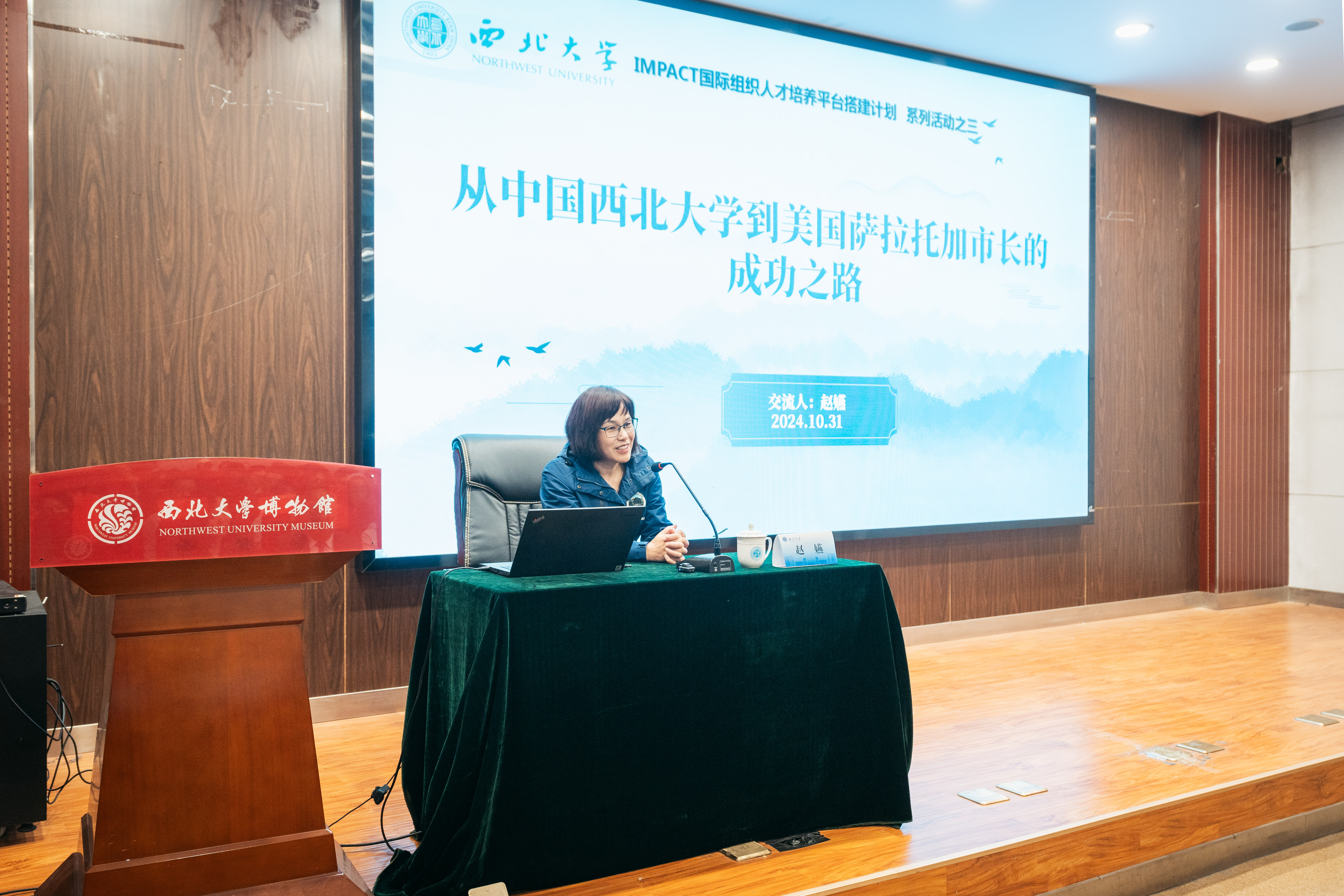 随后,赵嬿为师生代表作了题为“从中国乐鱼网页版页面登录到美国萨拉托加市市长的成功之路”的交流分享会,该环节由曹蓉主持。分享会中,赵嬿详细回顾了自己从乐鱼网页版页面登录求学,到美国留学深造,再到投身美国半导体行业,并最终步入政坛的非凡历程。她以自身的丰富经历为切入点,鼓励同学们在人生最好的这段时光中,勇于尝试新事物、接受新挑战。在互动环节,她勉励同学们,在规划人生的同时,也要保持强健的体魄,不为人生设限,不断挖掘自身潜力。同时,她希望年轻学生们能够结合自身专业及特长,拓宽国际视野,提升跨文化沟通能力,积极参与国际交流合作。随后,赵嬿一行参观乐鱼网页版页面登录博物馆丝绸之路考古馆、《东方智慧·长安人》岳钰佛教美术馆及生活记忆馆。