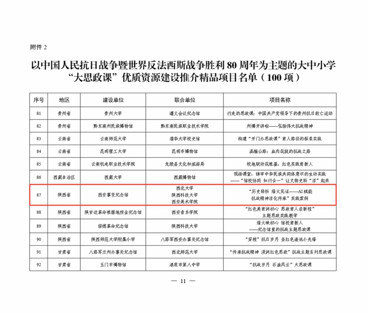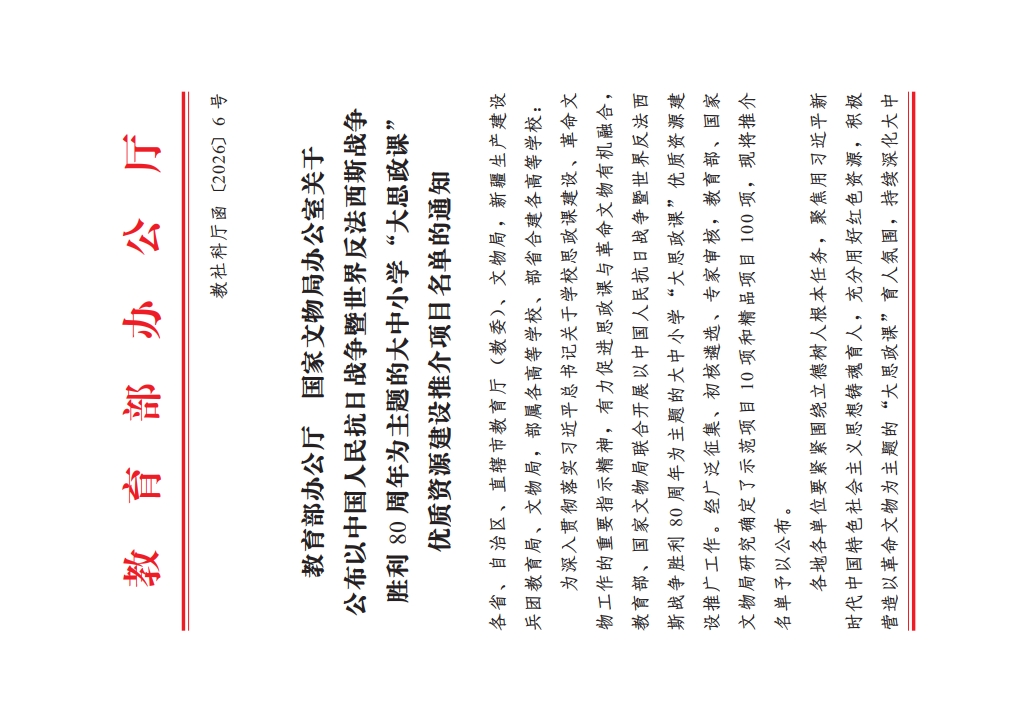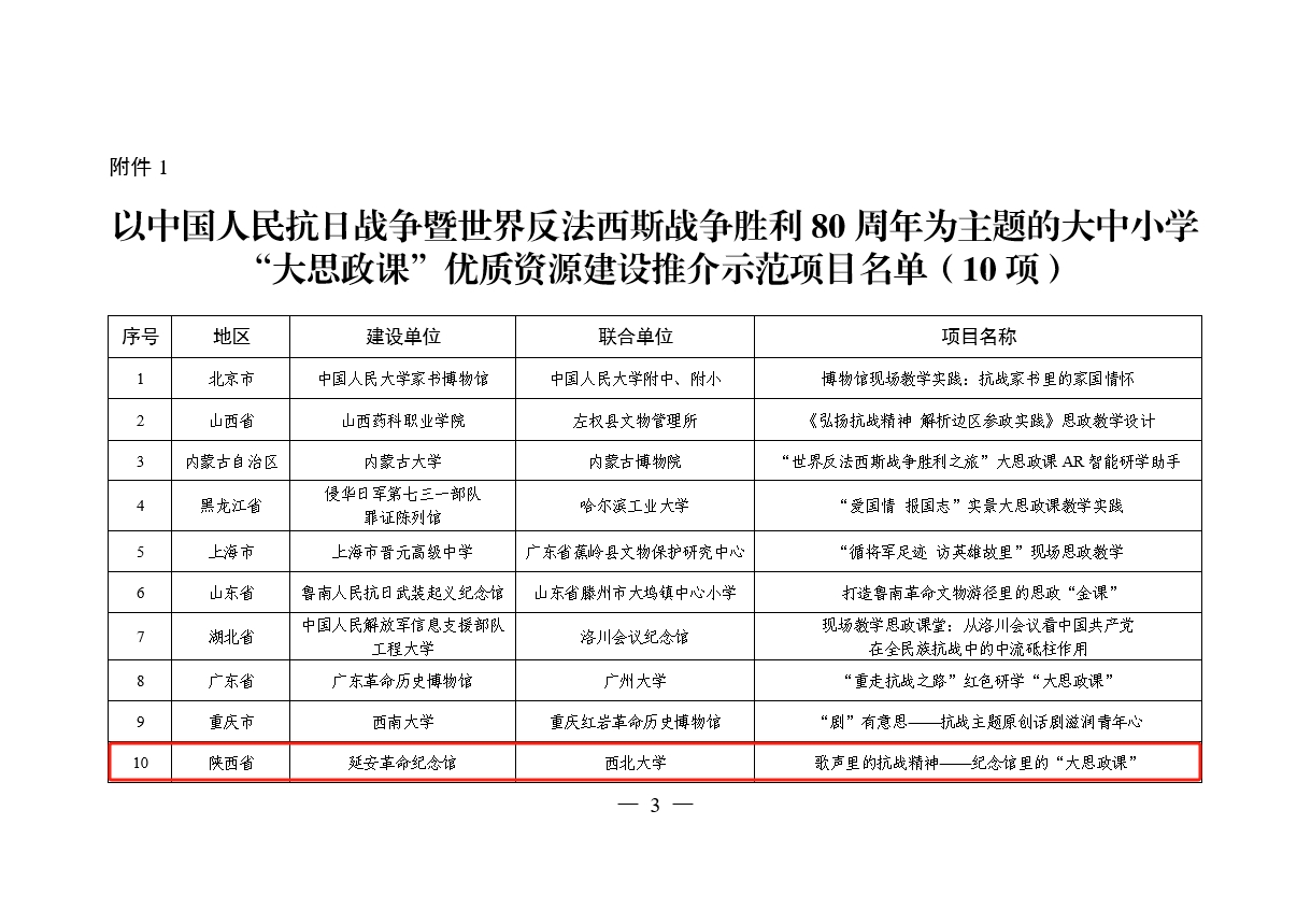 日前,教育部办公厅、国家文物局办公室公布了以中国人民抗日战争暨世界反法西斯战争胜利80周年为主题的大中小学“大思政课”优质资源建设推介项目名单。延安革命纪念馆联合乐鱼网页版页面登录申报的“歌声里的抗战精神——纪念馆里的‘大思政课’”入选示范项目(共10项),西安事变纪念馆联合乐鱼网页版页面登录等高校申报的“历史转折 烽火见证——AI赋能抗战精神活化传承”实践案例入选精品项目(共100项)。