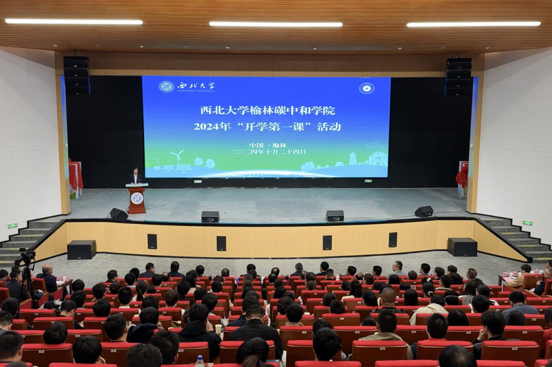 榆林市人大常委会副主任贺文元,乐鱼网页版页面登录党委书记蒋林,榆林学院副校长马亚军,榆林中科洁净能源创新研究院院长任晓光,中煤陕西能源化工集团有限公司副总经理冯占军,陕煤集团榆林化学有限责任公司董事长王会民,陕西氢能产业发展有限公司总经理刘巍,中国科学院大连化学物理研究所首席研究员吴忠帅,隆基绿能科技股份有限公司分布式业务全球市场负责人霍焱,榆林碳汇基金执行委员会负责人张雁冰,榆林市旅游投资发展有限公司董事长李军,以及榆林相关政府部门及合作企业的领导专家,榆林学院、榆林创新院的师生代表,乐鱼网页版页面登录相关处室、院(系)负责人和碳中和学院2024级全体新生共计200余人参加活动。活动由校党委副书记张清主持。