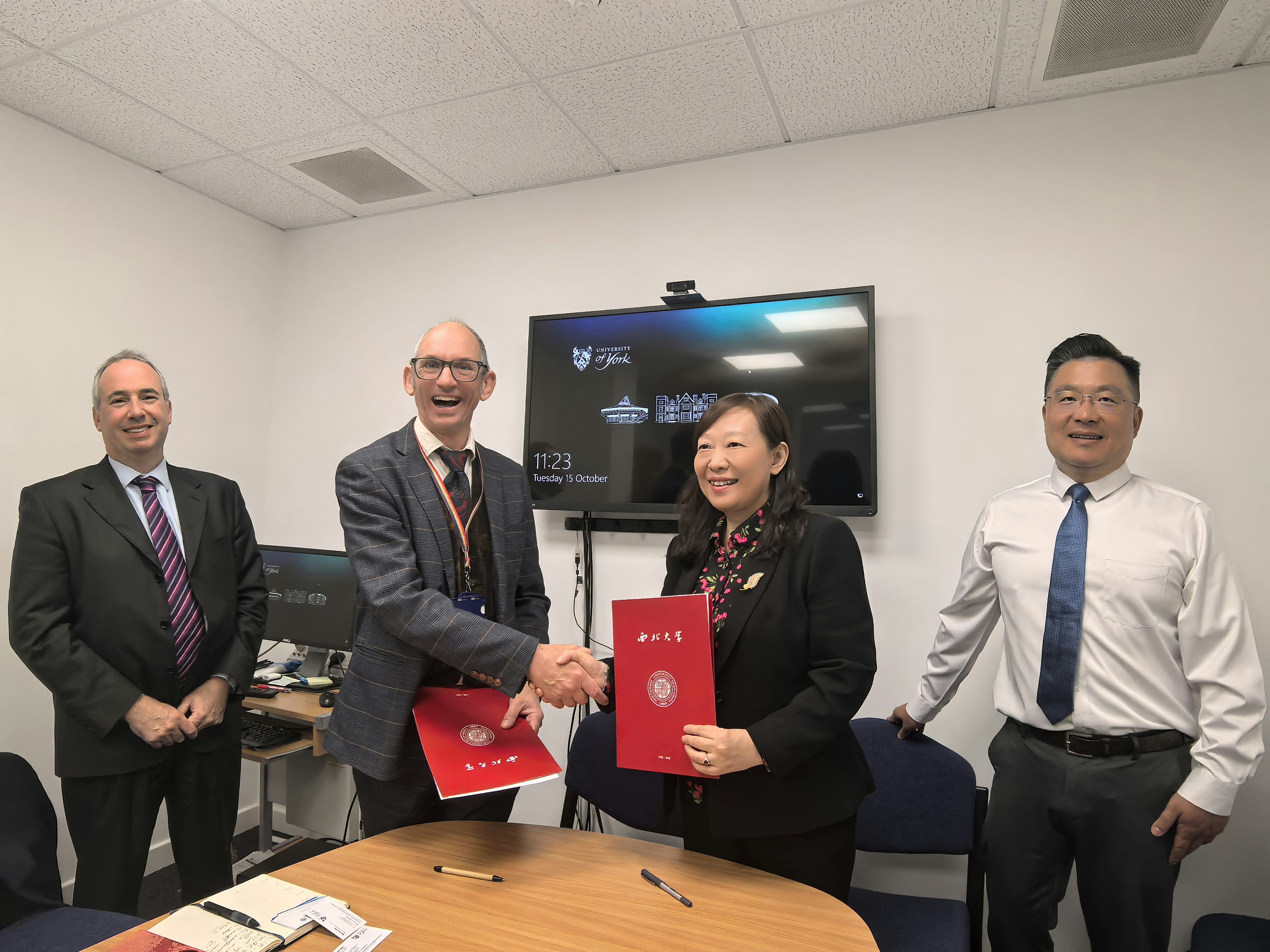在利兹大学,代表团分别与该校校长余海岁教授,学生教育副校长杰夫·格拉比尔教授,国际市场发展部、艺术人文与文化学部(历史学院、哲学宗教与科学史学院)、环境学部(地球与环境学院)负责人会谈,就推进两校在考古、地质、哲学、历史、文学等学科领域开展学生联合培养、教师互访、联合科学研究等项目进行了深入交流,签署了学生交流项目协议。