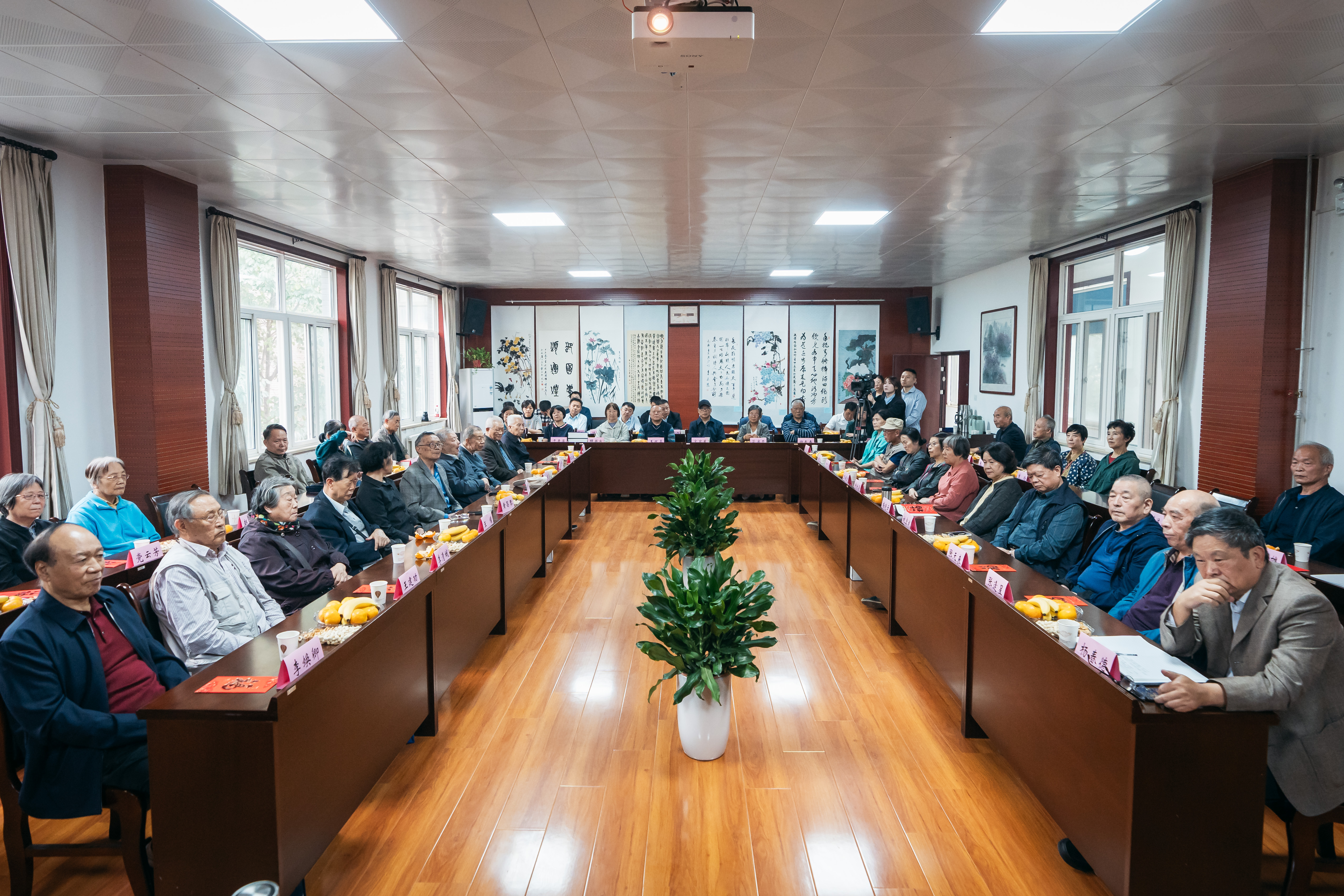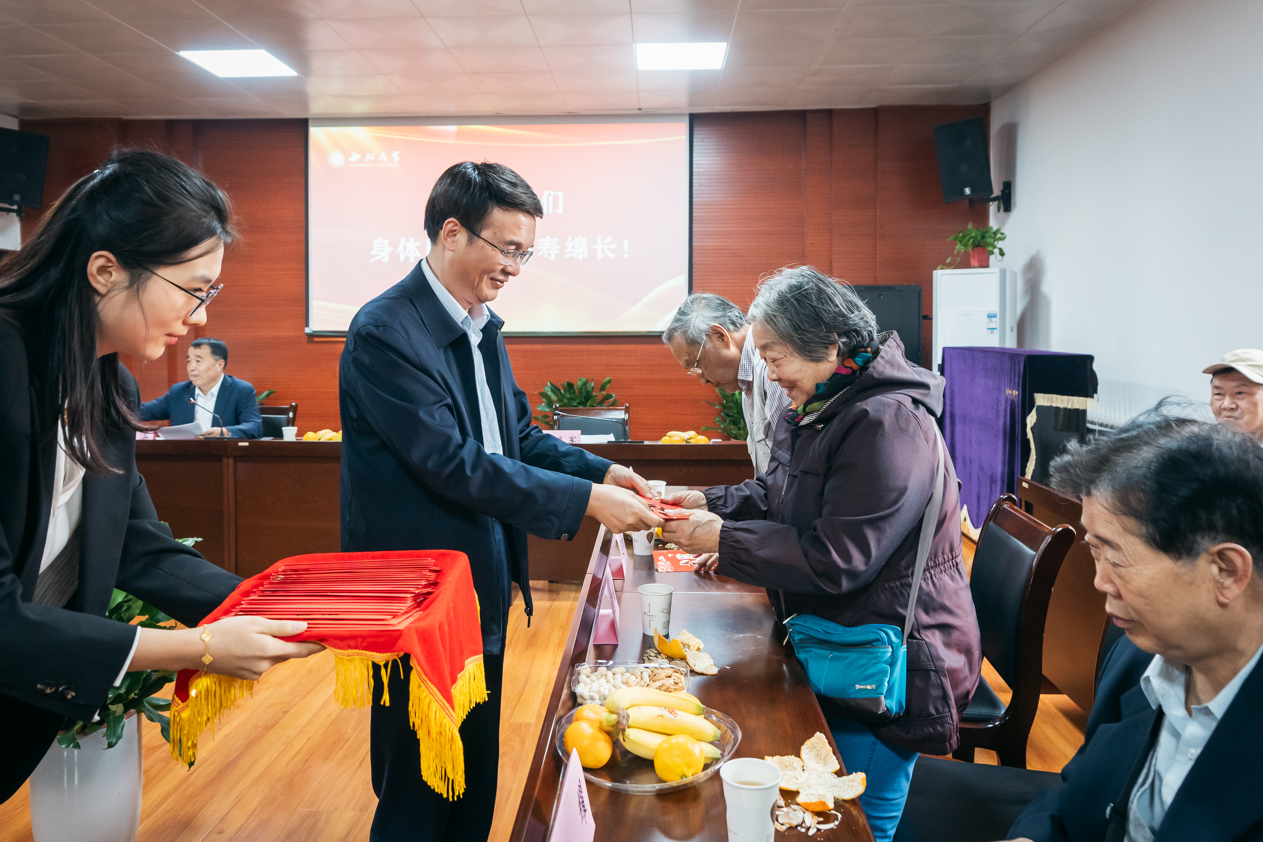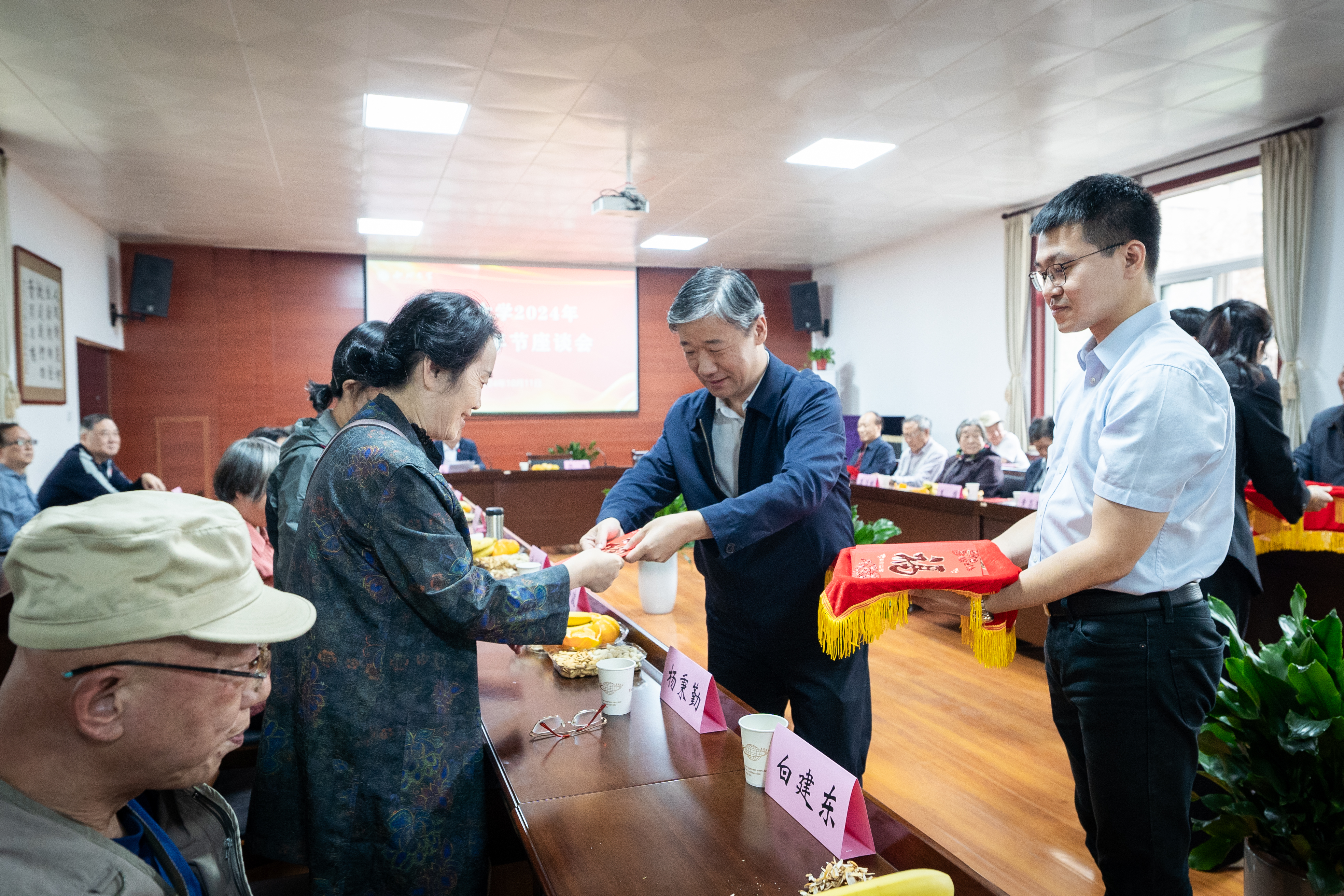 蒋林、张远军为来到座谈会现场的41位今年年满70、80周岁的老同志代表发放了祝寿金,并向他们致以节日的问候。