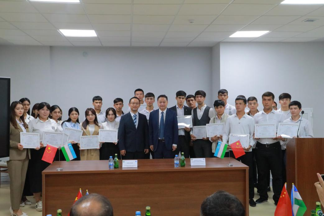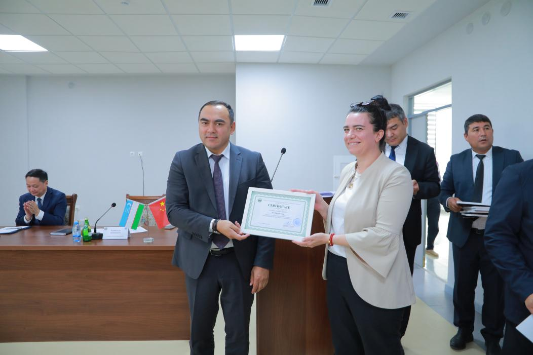 校党委常委、副校长陈富林为铁尔梅兹国立大学学生颁发考古学培训证书