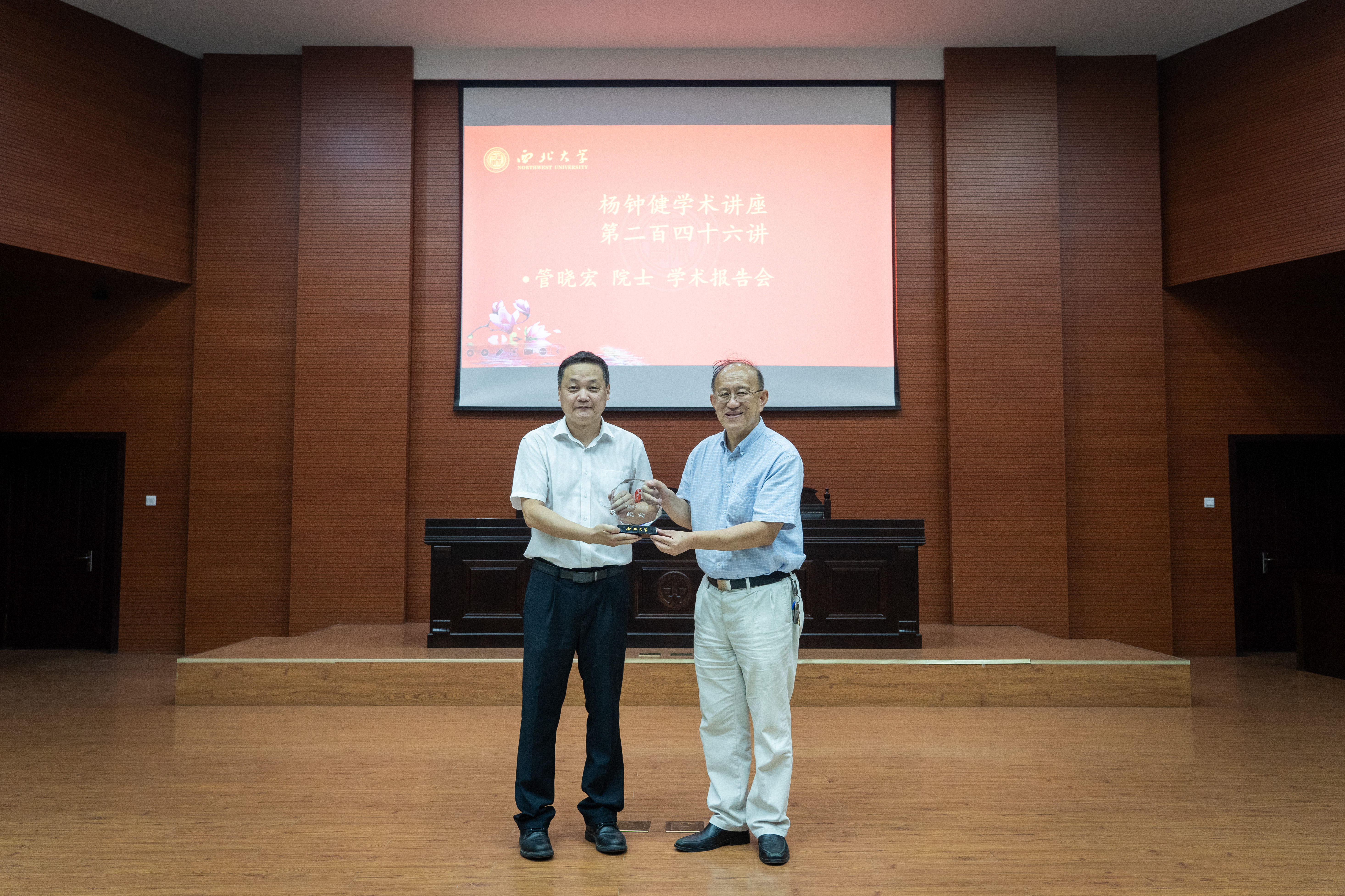 校党委常委、副校长陈富林向管晓宏院士赠送“杨钟健学术讲座”纪念牌
