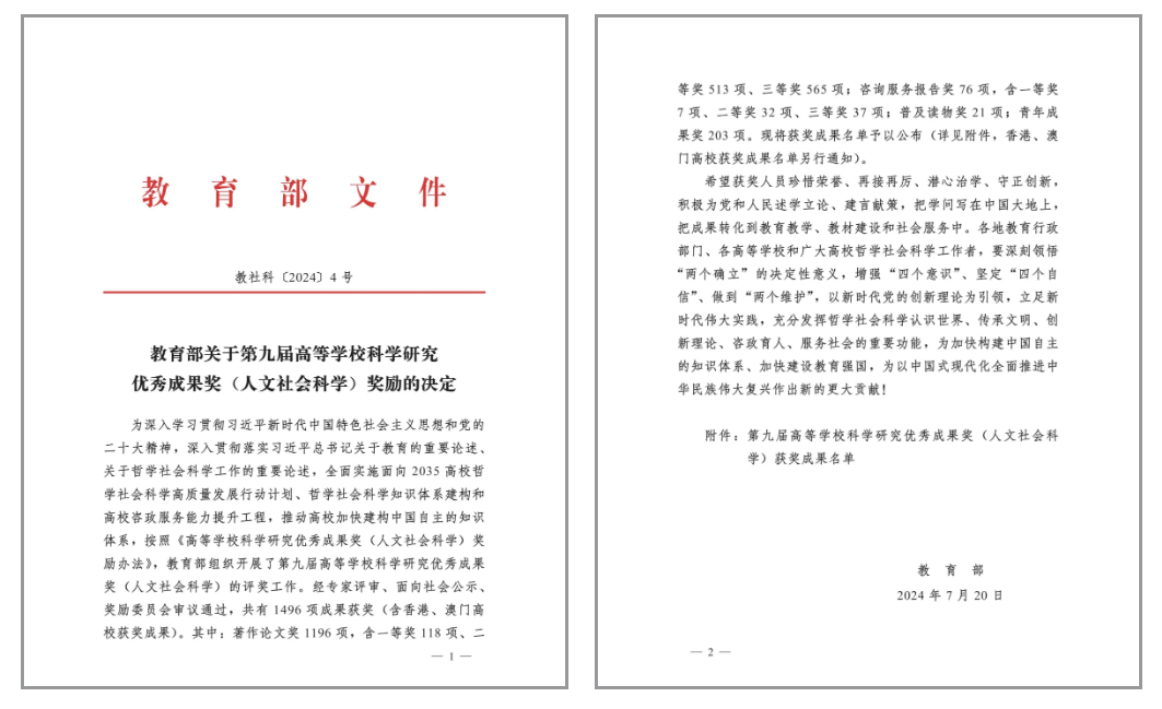 日前,教育部第九届高等学校科学研究优秀成果奖(人文社会科学)评选结果正式公布。