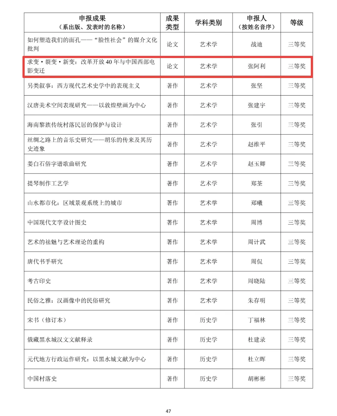《求变·裂变·新变:改革开放40年与中国西部电影变迁》,发表于《现代传播》2019年第2期。文章系统梳理了中国西部电影的发展历程,结合时代语境与中国西部电影创作实践,探秘中国西部电影发展与改革精神的内在关联,对中国西部电影当下及未来创作提出期望与建议。该成果曾获中国高校影视学会第十二届“学会奖”论文一等奖、陕西省第十五次哲学社会科学优秀成果奖二等奖、陕西高等学校人文社会科学研究优秀成果奖一等奖。