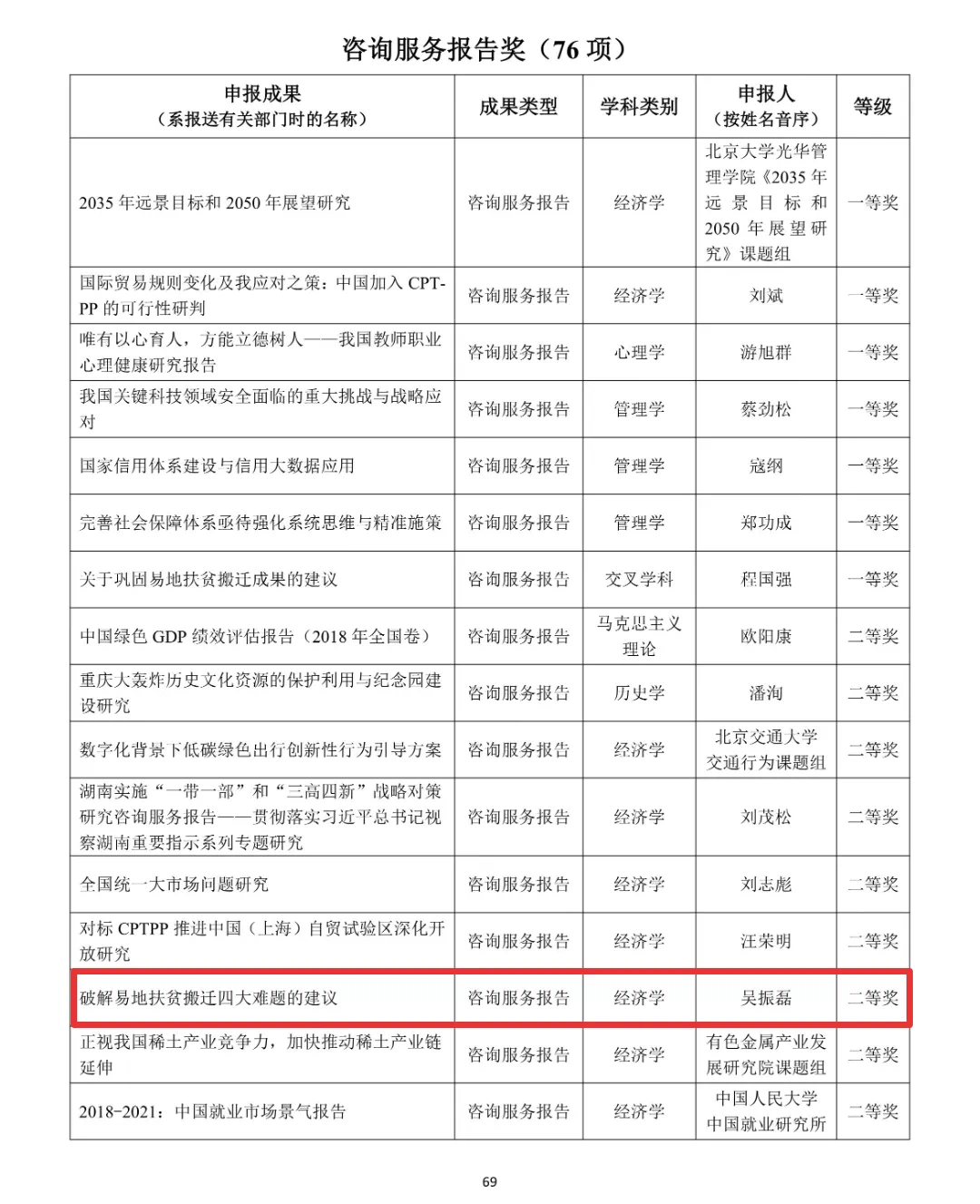 《破解易地扶贫搬迁四大难题的建议》于2018年被教育部《高校智库专刊》录用。该成果曾于2019年获陕西省人民政府颁发的陕西省哲学社会科学优秀成果三等奖,于2019年获中国扶贫发展中心颁发的“习近平总书记关于扶贫工作的重要论述学习研究成果”三等奖。