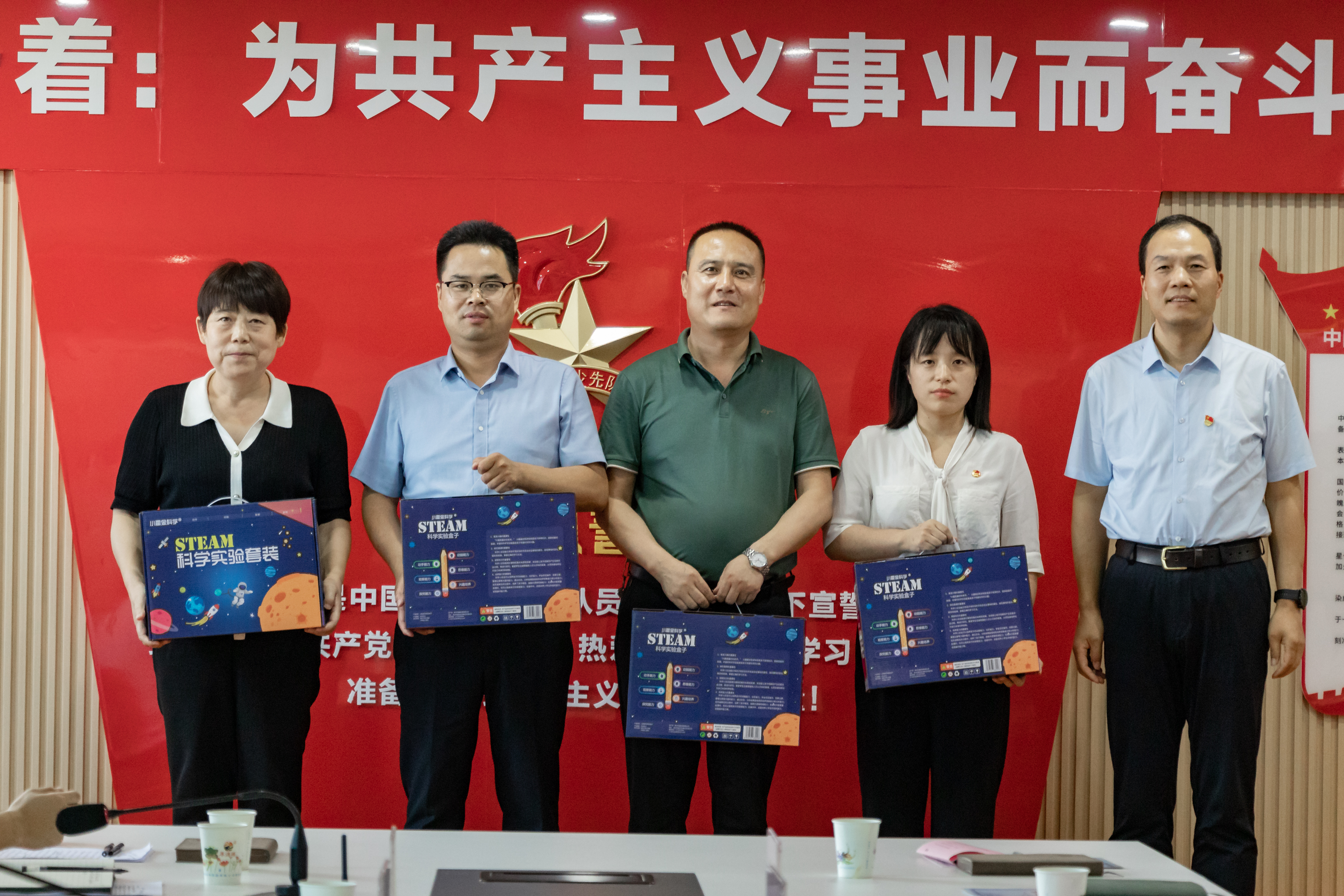 吕建荣代表乐鱼网页版页面登录向富平团县委、东上官小学、东区小学、莲湖学校赠送科学实验资源包。