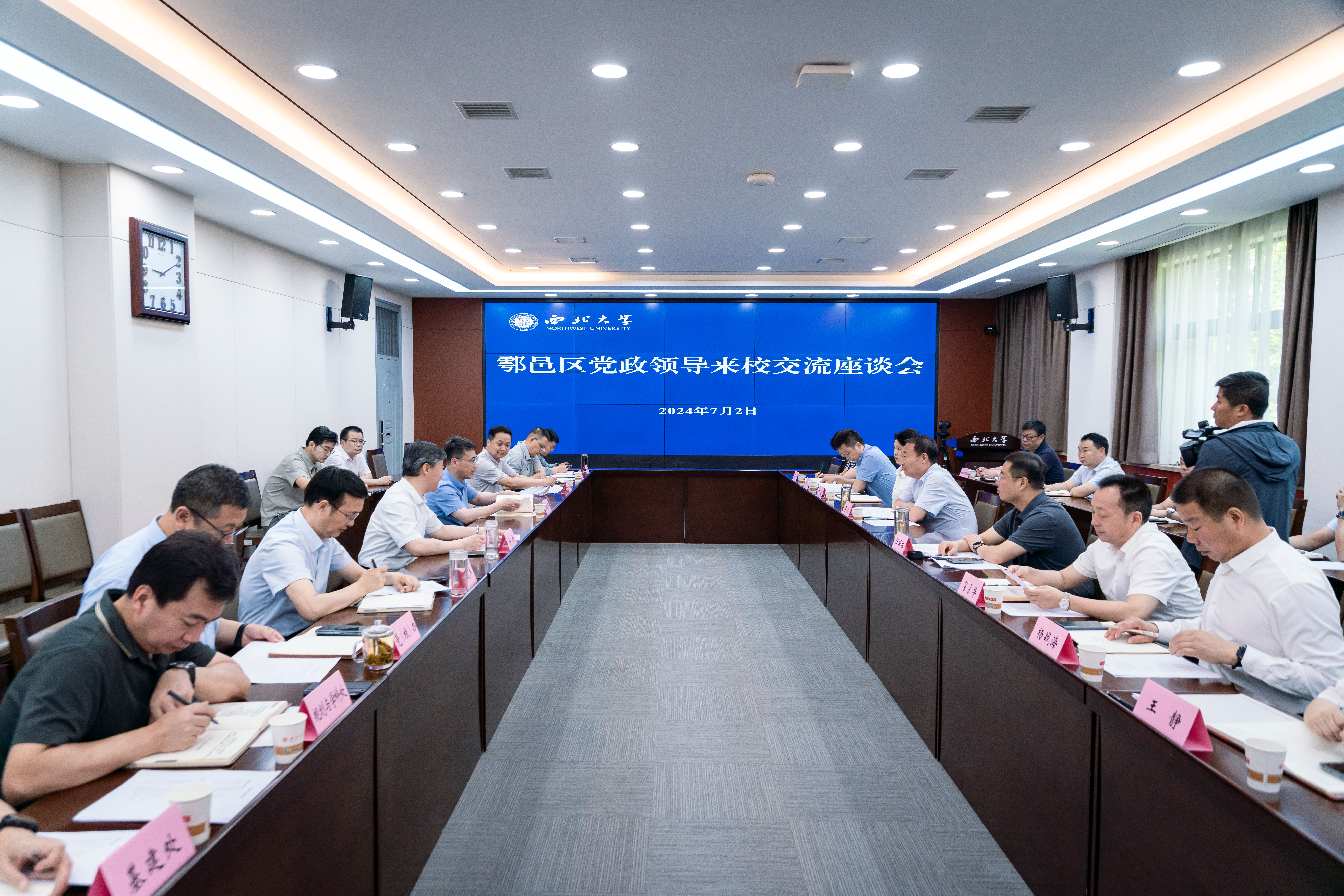 7月2日上午,鄠邑区委书记李化,区委副书记、区长汪国栋一行来校就校地合作事宜进行交流座谈,区领导王值、管永华、张博、杨战海、吴宁超、王静和区委区政府相关职能部门负责人参加了座谈。座谈会由校党委书记蒋林主持,校长孙庆伟,校党委常委、副校长张远军、陈富林出席会议。党(校)办、科技处、规划与学科处、财资部、基建处负责人参加了座谈会。