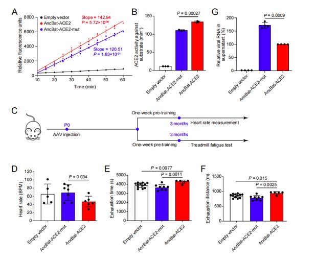 同时,研究团队进一步验证ACE2在蝙蝠祖先枝系上所受选择压力对心脏功能的影响,利用心脏特异表达的腺相关病毒(AAV9)分别将AncBat-ACE2和AncBat-ACE2-mut转染至小鼠心脏中,并对这些小鼠进行运动疲劳测试。发现携带AncBat-ACE2的小鼠比携带AncBat-ACE2-mut的小鼠的心率调节能力和运动能力都显著更强。