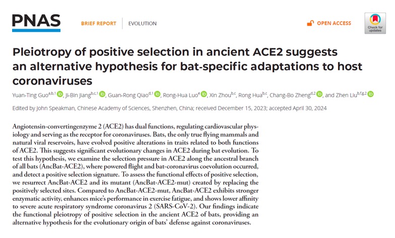 近日,乐鱼网页版页面登录生命科学学院博士后郭媛婷及其合作者在蝙蝠抗冠状病毒的起源机制方面取得新进展。该研究成果近日以“Pleiotropy of positive selection in ancient ACE2 suggests an alternative hypothesis for bat-specific adaptations to host coronaviruses”为题发表在PNAS《美国科学院院报》期刊上。