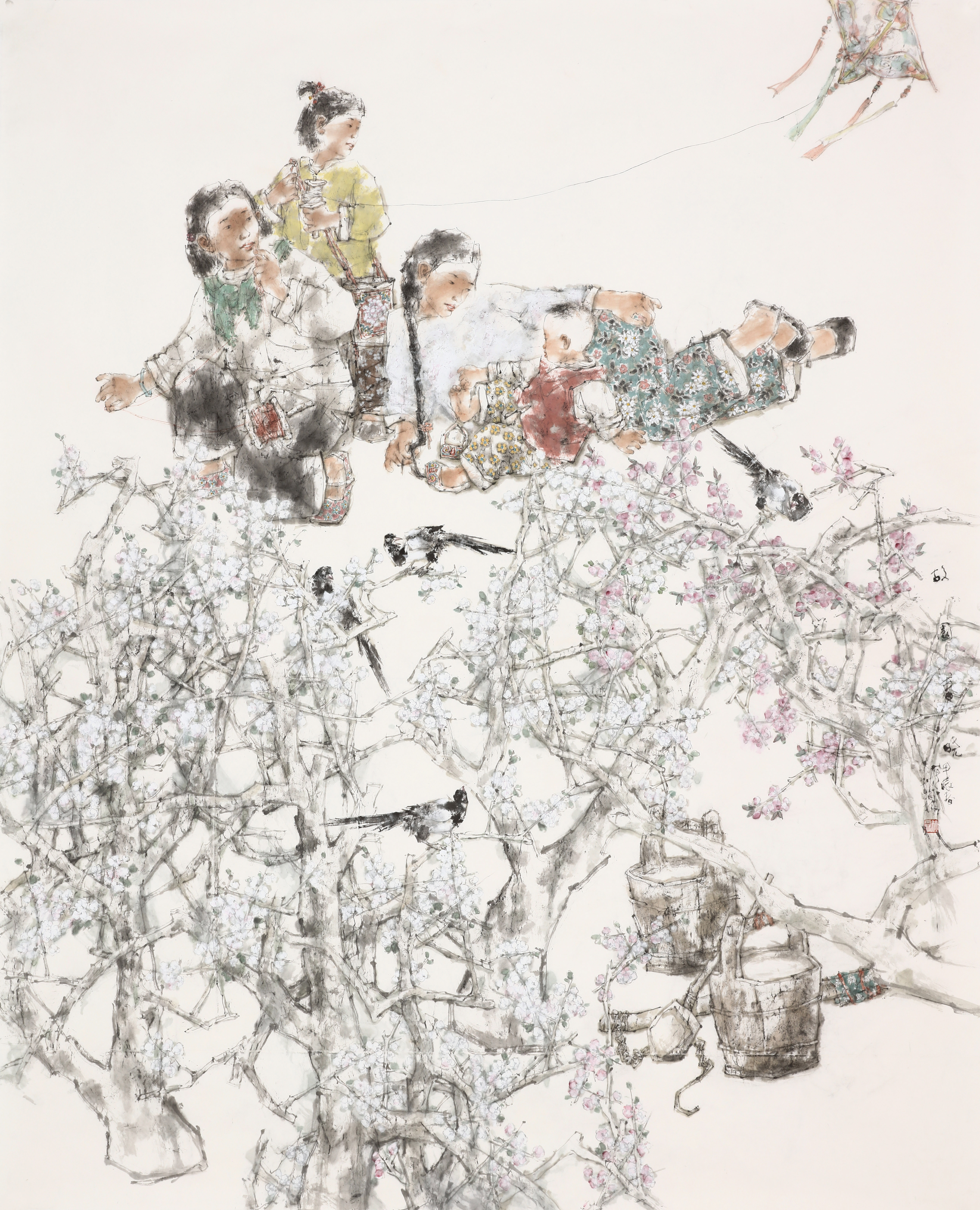 《故园春晓》以清新雅致的笔墨描写了新时代北方乡村一派春意盎然、祥和宁静的生活景象,表现出人们对美好生活的热爱和对未来的憧憬。画面于浓厚的生活气息中彰显出中国画特有的诗性表达和民族精神。