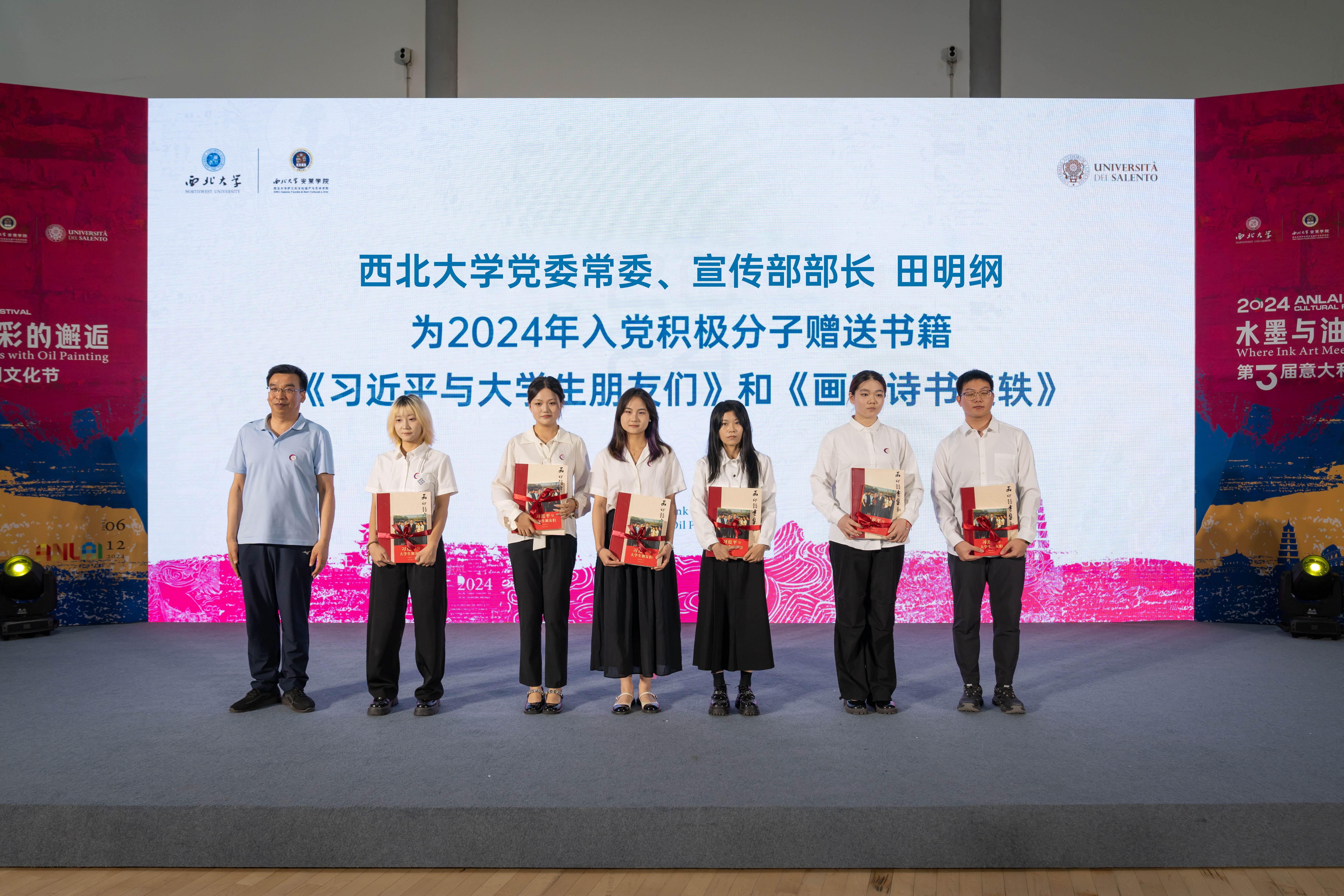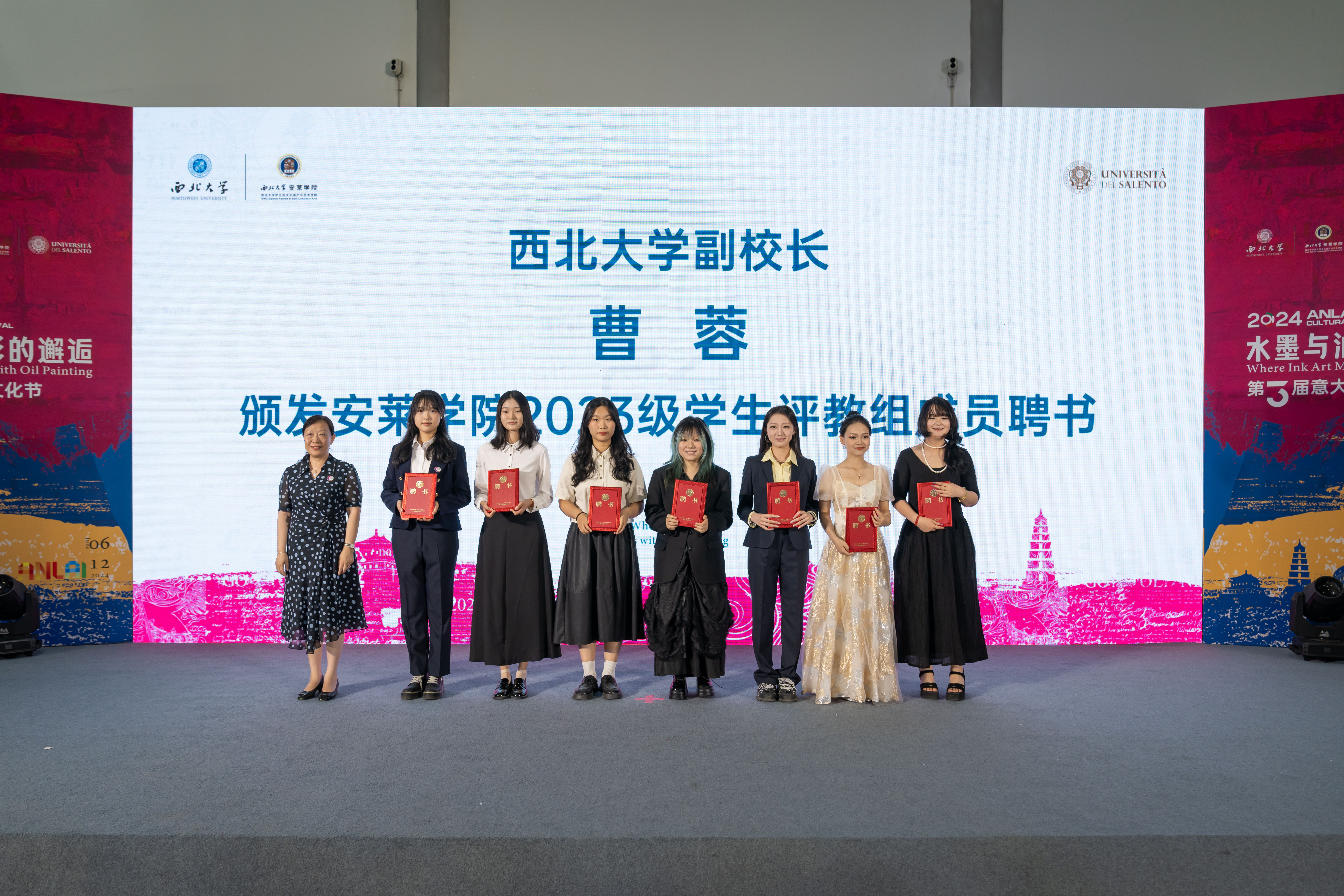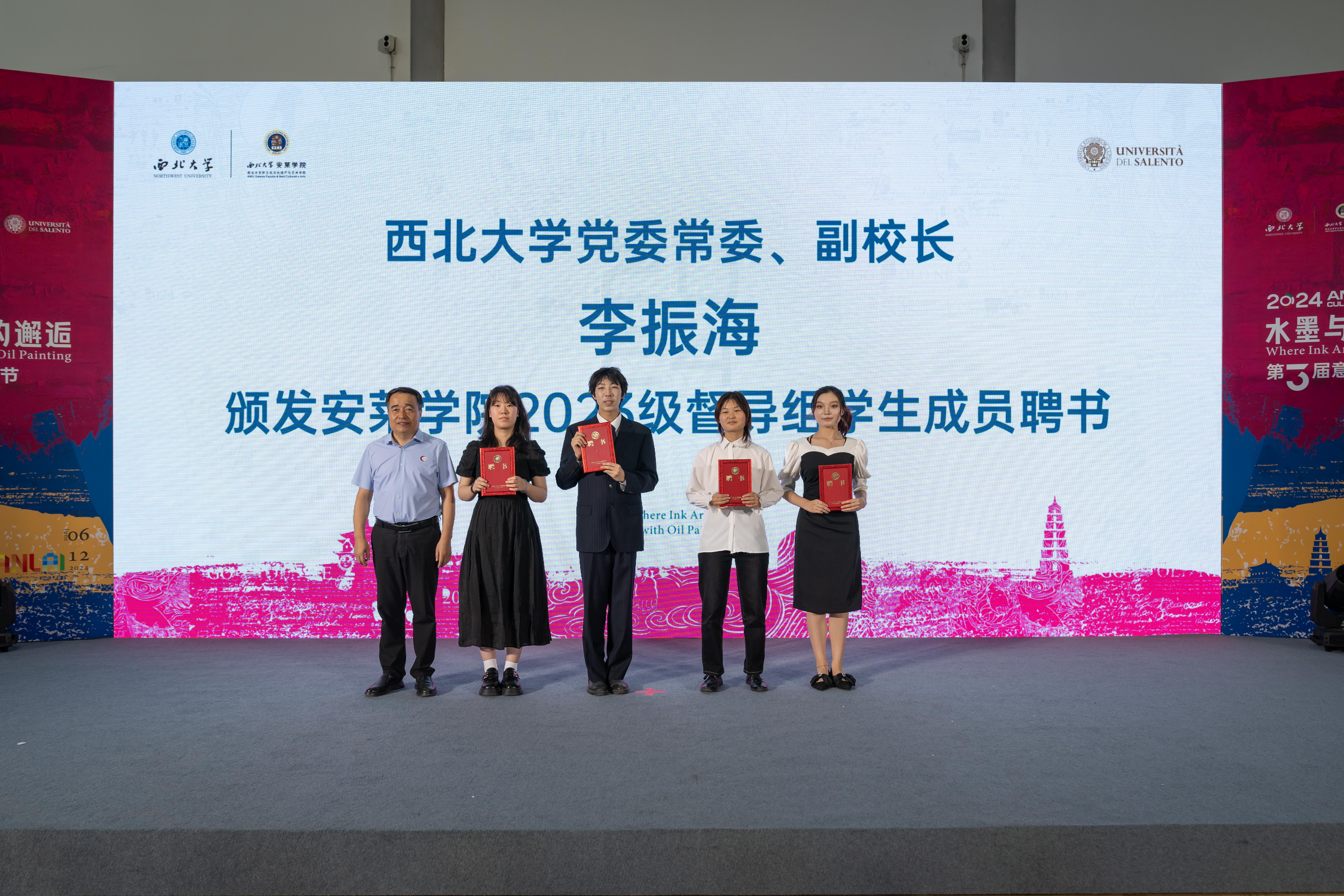 李振海为安莱学院2023级教学督导组学生成员颁发聘书,曹蓉为学院教学评教组学生成员颁发聘书。田明纲为学院2024年入党积极分子颁发赠书。随后,安莱学院首批赴意学生代表发言,分享了交流期间的感想和收获。