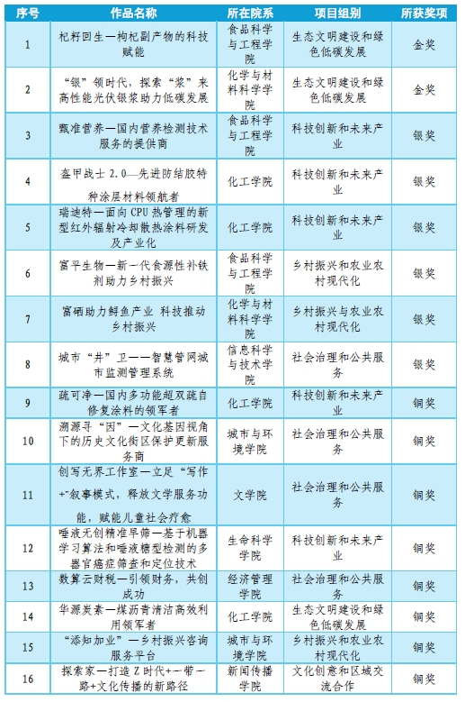 本届竞赛中,乐鱼网页版页面登录参赛作品《杞籽回生—枸杞副产物的科技赋能》等2件作品获金奖、《甄准营养—国内营养检测技术服务的提供商》等6件作品获银奖、《疏可净—国内多功能超双疏自修复涂料的领军者》等8件作品获铜奖,学校获大赛“优胜杯”。