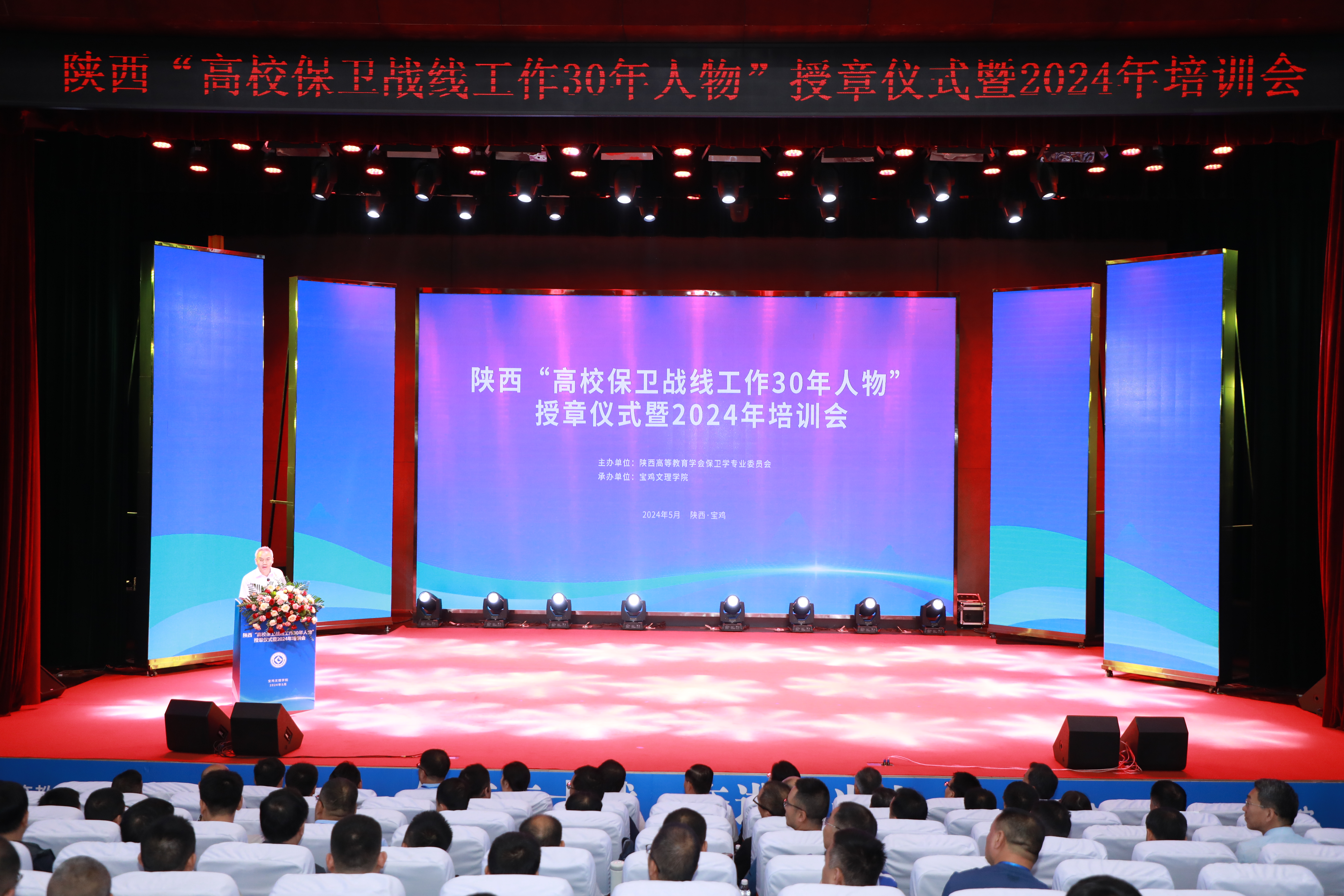 活动以“矢志三十载·奋进勇当先”为主题,陕西省委教育工委稳定办主任任正旺、宝鸡文理学院校长郭霄鹏、党委副书记韩干校,中国高等教育学会保卫学专业委员会副秘书长、湖南大学党委保卫部副部长刘晚梅,西安邮电大学副校长苗忠,宝鸡市委政法委副书记陈雍翰,宝鸡市公安局副局长张怀顺,陕西省公安厅经济文化保卫总队郭幸军以及省内部分高校领导、保卫部(处)部(处)长、保卫干部等200余人参加活动。授章仪式由陕西高教学会保卫学专委会理事长、乐鱼网页版页面登录保卫部雷林刚主持。