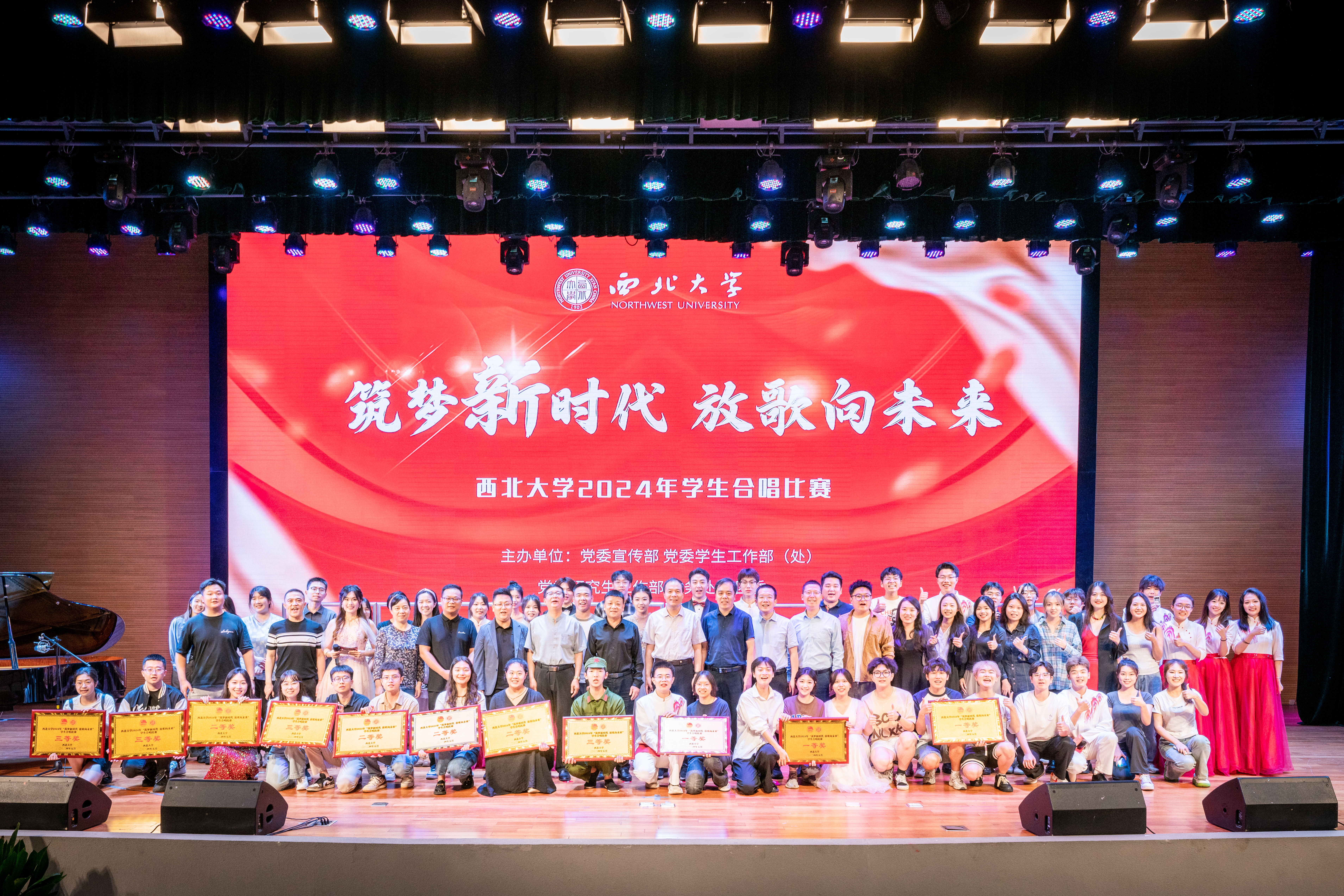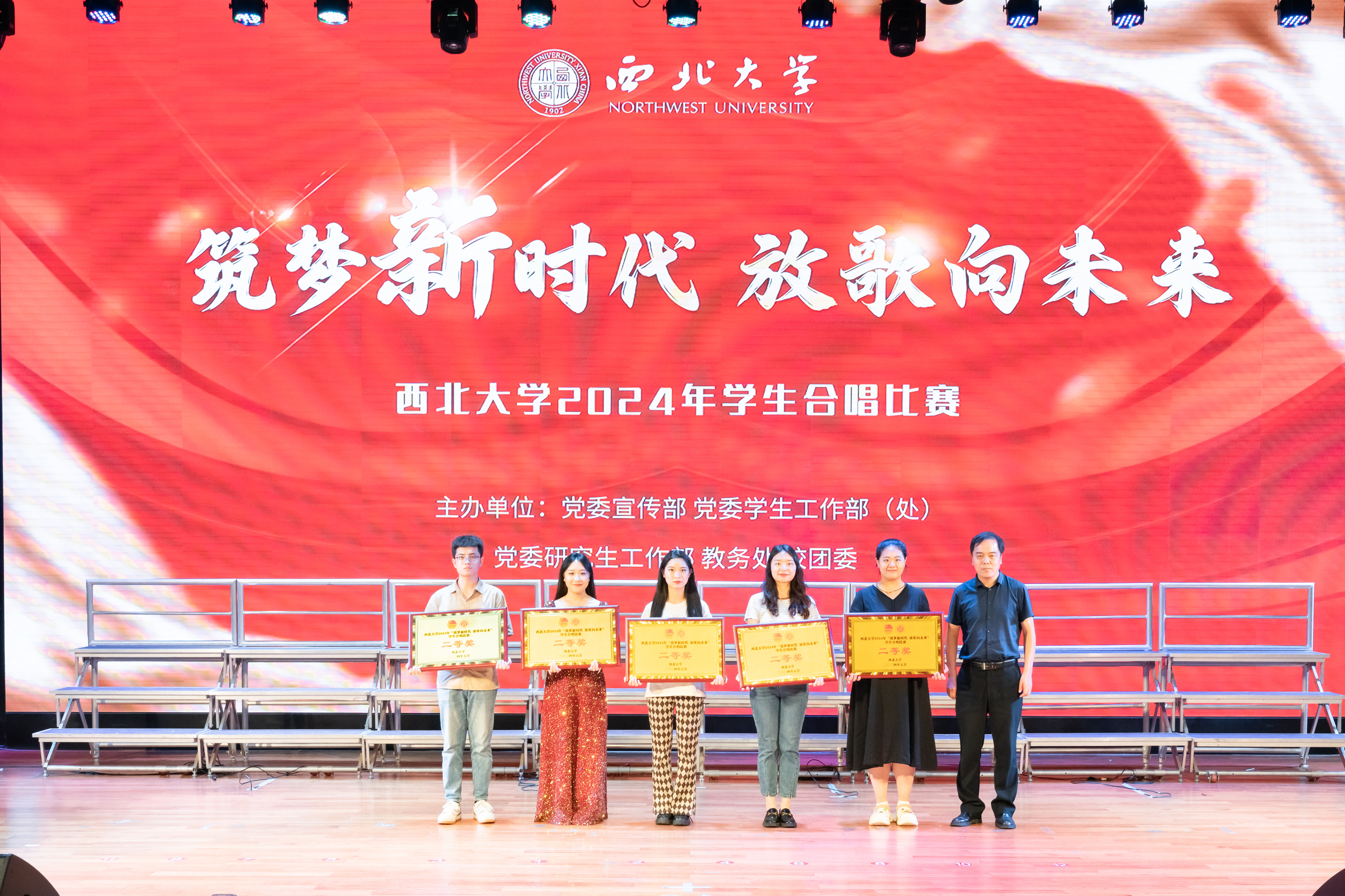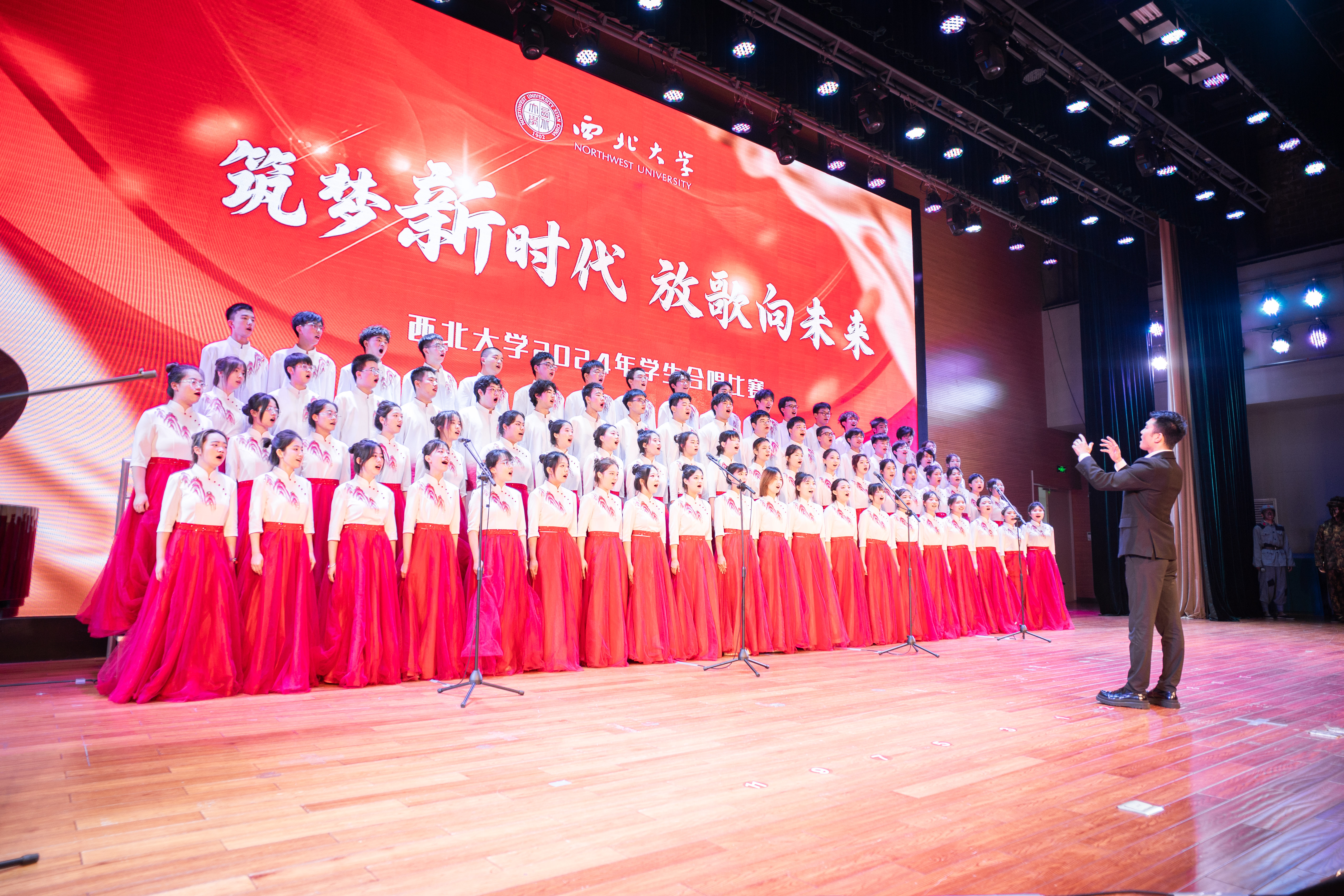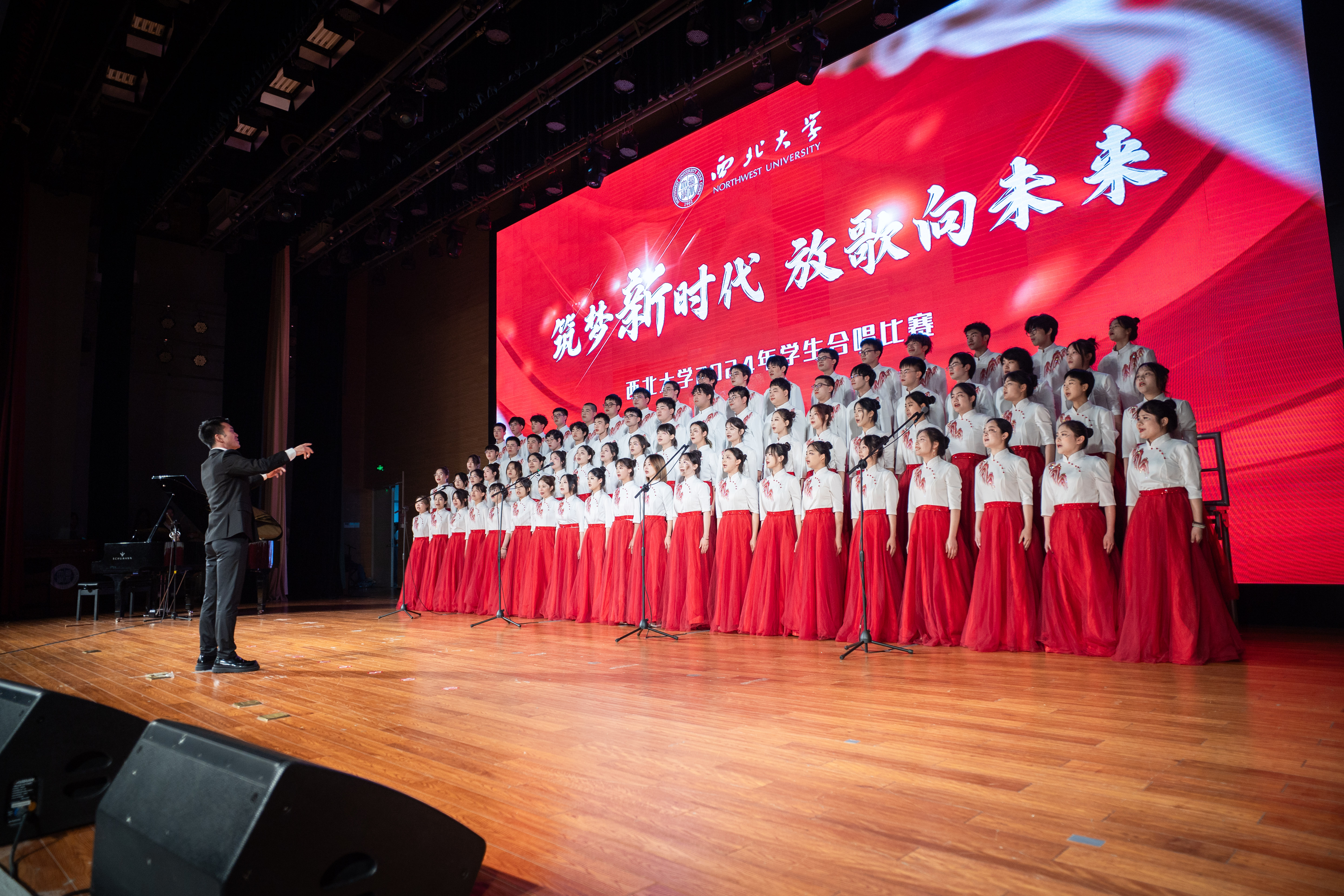 舞台上光芒闪耀,各合唱团盛装以待,一遍遍《乐鱼网页版页面登录校歌》表达着百廿西大历史的积淀与传承的故事,交相辉映的灯光点亮了薪火相传的征途。激昂的旋律,婉转的音符,一首首经典歌曲诉说了近现代中华民族在党的领导下苦难辉煌的奋斗故事;台上的同学们气宇轩昂、歌声嘹亮,展现了新时代青年为中国式现代化挺膺担当的豪迈气魄。