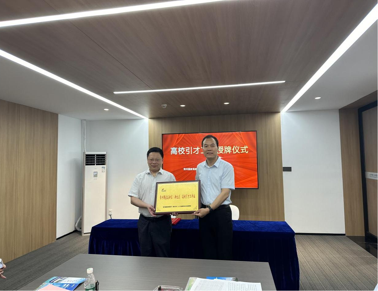 在常州市参加访企拓岗暨引才工作站签约座谈活动时,新北区人民政府副区长章俊介绍了高新区“两特三新”光伏智慧能源、碳纤维及复合材料两大特色产业、新能源汽车及汽车核心零部件、新医药及医疗器械和新一代信息技术三大新兴产业,并就产业结构、辖区优质企业和人才政策进行推介,特别欢迎学校向新北区推荐优秀人才。吕建荣表示,新北区经济竞争力强盛,双方在创新平台搭建、重点项目策划、高端人才引进等方面还有广阔的合作空间。会上,校地双方代表签订引才工作站合作协议,吕建荣与章俊共同为“常州国家高新区(新北区)高校引才工作站”授牌。