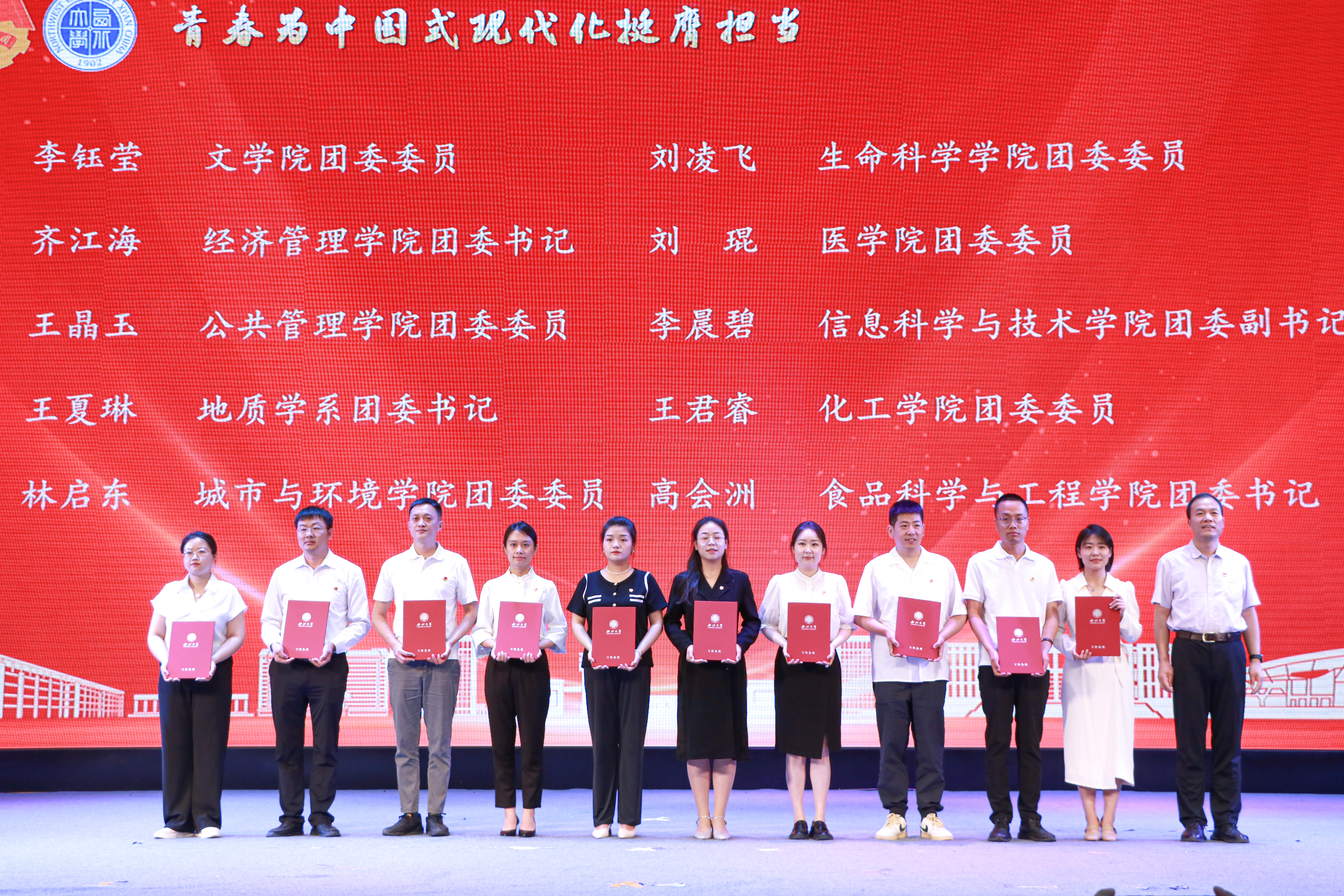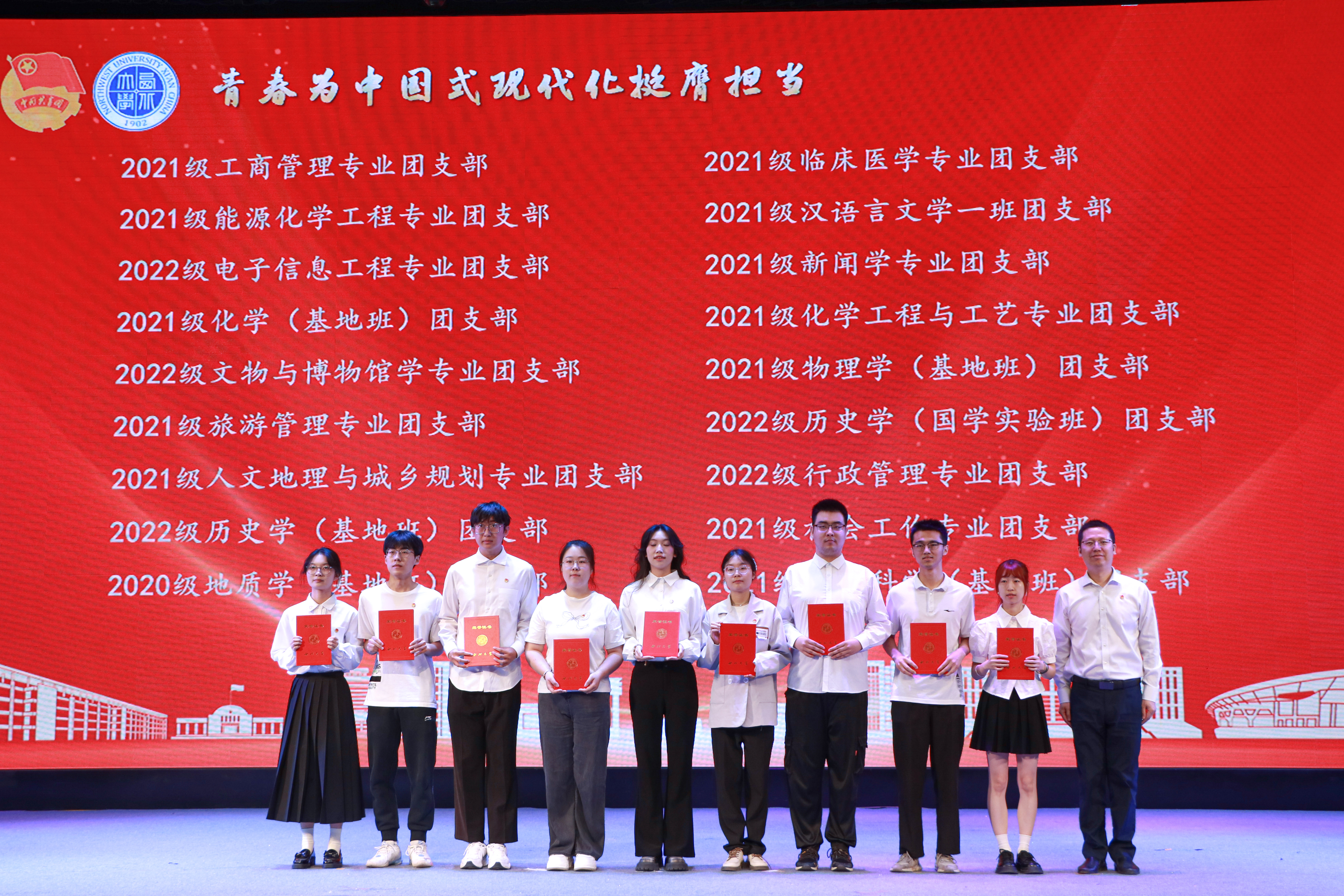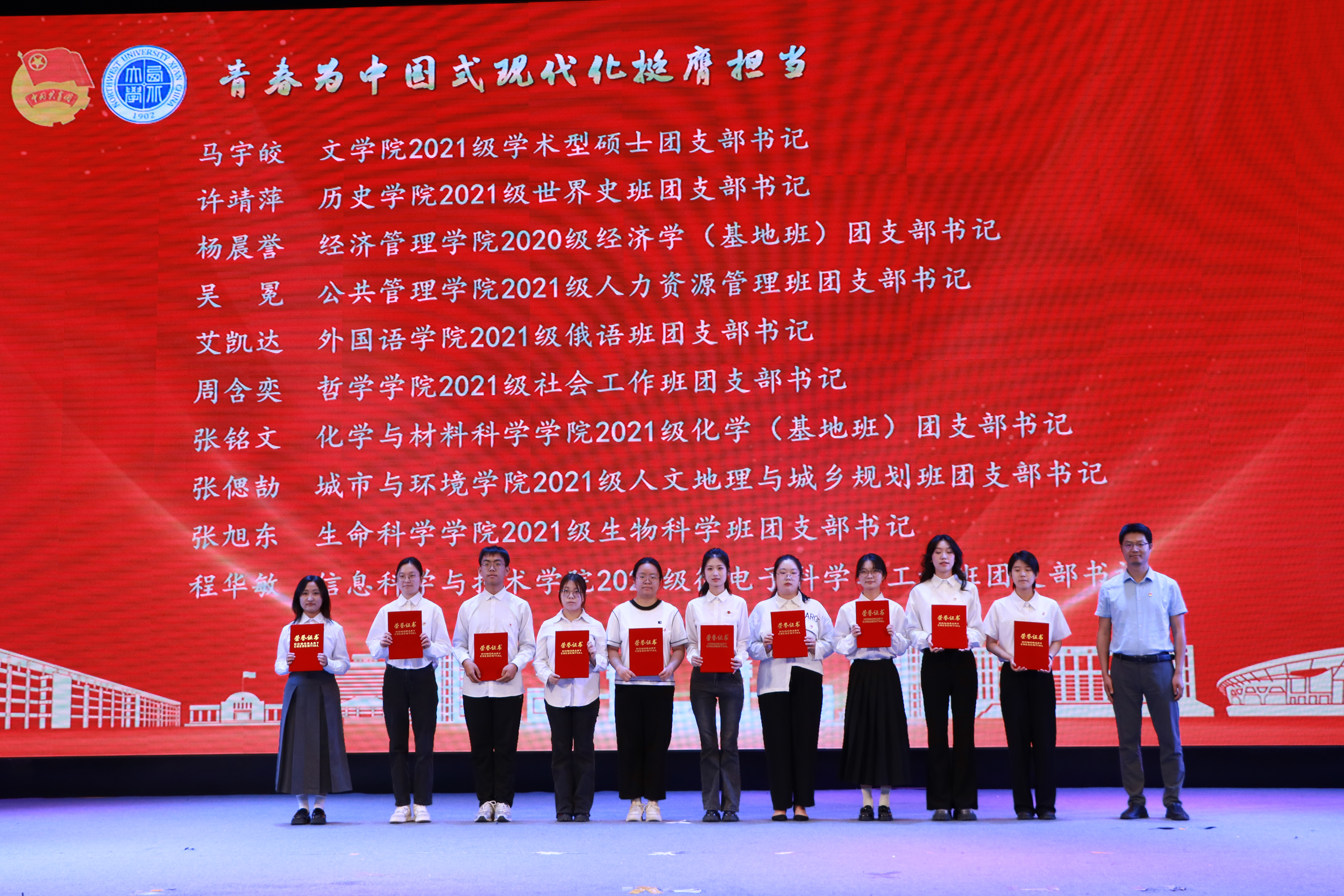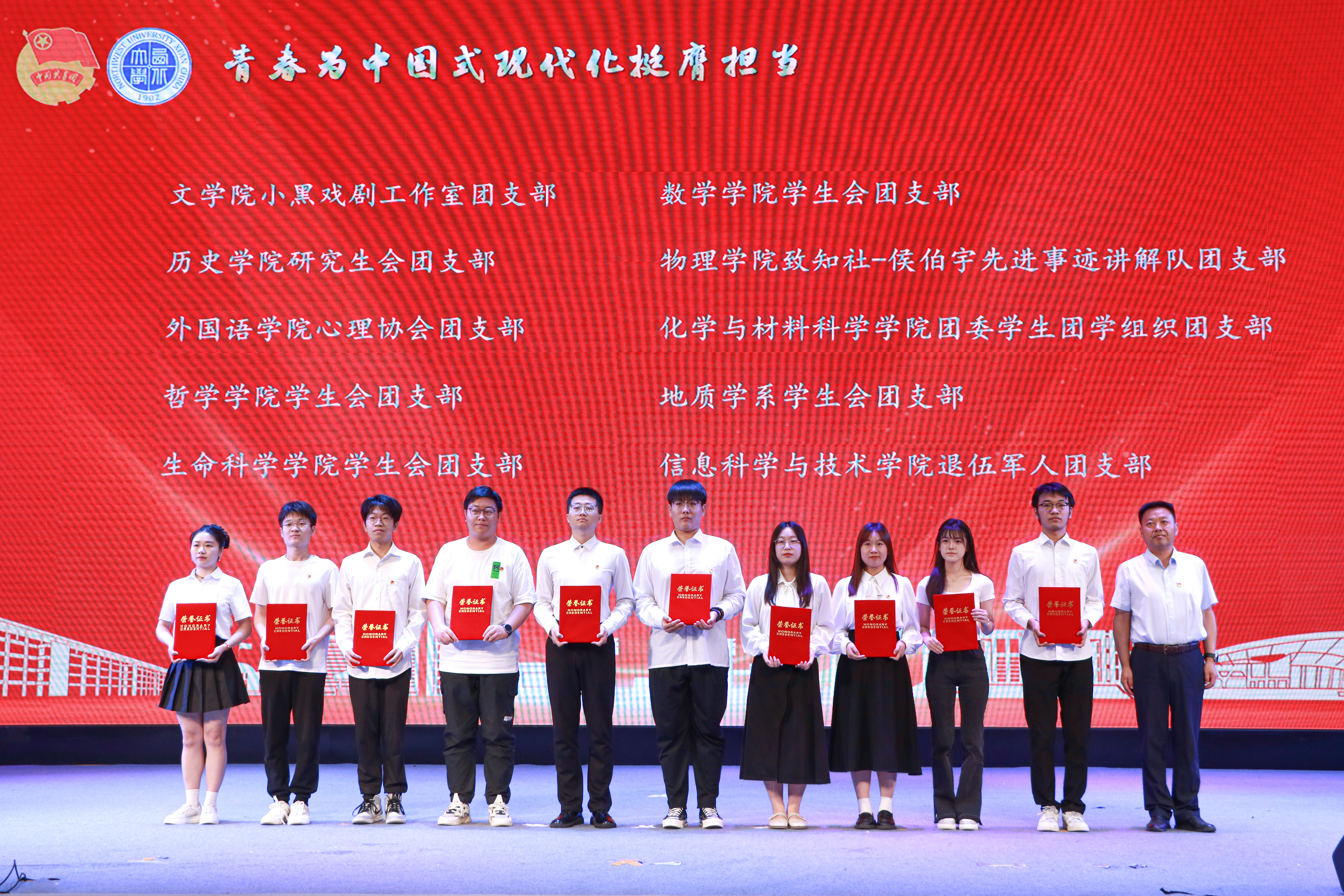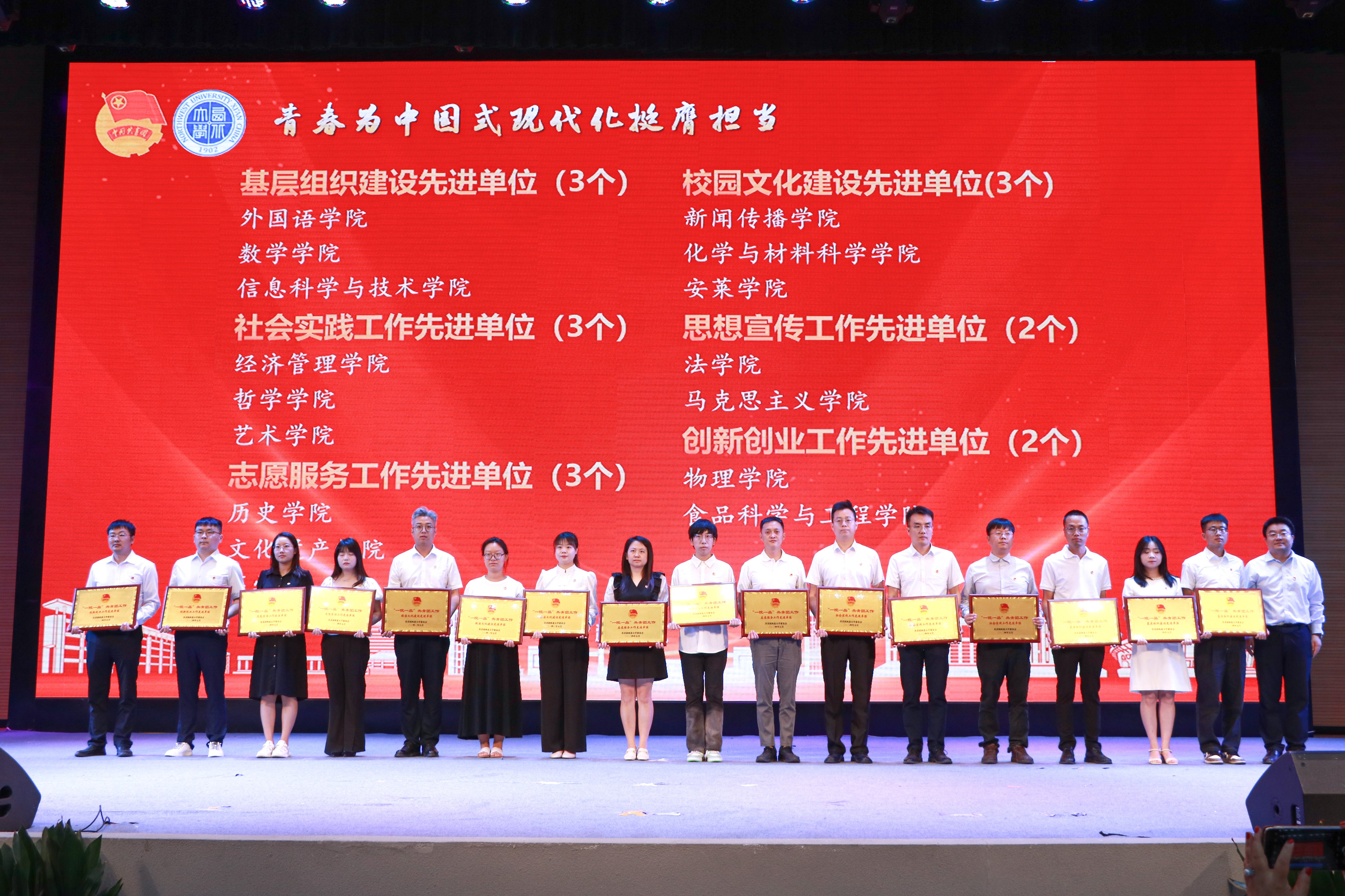 大会上,与会领导分别为“五四红旗团委”、“全省高校团建示范培育标杆院系”、“优秀专职团干部”、“一院一品共青团工作单项奖”和优秀共青团员、优秀学生团干部、十佳团支部书记、五星级团支部、活力团支部、2023年度“陕西省学联学生会先进工作个人”、“最西大”学子奖、2023-2024年度陕西省大学生自强之星(科创团队)、省级暑假社会实践获奖集体和个人颁发奖牌和证书。