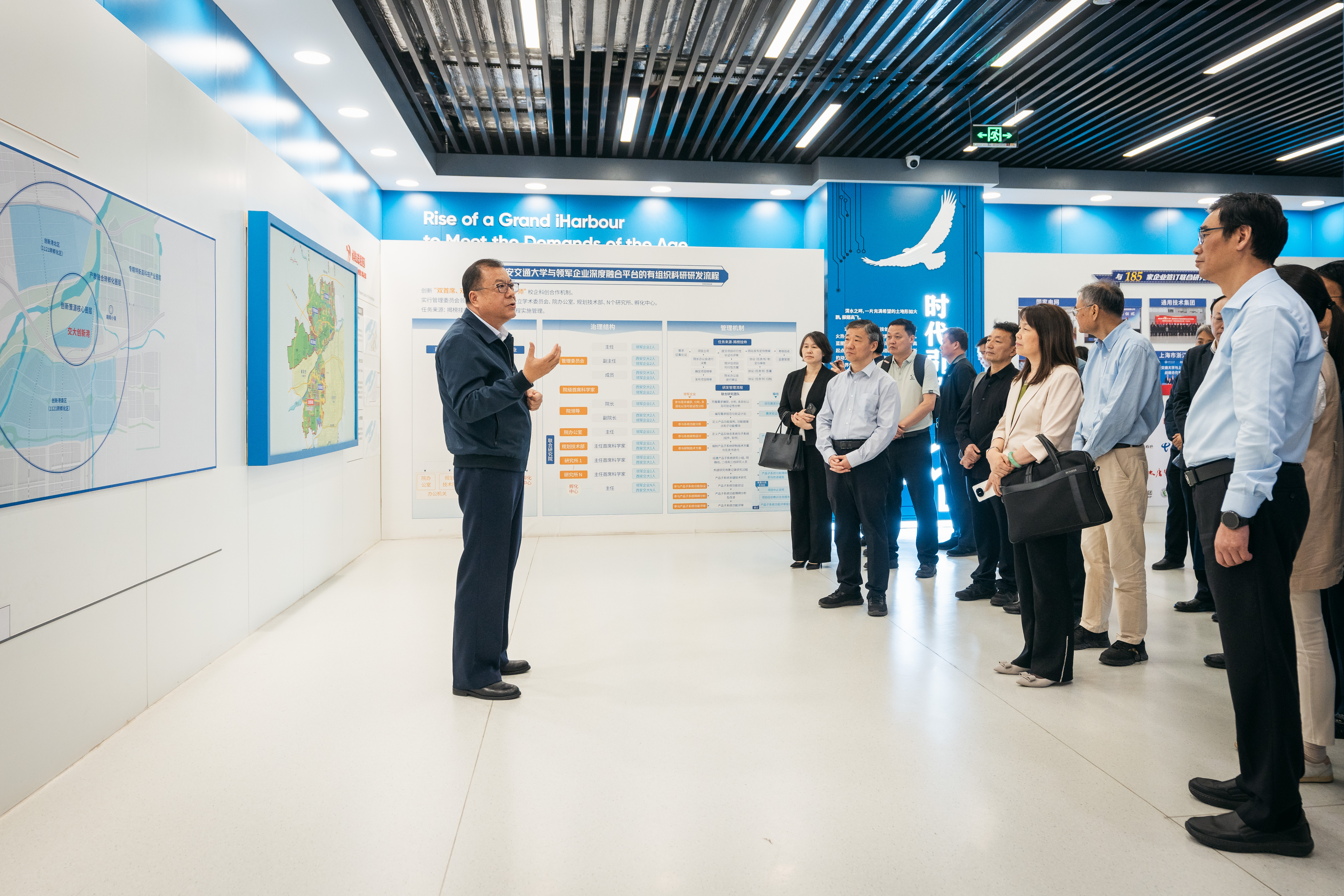 在西安交通大学党委书记卢建军的带领下,蒋林一行首先参观了数字展厅。这里集中展示了西安交通大学弘扬西迁精神、服务国家战略、协同科研攻关、推进产教融合的探索和成就。卢建军为大家详细讲解了中国西部科技创新港的整体布局、建设历程、使命任务和发展战略,特别是汇聚全球创新资源、聚焦国家发展战略、对接地方产业需求、引入各类金融资本、培育良好创新生态、培养卓越创新人才方面的成功实践。