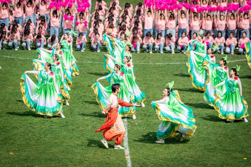 文艺表演环节,千余名师生轮番登场,来自太极、射艺、散打、花样跳绳和瑜伽等16个体育选项班的同学们把太极拳动作和不同风格的武术动作共熔一炉,花样跳绳、射艺、中国式摔跤和武术等4支校代表队更是英姿飒爽,一招一式展现出自强不息的尚武精神,带大家身临其境的感受了中国民族传统体育的独特魅力与神韵之美。操舞班同学们手捧粉色的花球,伴着欢快的节奏,轻松悦动,她们扬起笑容,舞起花球, “乐鱼网页版页面登录教授跑团” 更是挥动旗帜,伴随着方阵变换,一朵璀璨的玉兰花在观众面前徐徐展现。校工会教职工艺术团在绿茵场上着青衫、舞长袖,用青春的色彩和曼妙的舞姿带来了舞蹈《光芒》。TW街舞社的表演巧妙地融合了多种街舞风格,从整齐划一,配合默契的齐舞,到优雅的爵士,从动感十足的hiphop,到震撼人心的breaking,再到趣味横生的popping,每一种舞种都在西大学子的演绎下焕发出新的光彩。