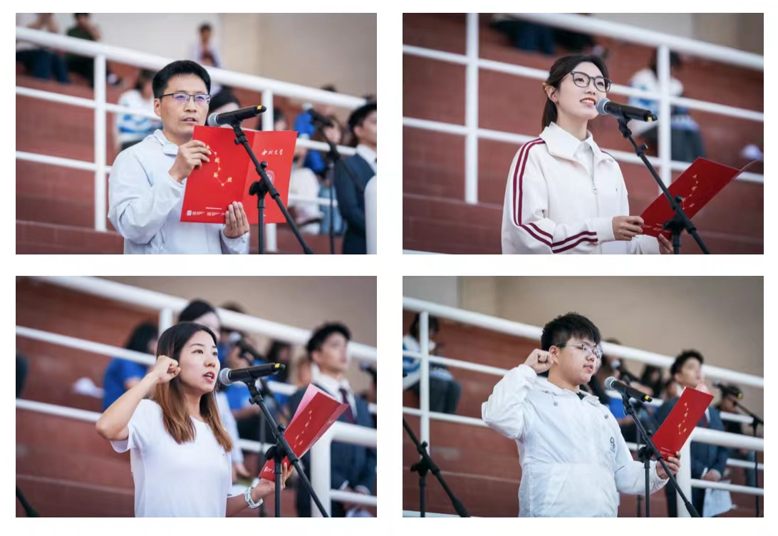 国歌声响起,全体师生向冉冉升起的国旗行注目礼。校旗、会旗随后依次升起。教师代表周喜存,学生代表陶澳丽分别发言,周喜存、贾向丽、张磊分别代表教工运动员、学生运动员、裁判员宣誓。孙庆伟宣布体育文化节田径运动会正式开幕。