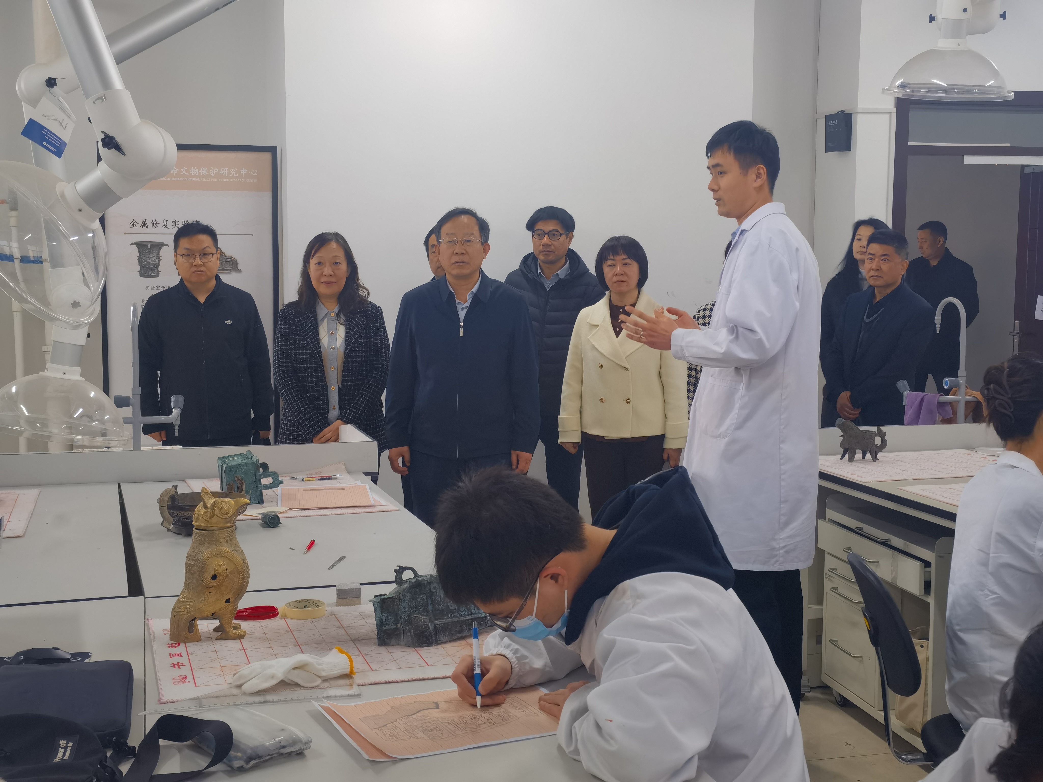 座谈会上,学校各参会部门负责同志结合职责业务,汇报了工作进展情况。会后,省委政策研究室副主任杨孝武一行来到文化遗产学院国家级教学示范中心,先后走进金属文物修复教学实验室、壁画修复教学实验室、纸质文物修复教学实验室,实地调研一流学科专业建设、实验室建设以及教学实习实践开展等情况。