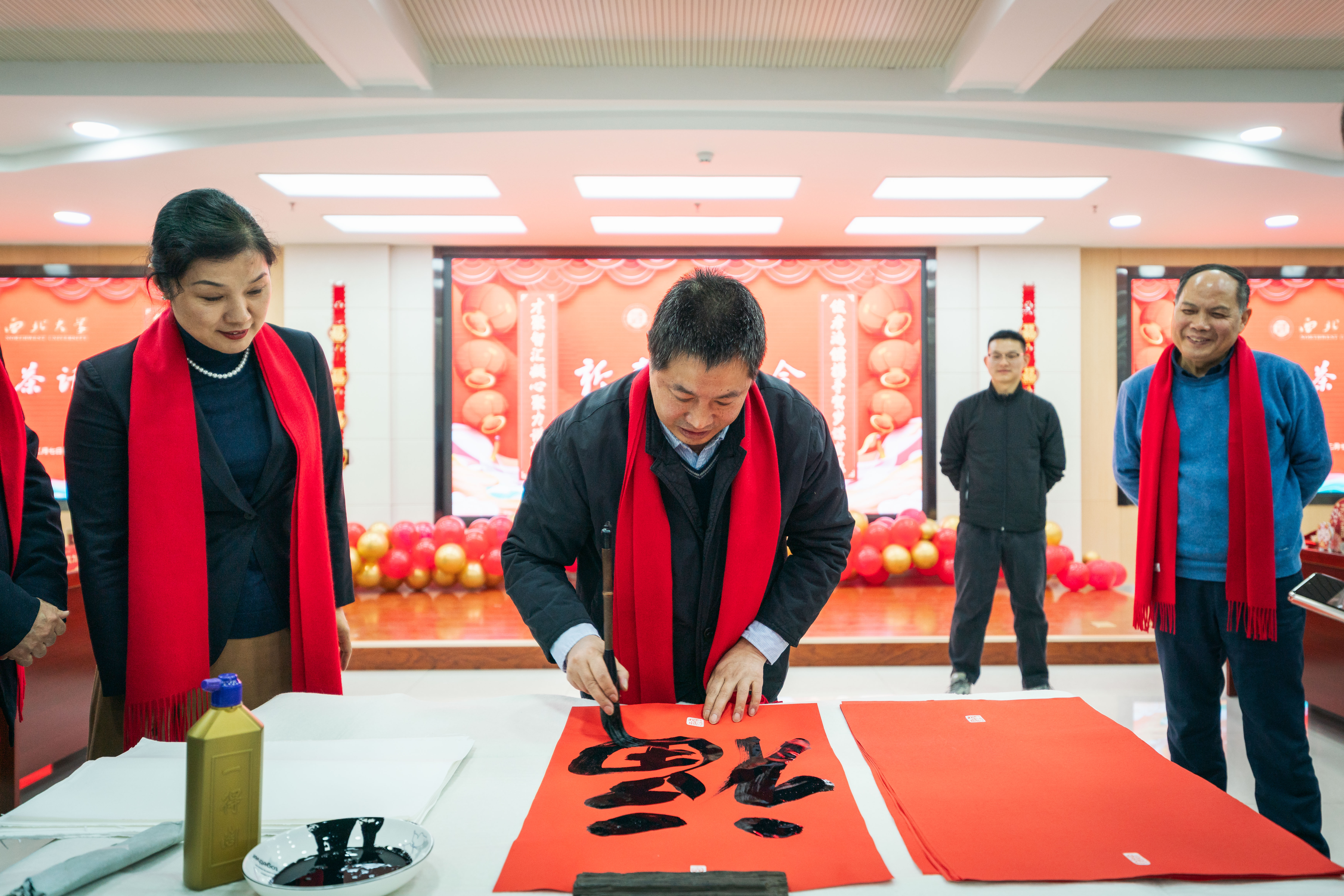 会场上始终充满着欢乐祥和的节日气氛,艺术学院岳峰老师在现场为大家挥毫,书赠“福”字,用书法作品向大家送上新春的美好祝愿。(图/塔力)