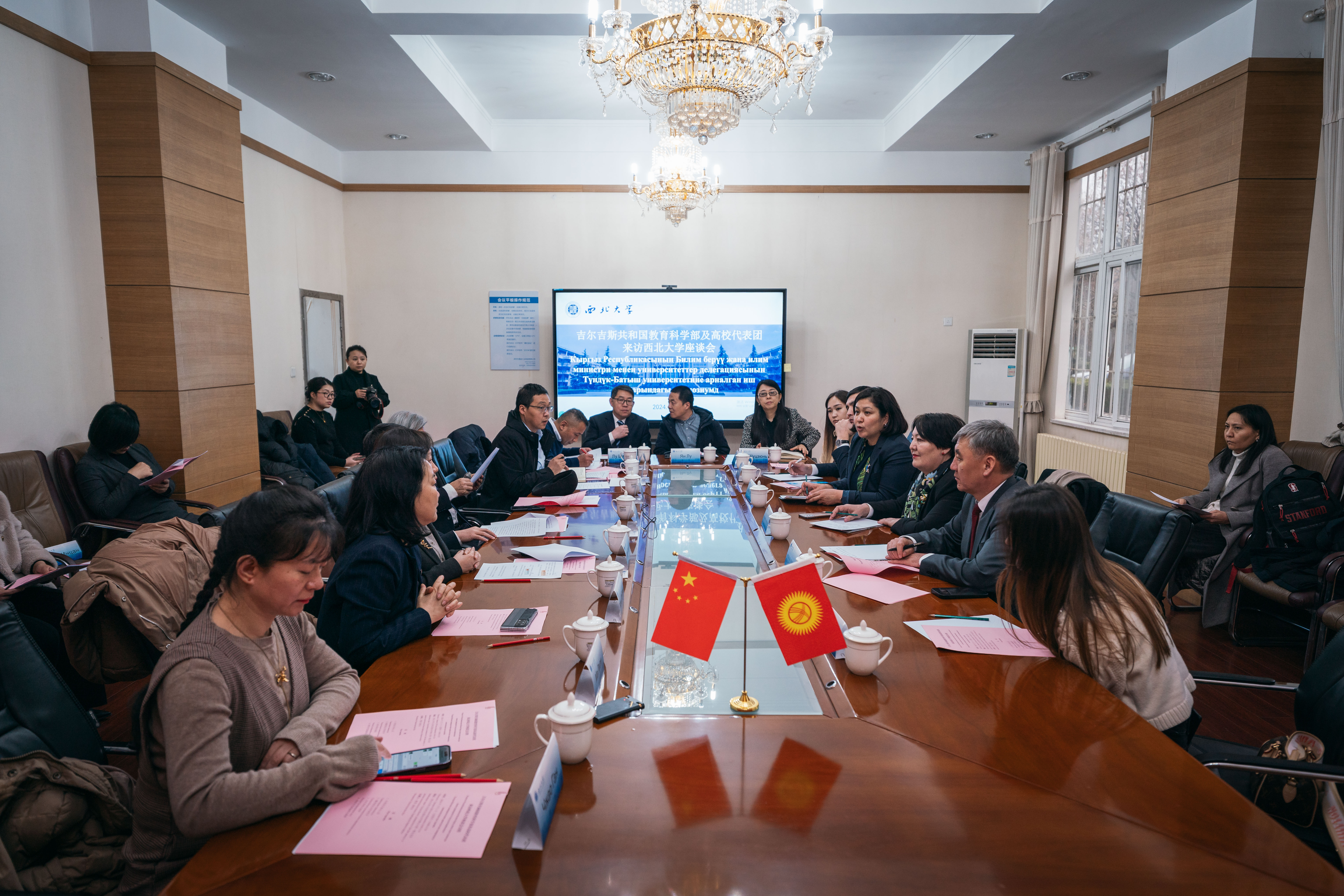 在交流环节,科技处、经济管理学院、文化遗产学院、新闻与传播学院、医学院、丝绸之路考古合作研究中心、丝绸之路研究院、中亚研究院相关负责人与奥什国立大学、拉扎科夫国立技术大学、比什凯克国立大学校长围绕考古、经济、医学、新媒体技术、信息科学等合作方向进行了交流与探讨,希望未来能够在多领域多学科开展人才联合培养、科研合作、师生交流互访等校际交流合作项目。