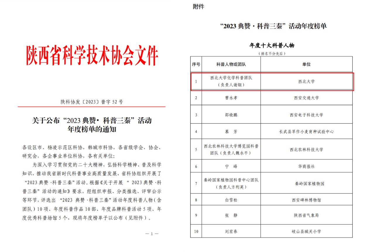 12月28日,“2023典赞·科普三秦”发布盛典在西安举办,现场揭晓了陕西省2023年度十大科普人物、年度十大科普作品、年度优秀科普场馆和年度品牌科普活动。乐鱼网页版页面登录化学科普团队入选年度十大科普人物(团队),团队负责人为谢钢教授。
