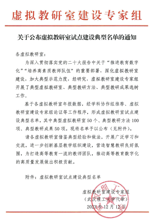 日前,虚拟教研室建设专家组公布了虚拟教研室试点建设典型名单,乐鱼网页版页面登录党委常委、副校长赖绍聪教授负责的“‘互联网+’与‘智能+’融合探索拔尖人才培养改革创新”案例入选典型教研方法。这一成绩是对地质学拔尖学生培养模式研究虚拟教研室创新基层教学组织建设、营造智慧教研良好氛围、促进人才培养质量提升的肯定。